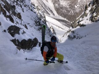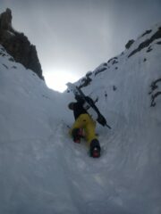 Crosta non portante per tutto l’itinerario, canale quasi tutto svalangato, per fortuna con palle morbide. Ultima parte magrissima (passa una tavola), laterale poca neve densa che poggia su roccia.