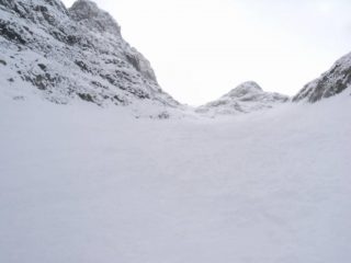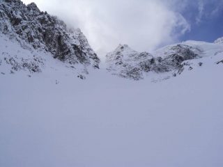 aumenta sempre più lo spessore, appena sotto la diramazione verso dx sfondo fino alla pancia e sono costretto a tornare indietro, fantastica neve profonda che ti permette di tutto! non fossi stato da solo a battere si sarebbe usciti dalla diretta, al fondo del canale ho incontrato tre francesi sulle mie tracce, pazienza