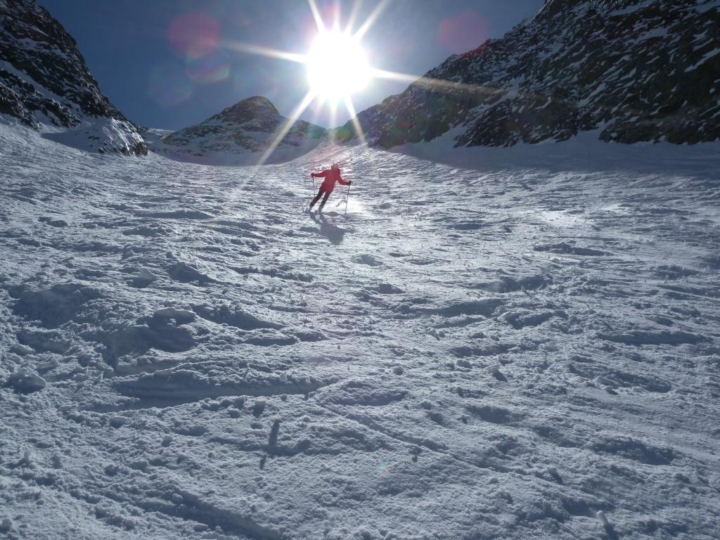 Canale in ottime condizioni, oggi sciabile in tranquillità. Solo i primi metri con neve un po dura, poi farina compressa fino in fondo. L’uscita a destra con ghiaccio vivo (e pietre).