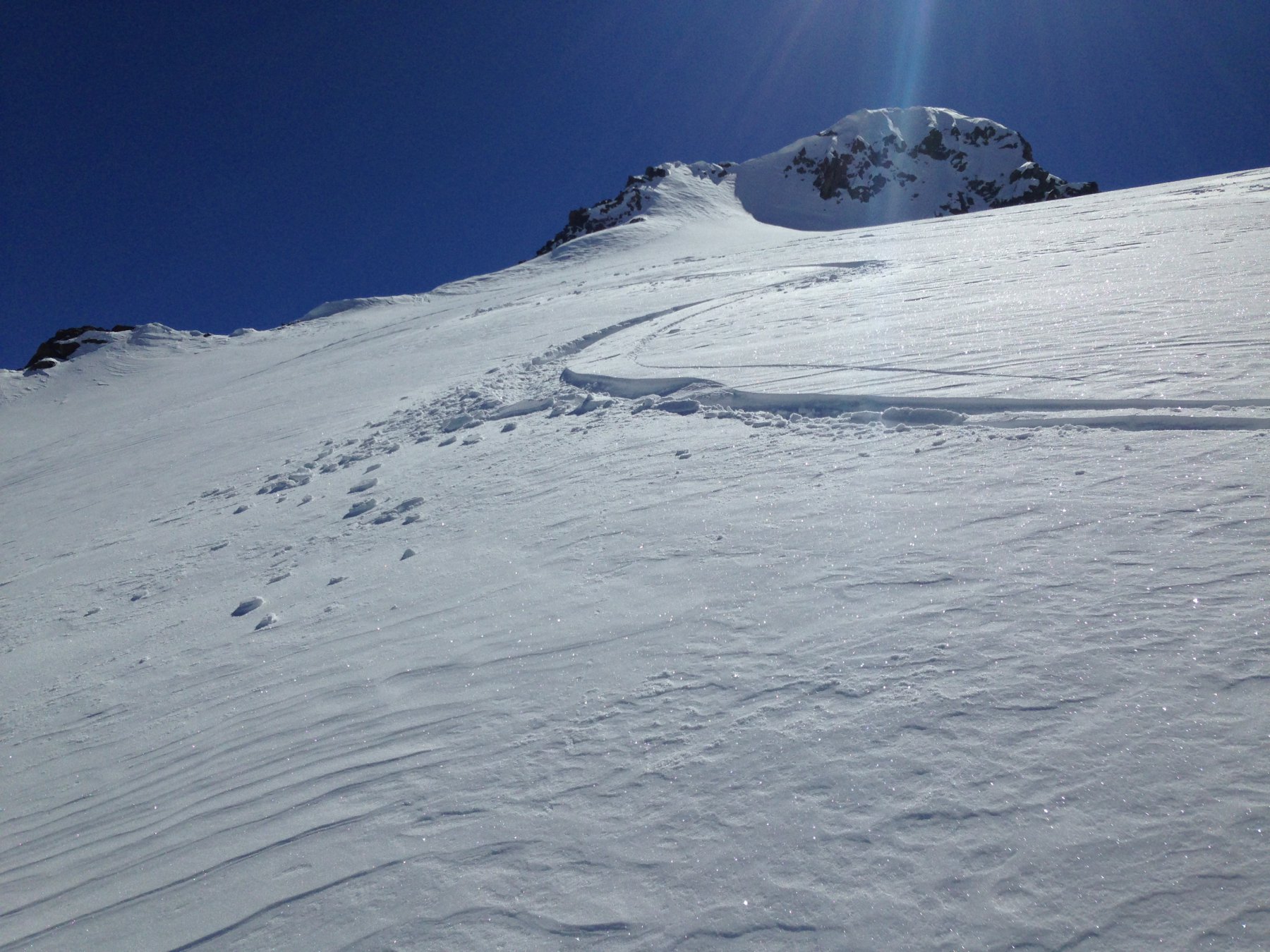 Partenza ore 8. Portage sino a fuori dal bosco, dopo buon rigelo e sci a spalle sino al conoide. Risalita veloce sino a 100 mt. Sotto la strettoia dell’uscita diretta. Di lì in poi tracciato in alcuni tratti con neve sino alla coscia.