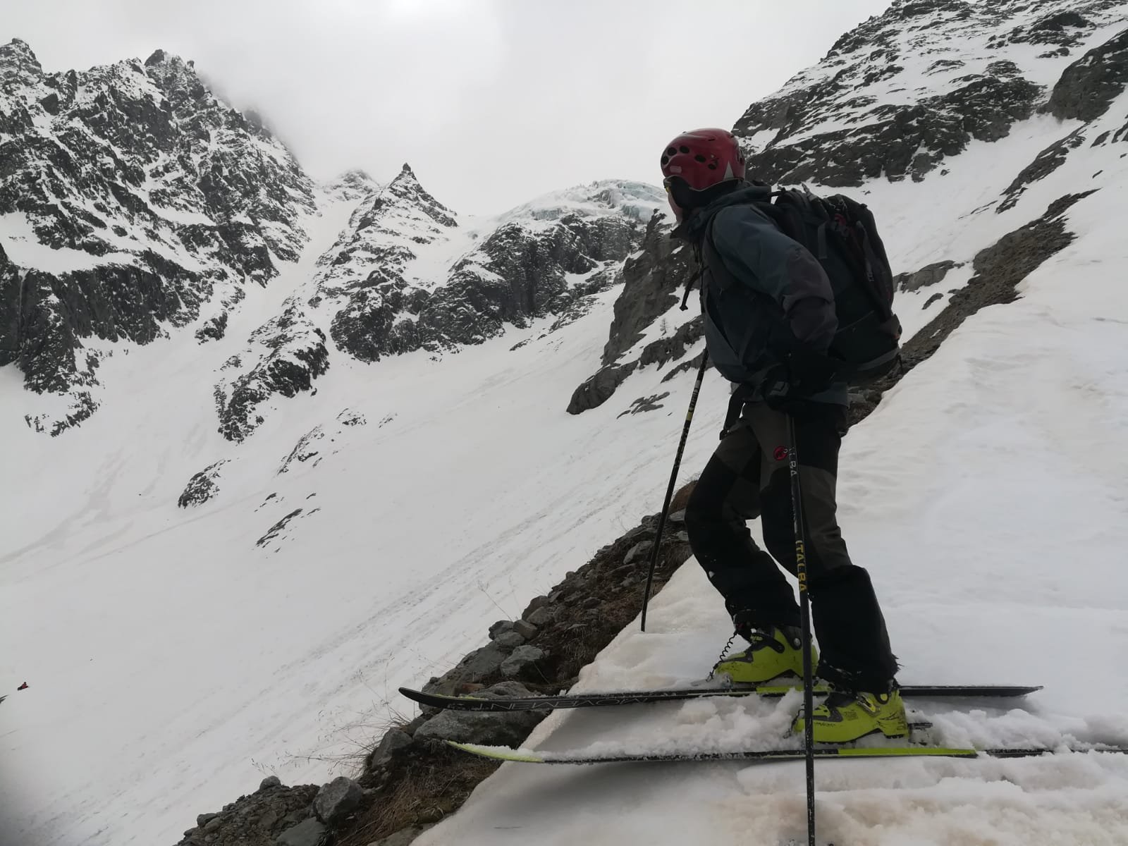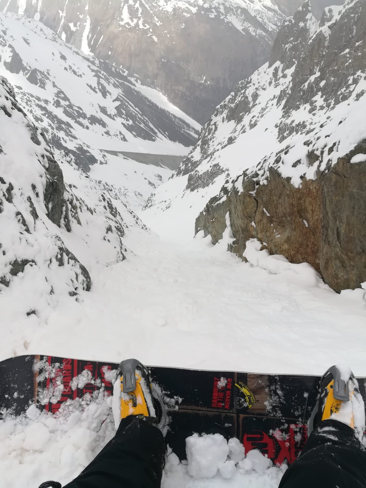 Viste le previsioni abbiamo optato per un canale, e che canale. Arrivati con la macchina al ponte a q. 1581 (ci sarebbe un divieto, ma neanche i francesi lo rispettano), da lì sci in spalla fino alla deviazione a sx (in discesa sci ai piedi fino a 10′ dall’auto). Raggiunti altri 4 skialper all’imbocco del canale, il mio socio ha cominciato a tracciare fino in cima. Abbiamo optato per l’uscita di dx (orografica), sia perchè vergine e sia perchè più “interessante”. Unico neo la mancanza di visibilità dopo la strettoia. Discesa con neve che quasi faceva dimenticare le pendenze (vedi foto). Al termine del conoide traverso verso sx per superare la morena (spelata) e guadagnare uno splendido pendio ancora non svalangato. Rientro tra i rami nel bosco. Con Giorgio (splitboard).