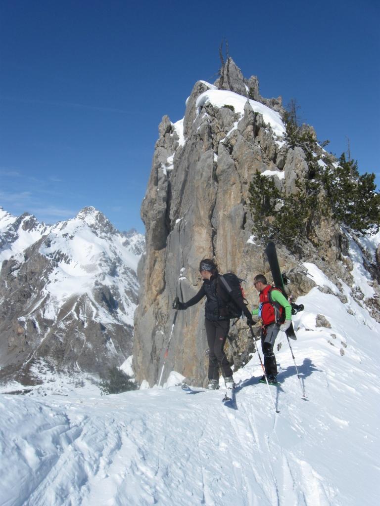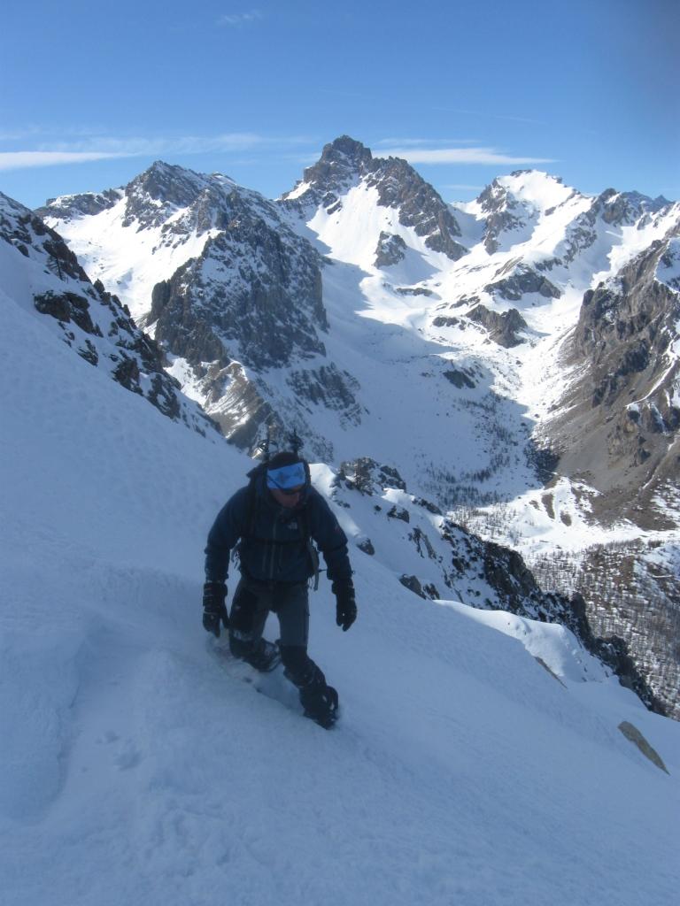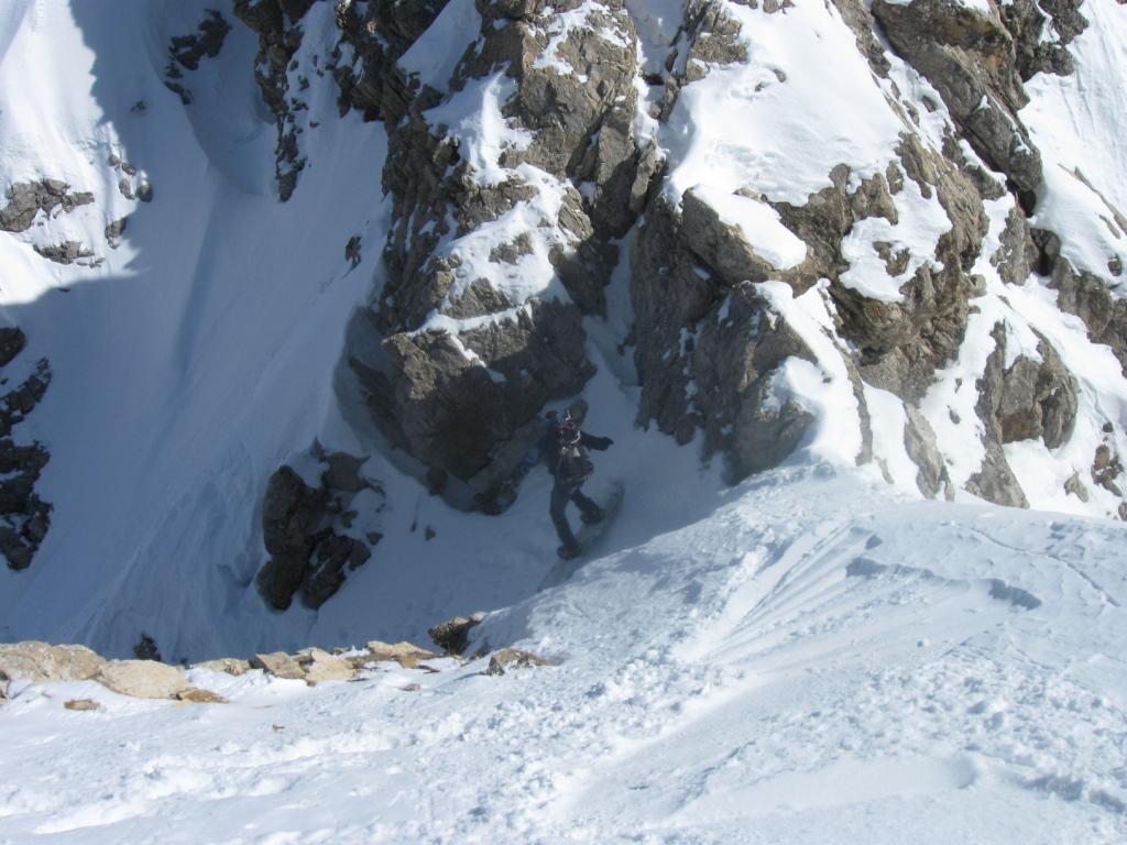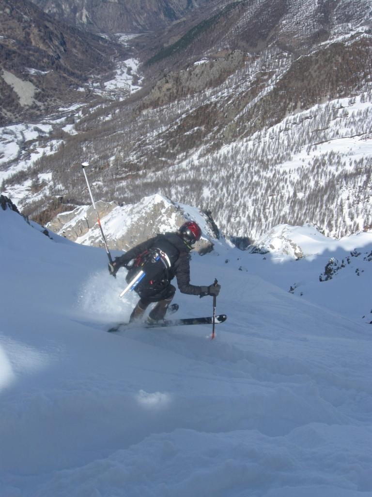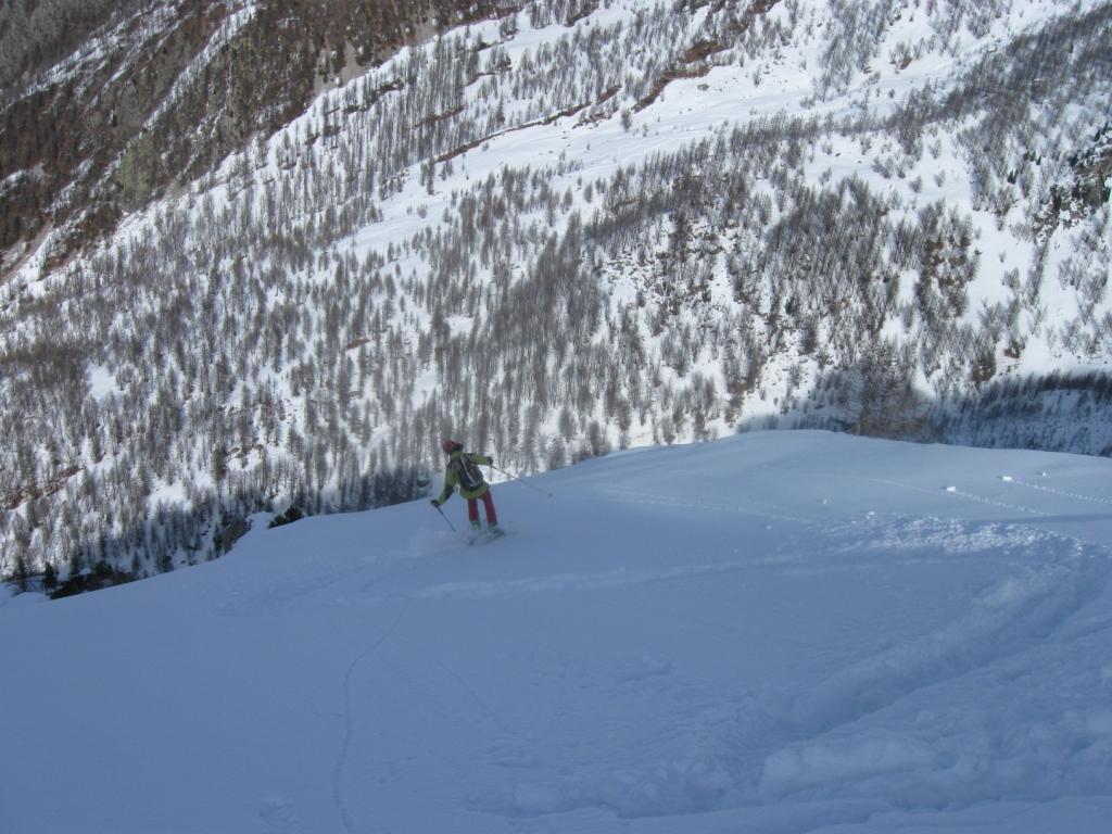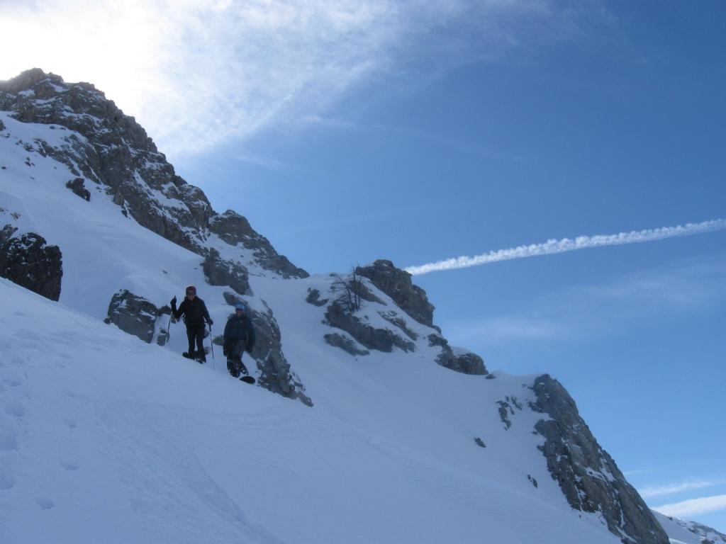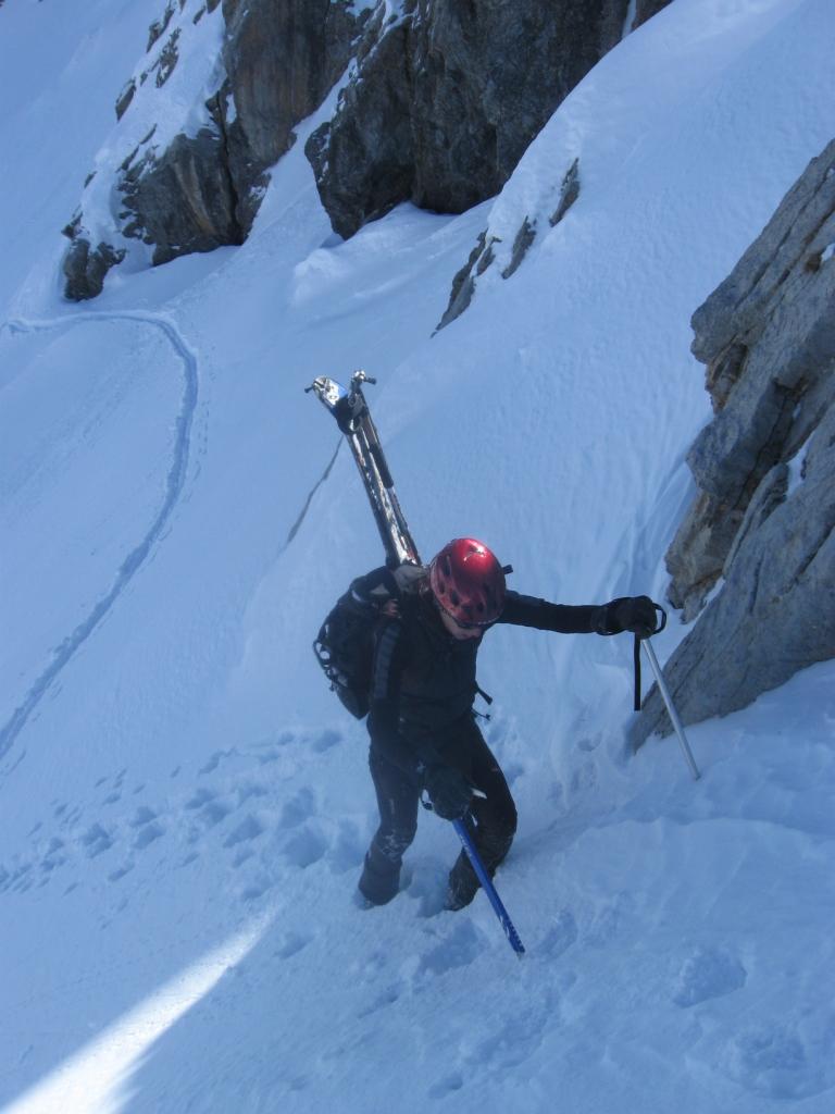 Il percorso sfrutta una lunga, esposta e contropendente cengia che necessita di neve molto ben assestata.