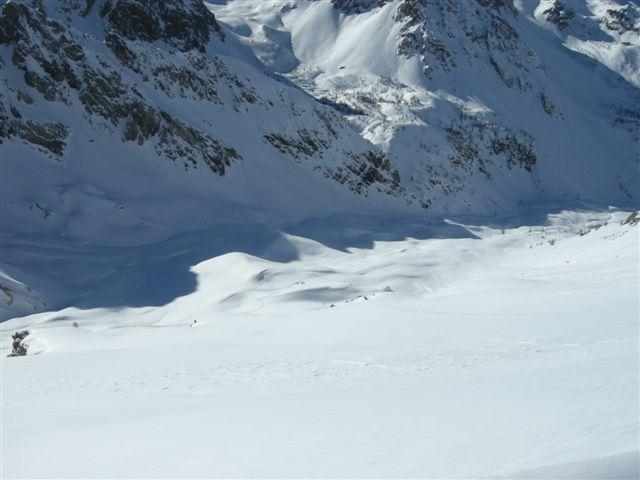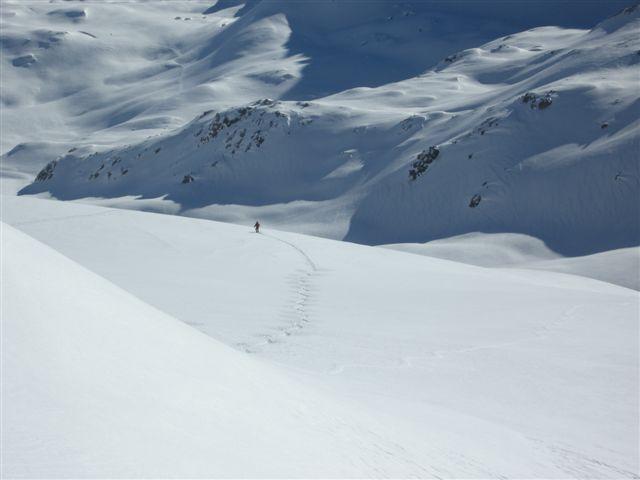 ambiente immacolato neve Sontuosa nei pendii a nord ancora spazi vergini, qualche leggera crosticina come del pane croccante, gli abbiamo dato una bella spazzolata ma tutti i pendii ovest e nodovest intorno e nella parte alta ancora da lavorare oggi i Geki con Pinguine incollate allle pelli