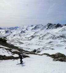 Lasciato macchina presso il tornante appena sotto il bivio per il Colle Ciarbonet. Si cammina per un quarto d’ora circa, poi si riescono a mettere gli sci. In corrispondenza del pilone votivo all’inizio di Prato Ciorliero bisogna togliere gli sci per qualche metro. La salita da li in poi è abbastanza al limite ma ancora fattibile, collegando le varie lingue di neve e facendo ogni tanto qualche metro sull’erba. Saliti tenendosi nel vallone a sx (dx orografica). Una volta giunti al colletto, in salita manca neve per una trentina di metri: non ci si deve scoraggiare, dopo la neve è continua fino in cima. Discesa su neve portante e liscia, abbastanza piacevole a parte i metti – togli che ogni tanto si rendono necessari. In discesa, dopo aver rimesso gli sci al pilone votivo, si riesce a scendere ancora un centinaio di metri, poi a piedi fino all’auto. Nel complesso di questi tempi non è stata una cattiva gita. Circa 850 mt dsl.