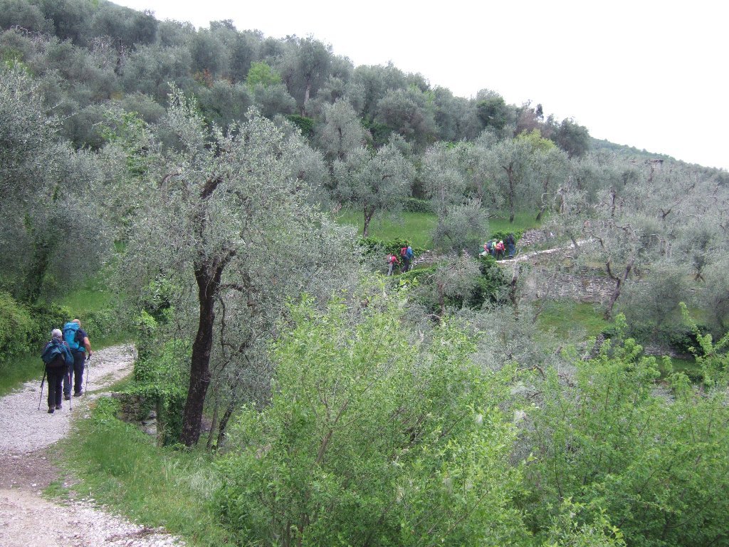 Dalla Piazzetta della Chiesa di Cassone si segue per un centinaio di metri la strada regionale (attenzione al traffico). Si trova il piccolo fiume Aril che sbocca nel lago dopo soli 175 metri dalla sorgente con una bella cascatella di notevole forza. Si risale ora una ripida strada asfaltata fino a trovare dopo circa 200 metri le indicazioni del sentiero 31. Dopo il passaggio sotto dei caratteristici volti in pietra, il sentiero costeggia dei terrazzamenti a ulivi per immettersi in una stradina. La si attraversa e da qui la mulattiera sempre larga e lastricata sale costantemente tra ulivi e campi terrazzati con sempre la vista sul lago e la sponda bresciana. Si trovano lungo il percorso dei borghi ora abbandonati e vari capitelli votivi, purtroppo in cattivo stato. Si possono notare i segni lasciati dalle ruote dei carri che per secoli hanno percorso questi sentieri. Si arriva alla chiesetta di S. Antonio delle Pontare mt 431 in un bel boschetto con fontana, panche e un ampio portico riparato. Da qui la mulattiera scende per un tratto molto ripidamente fino a una casa dopo si piega a sx e più dolcemente con vari saliscendi si giunge al borgo semi-abbandonato di Campo. C’è un progetto di ristrutturazione, ma per il momento solo due case sono abitabili. Da vedere la chiesetta del borgo, detta di San Pietro in Vincoli, che ospita affreschi del 13° secolo. Proseguiamo oltre il borgo e sempre per mulattiera scendiamo alla borgata Fazor e per un breve tratto asfaltato a Castelletto, altro paese lungo la gardesana.