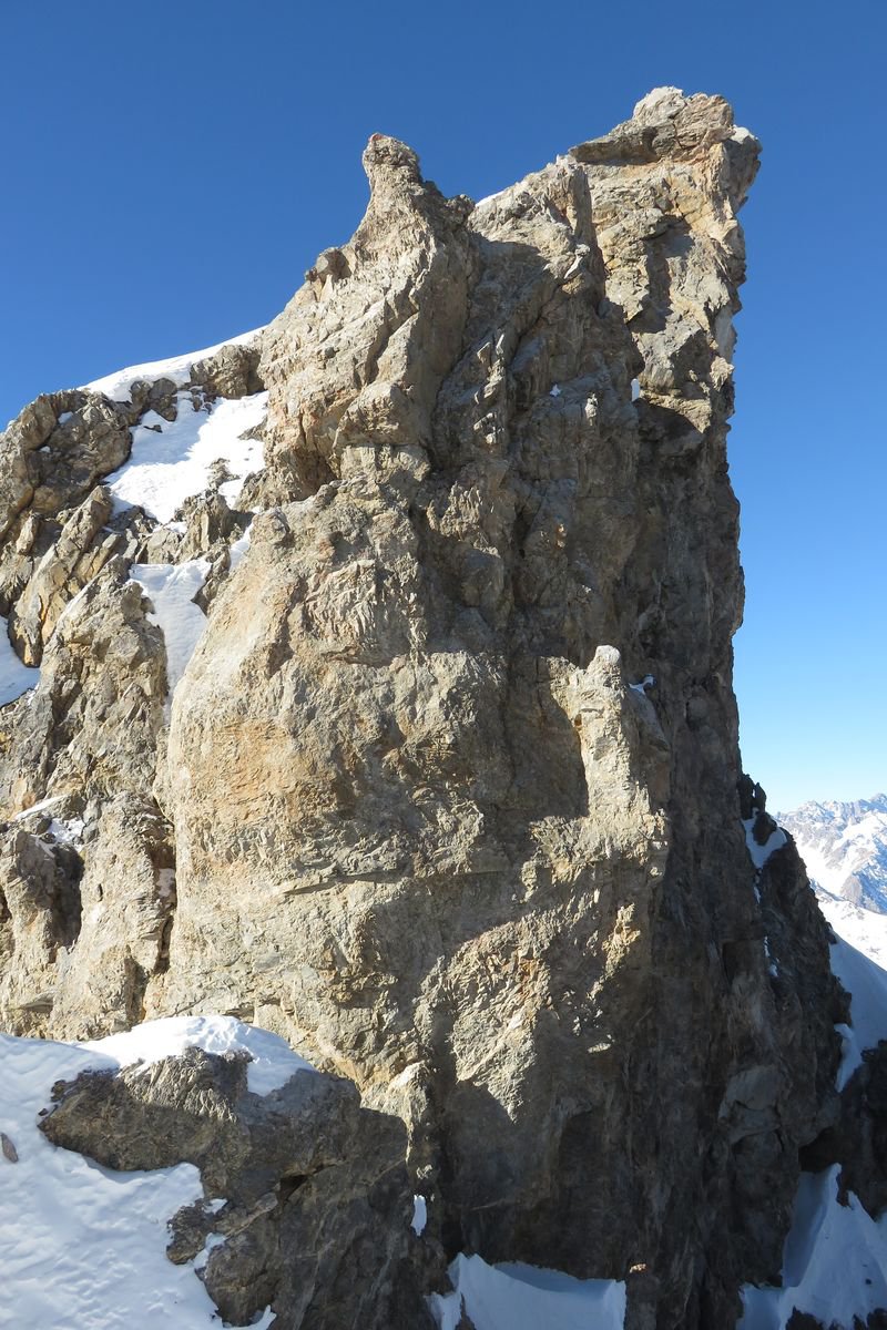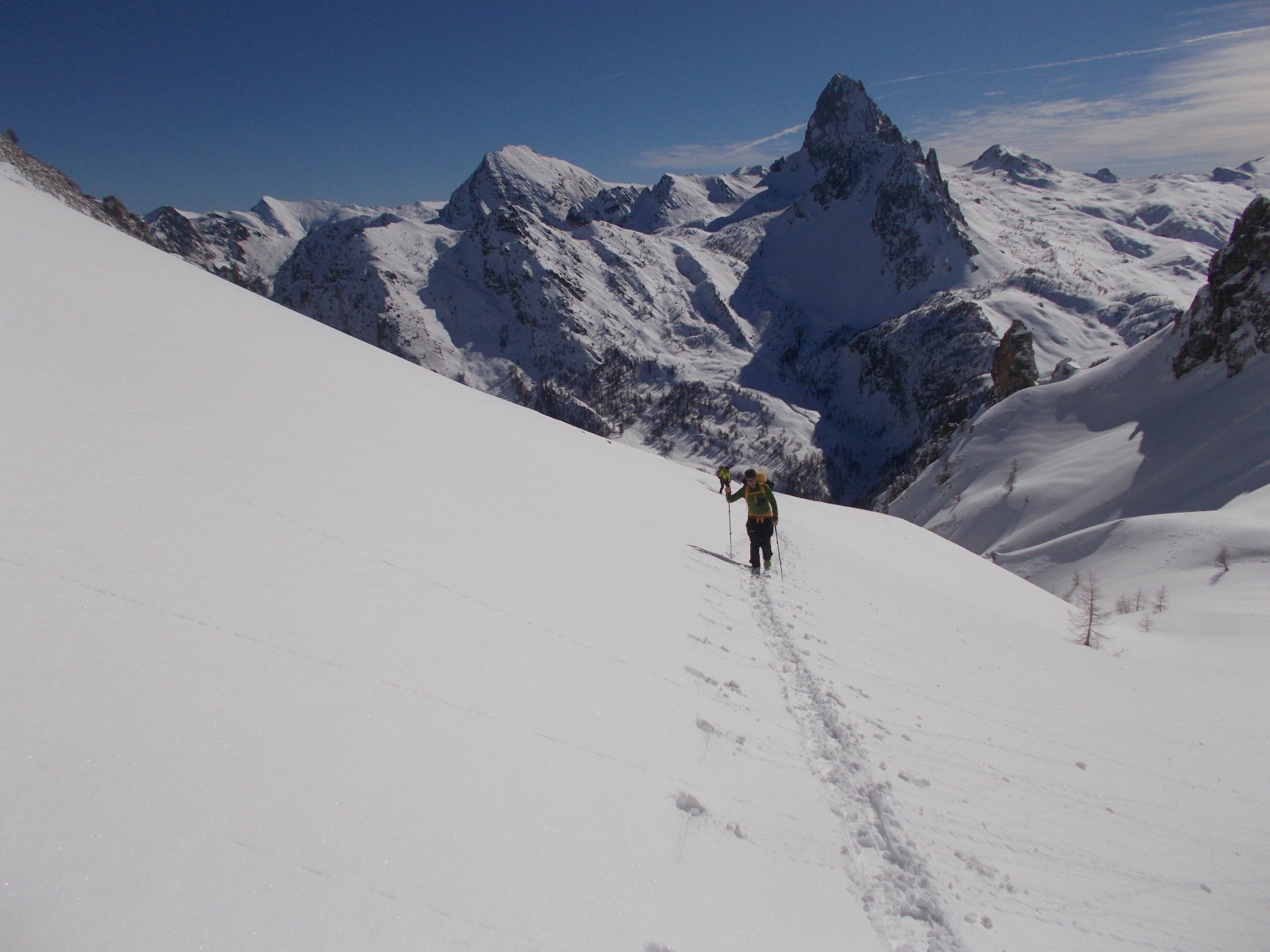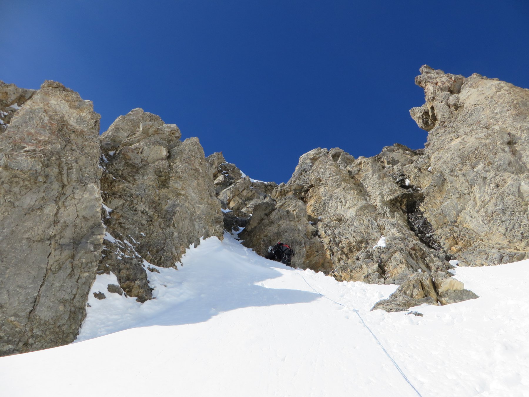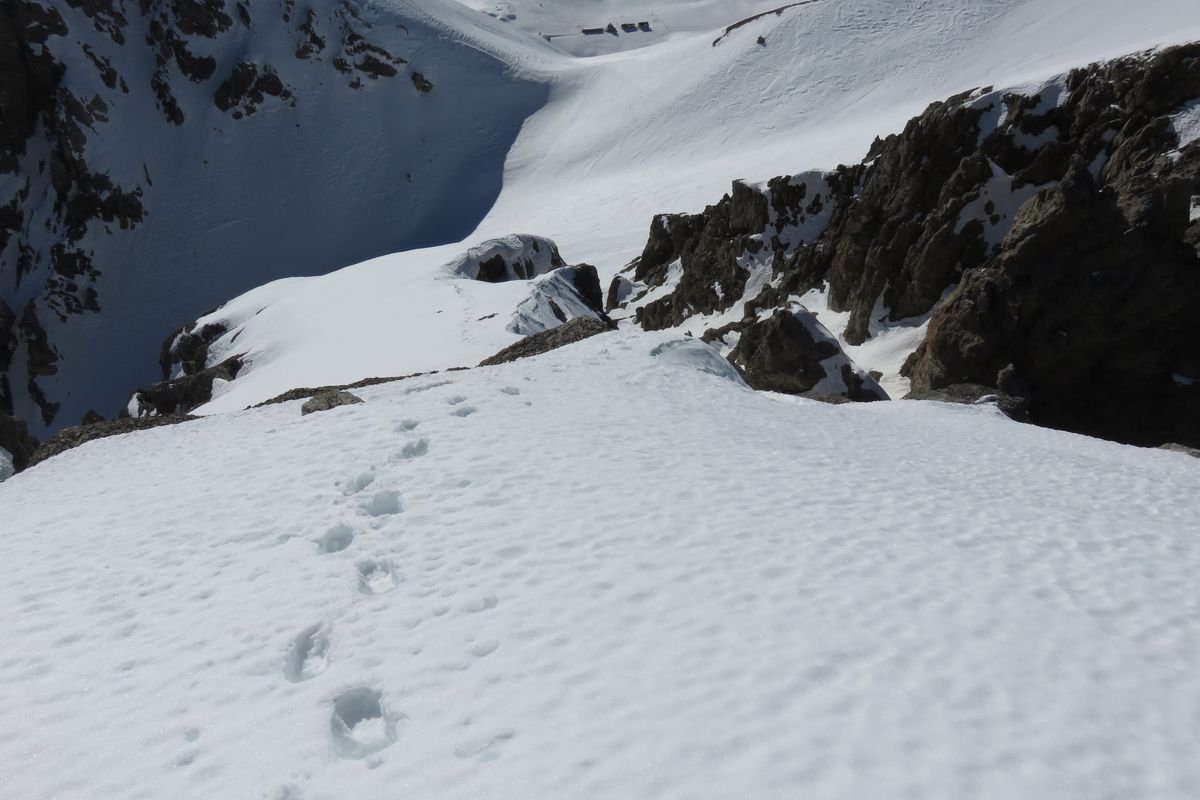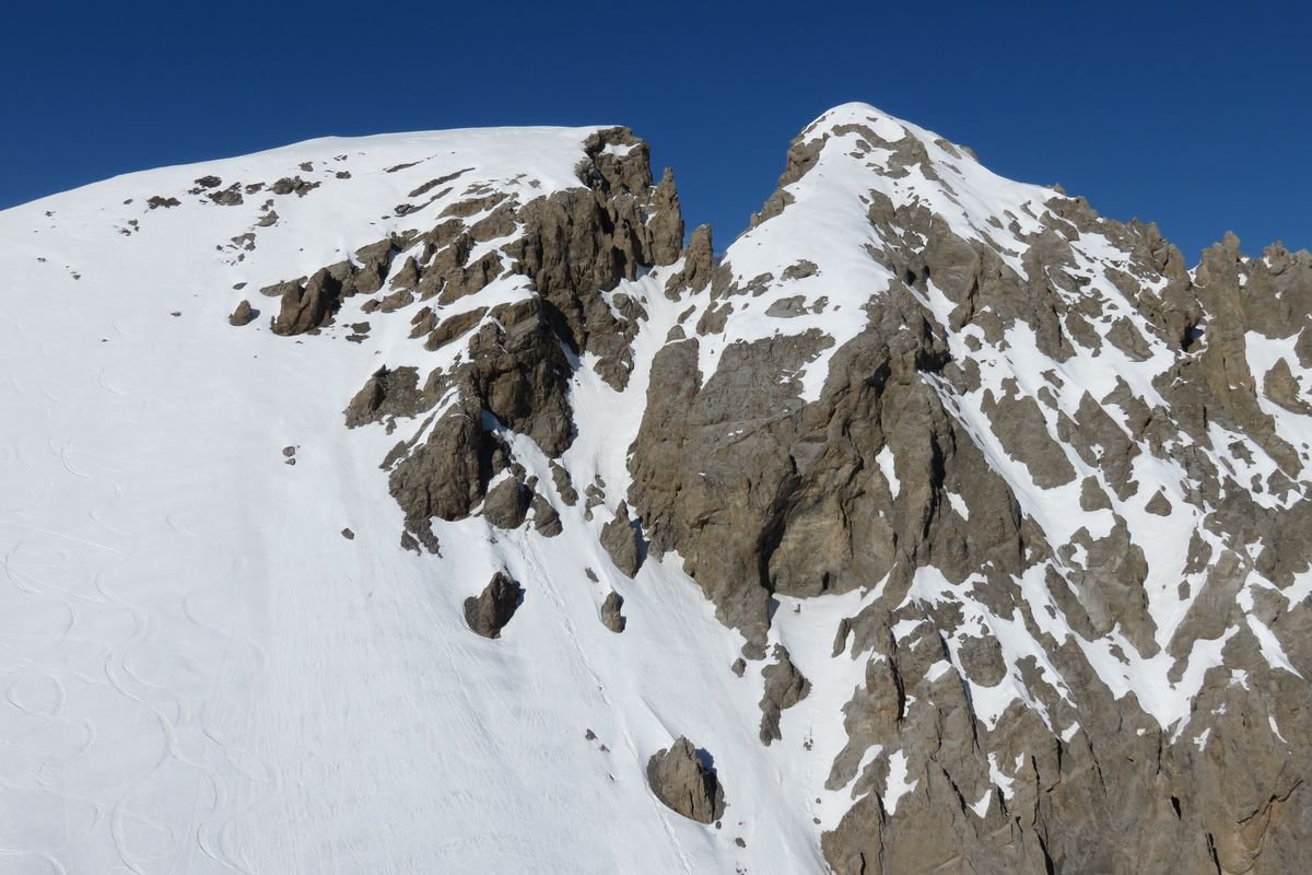 Qui risalire sulla dx una placca ripida ricoperta di neve (15 m, 45/50°) che conduce alla cresta sud della cima Est.