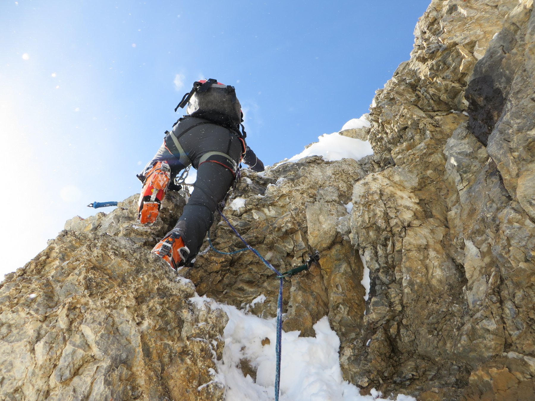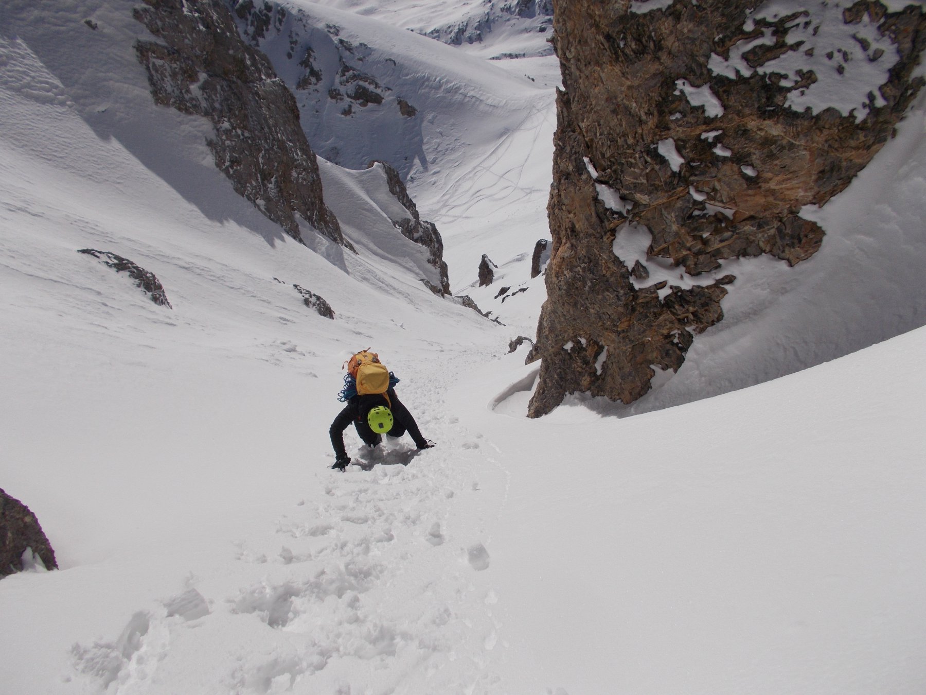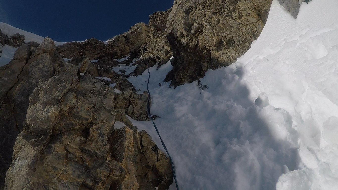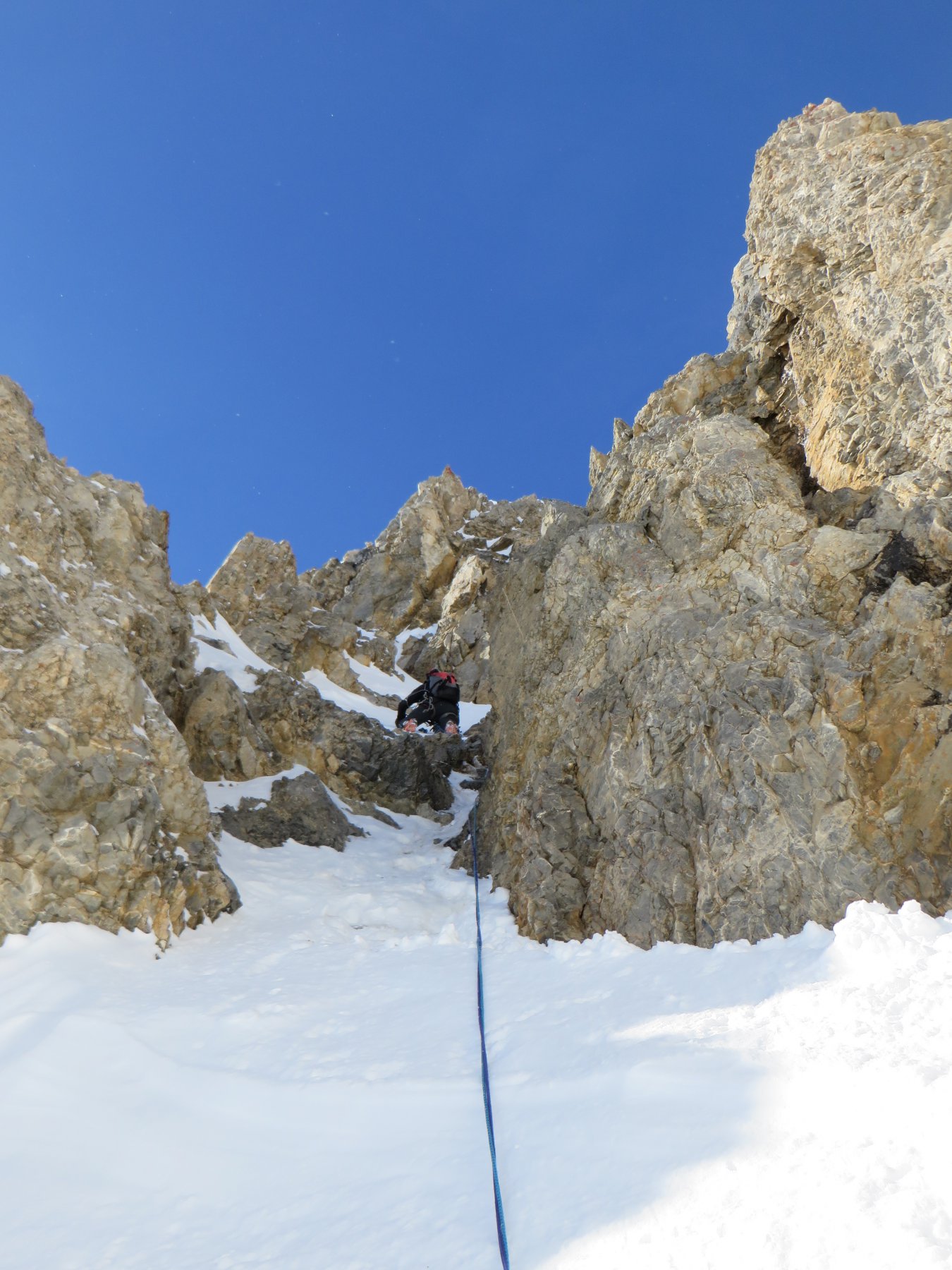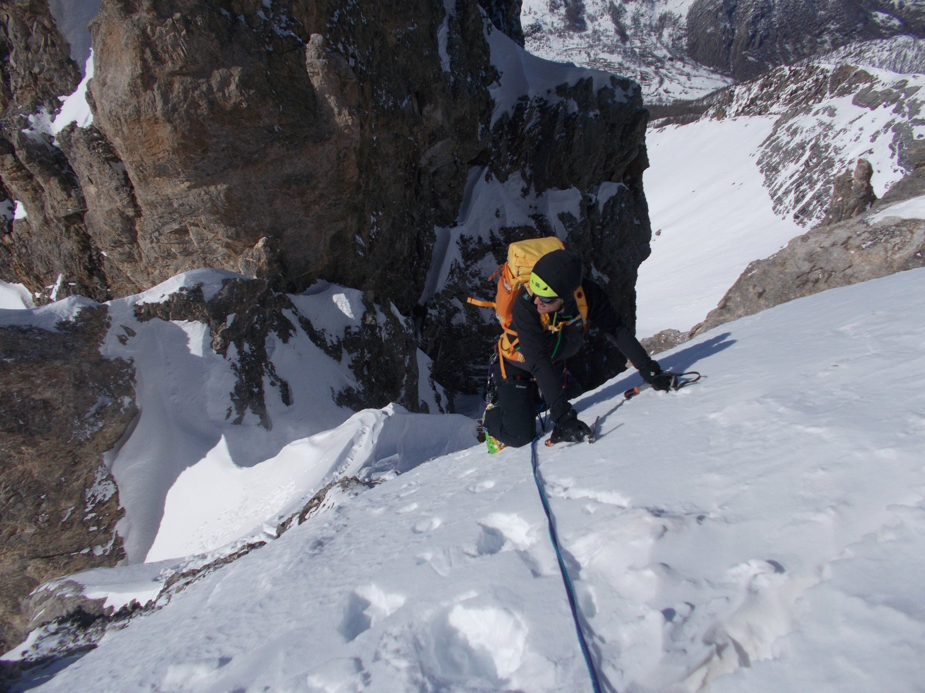 Qui risalire sulla dx una placca ripida ricoperta di neve (15 m, 45/50°) che conduce alla cresta sud della cima Est.