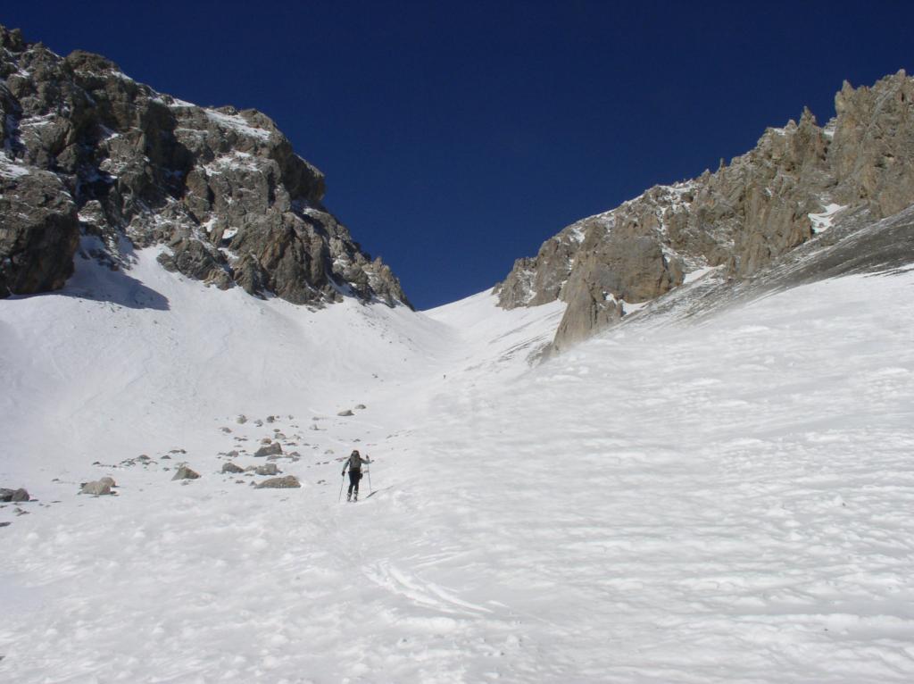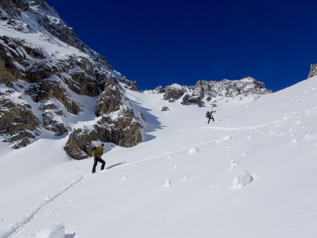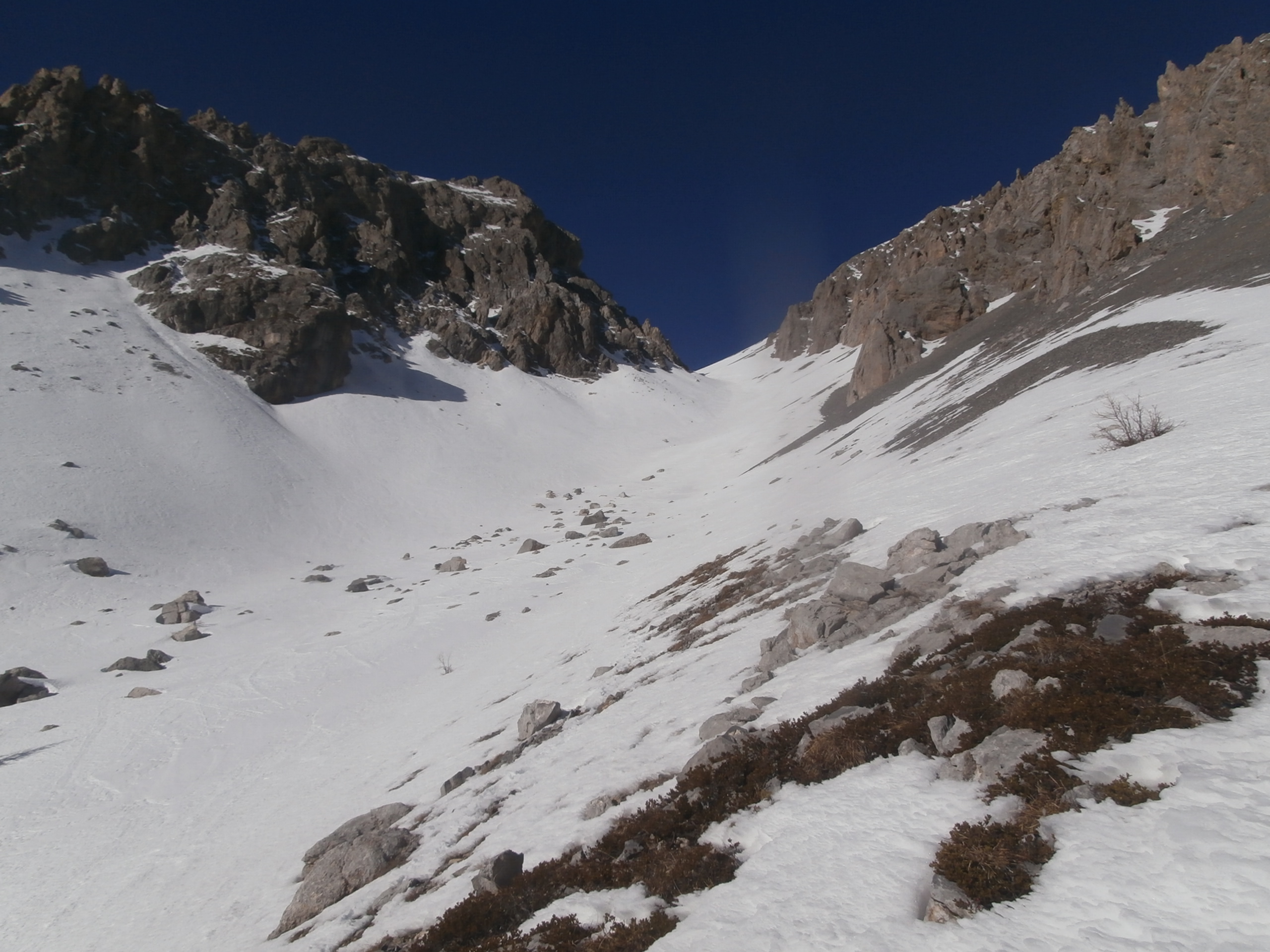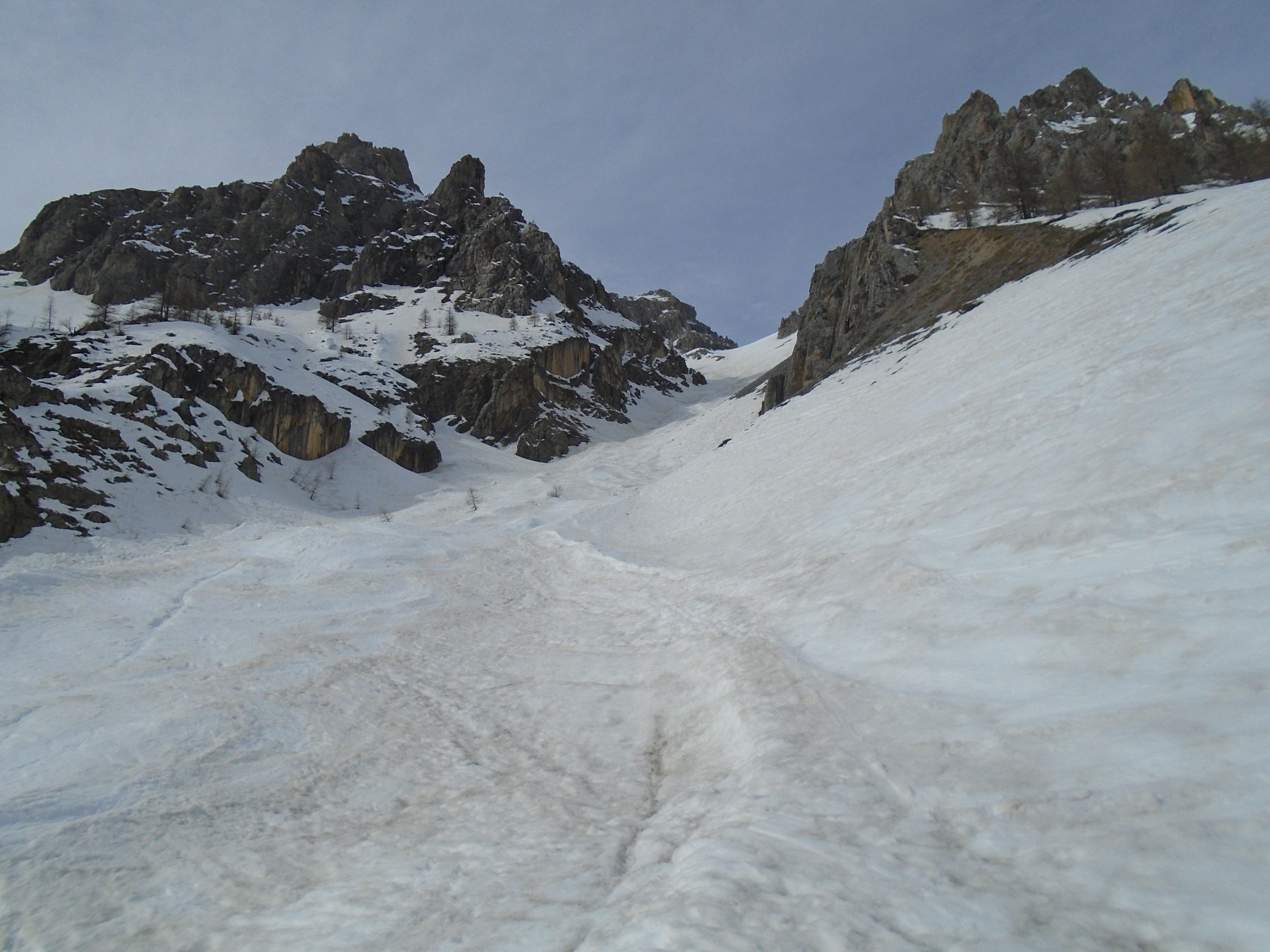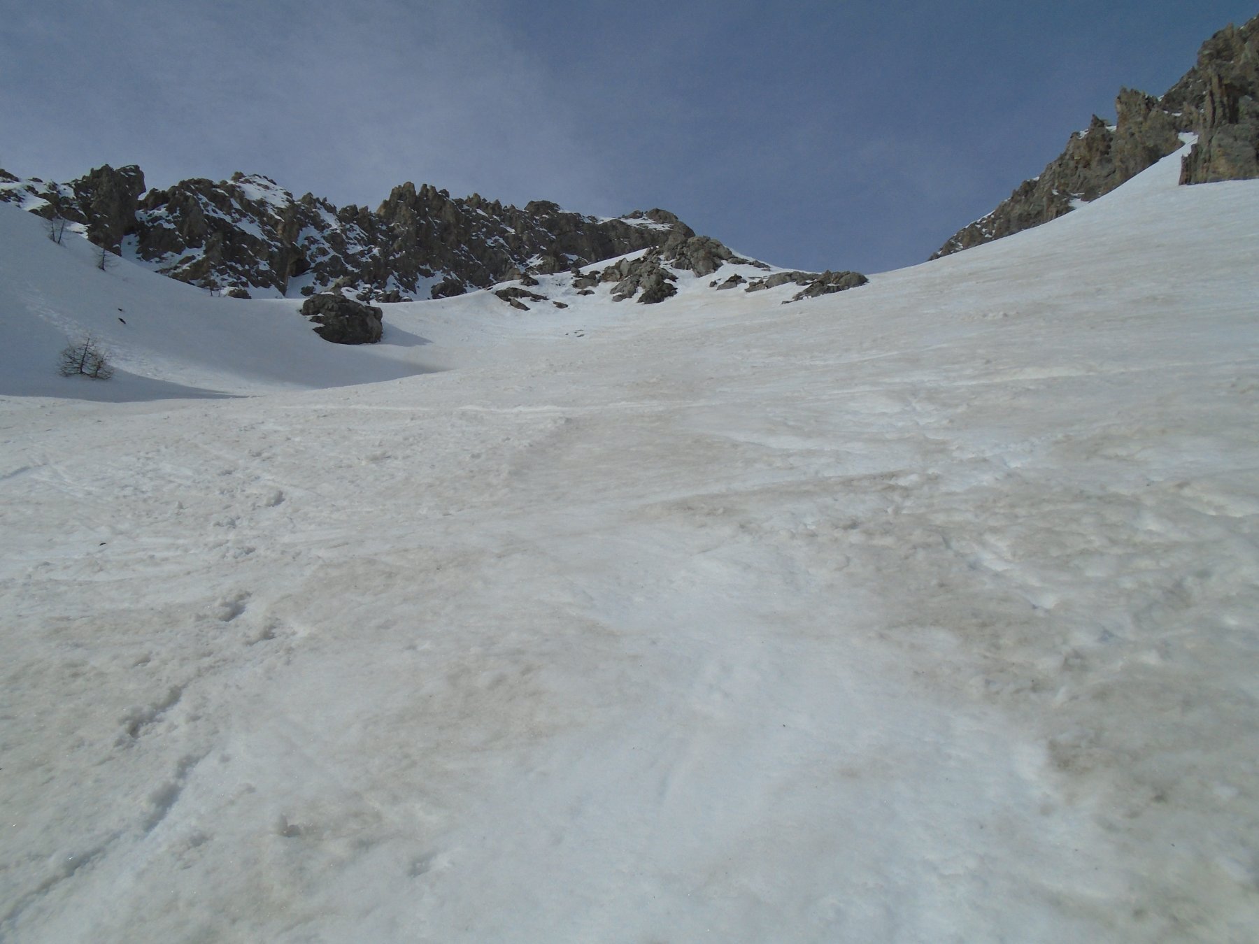 Il canale si presenta sempre piuttosto ampio, con pendenza costante tra 25-30° con qualche breve tratto superiore. E’ suddivisibile in tre parti intervallate da due brevi ripiani dove rifiatare. Dopo l’ultimo ripiano, una specie di avvallamento sotto il pendio sud della cima, si volge verso destra puntando ad una sella alla base della dorsale sud-ovest del Monte Cassorso. Percorrendola senza alcuna difficoltà, seppur abbastanza ripida, si perviene alla piatta cima ovest del Monte Cassorso.