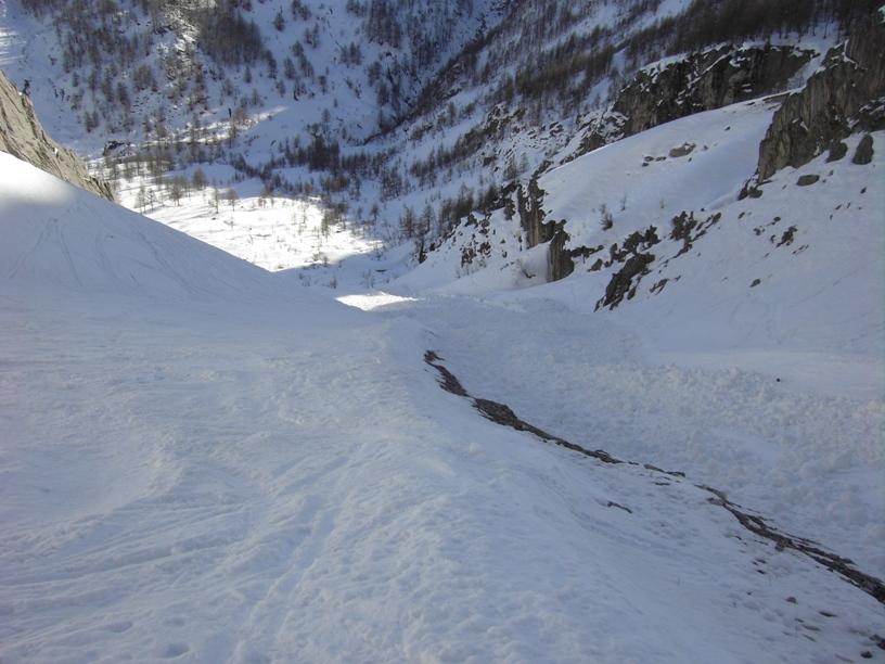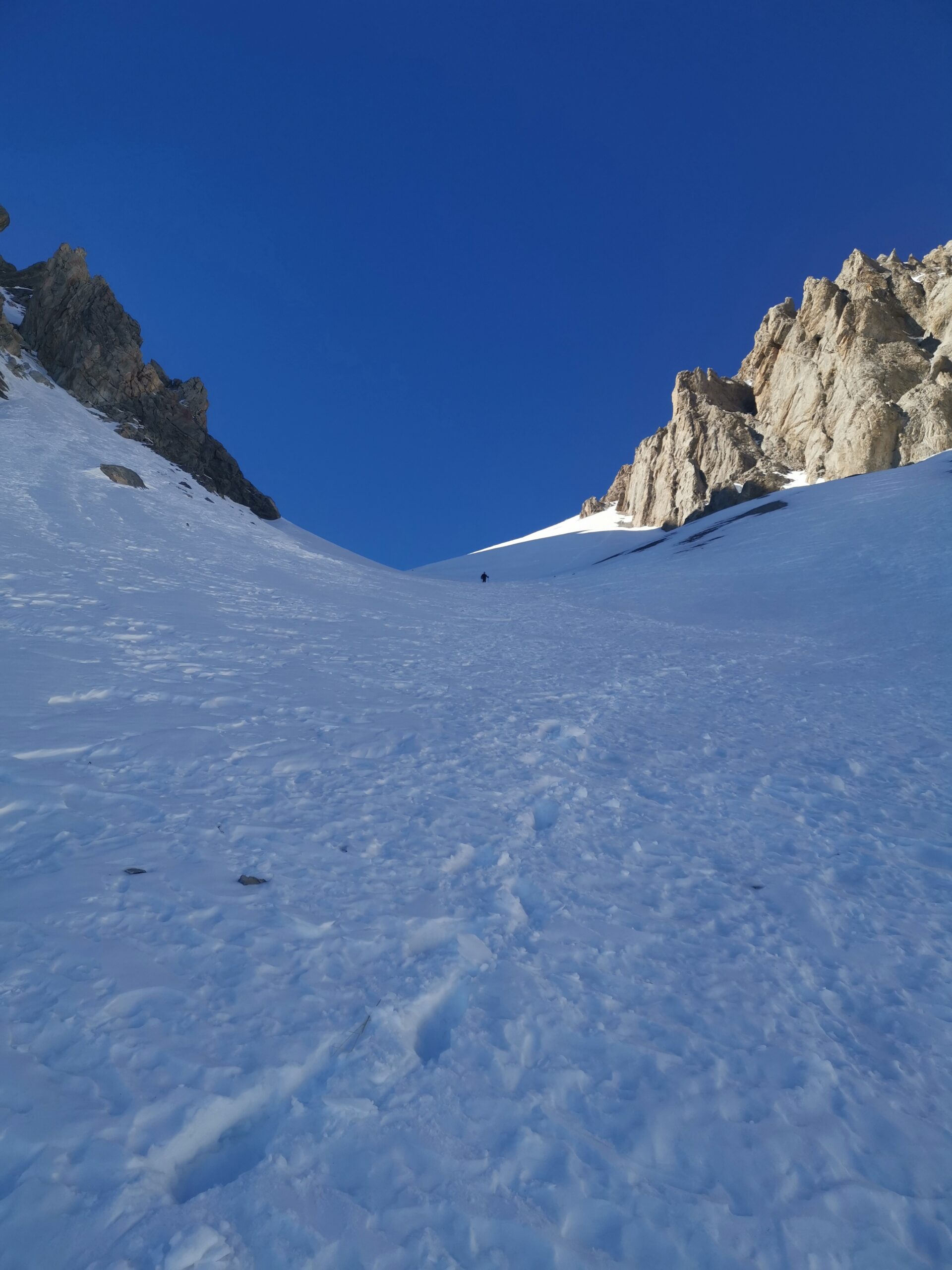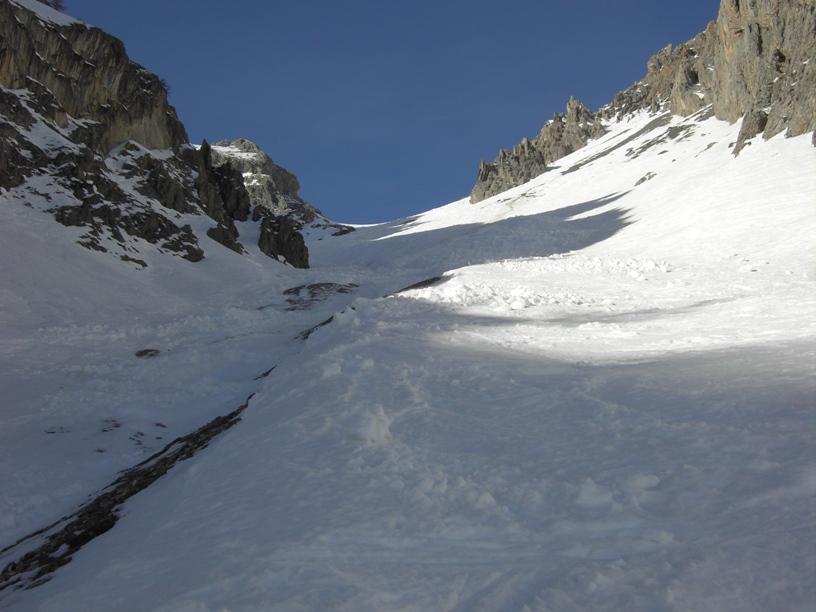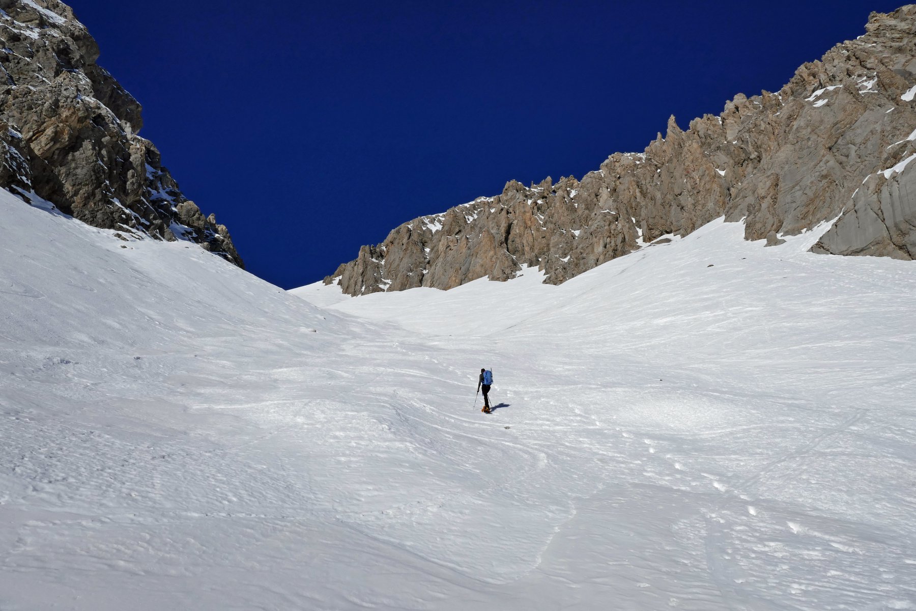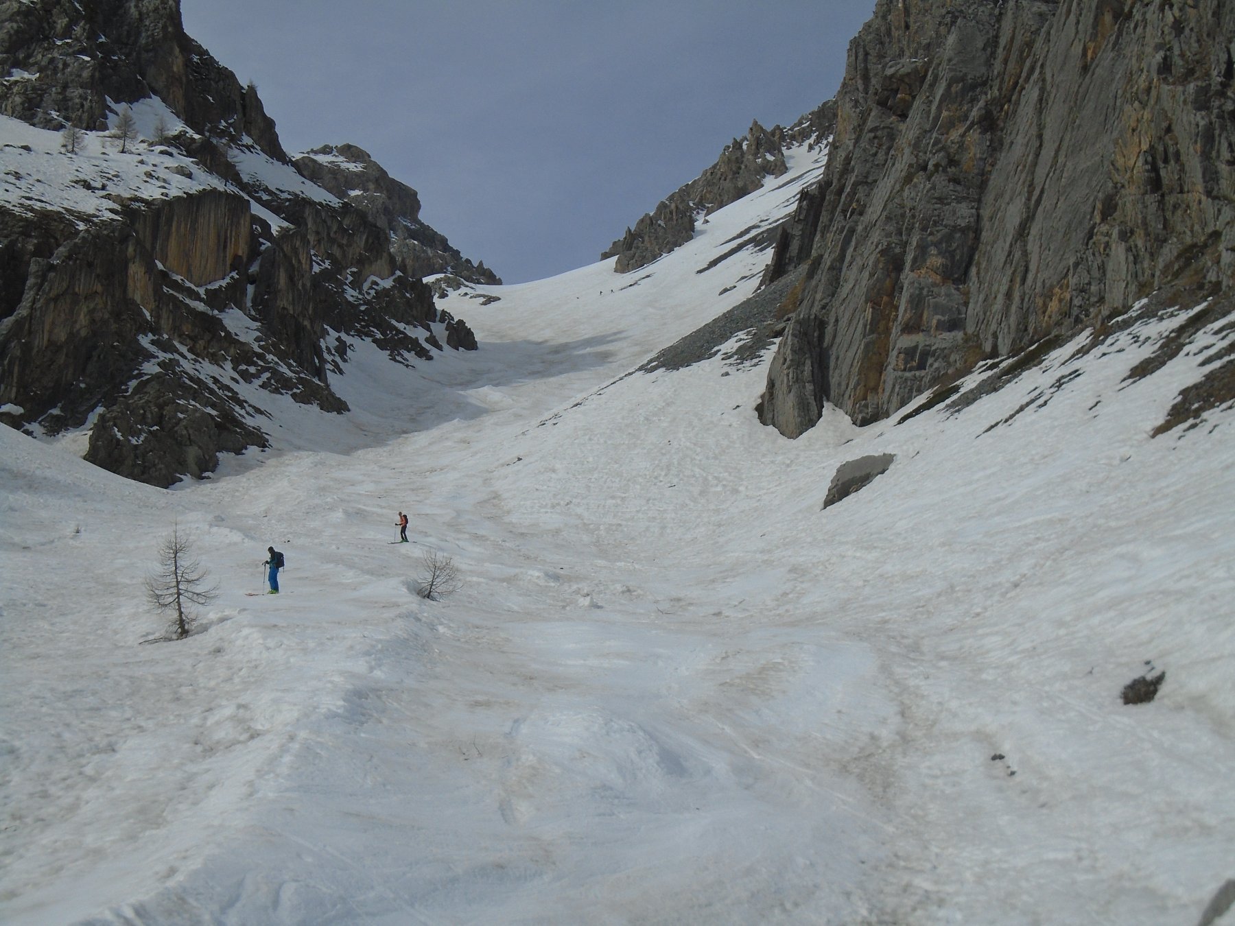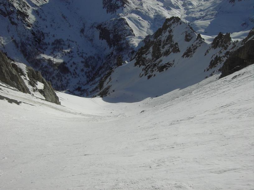 Il canale si presenta sempre piuttosto ampio, con pendenza costante tra 25-30° con qualche breve tratto superiore. E’ suddivisibile in tre parti intervallate da due brevi ripiani dove rifiatare. Dopo l’ultimo ripiano, una specie di avvallamento sotto il pendio sud della cima, si volge verso destra puntando ad una sella alla base della dorsale sud-ovest del Monte Cassorso. Percorrendola senza alcuna difficoltà, seppur abbastanza ripida, si perviene alla piatta cima ovest del Monte Cassorso.