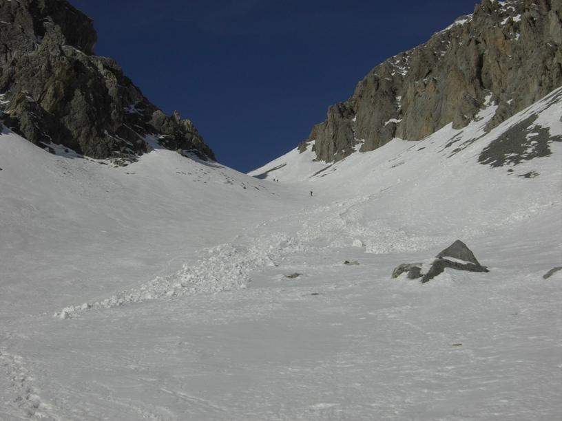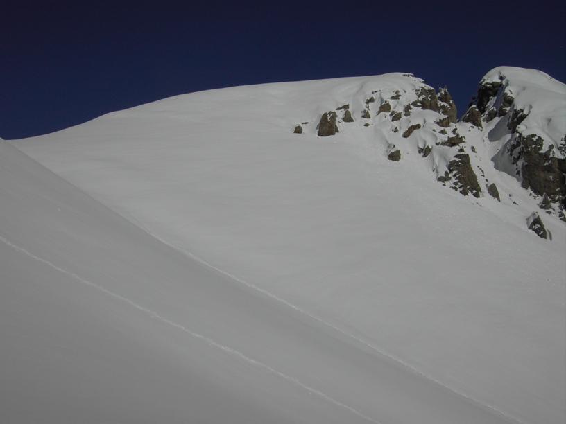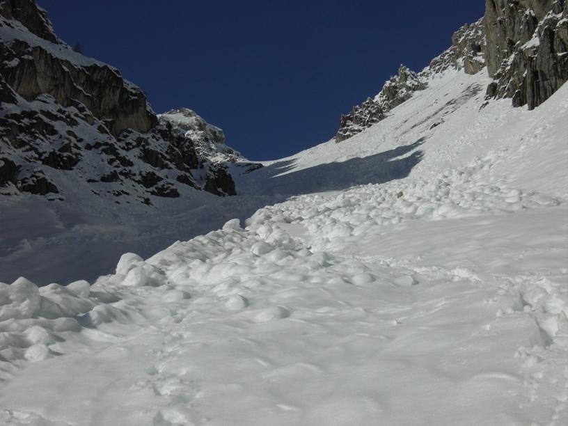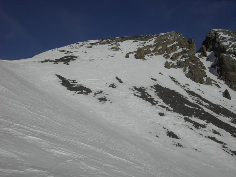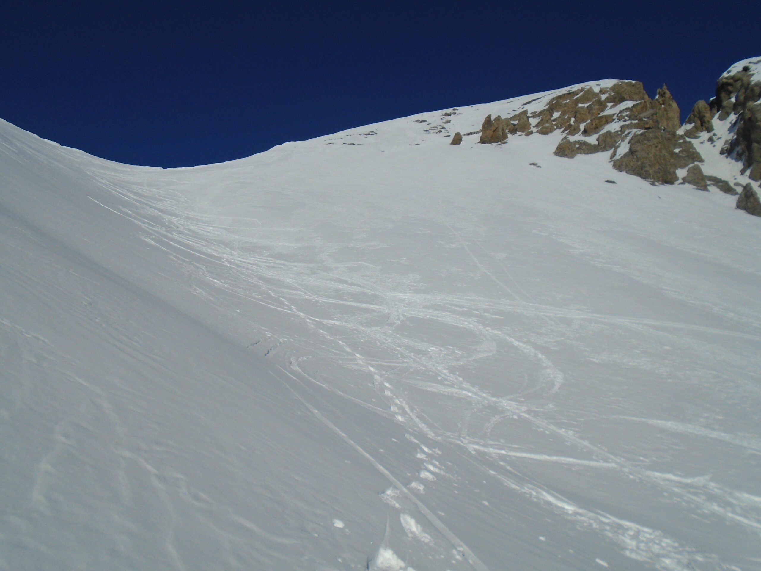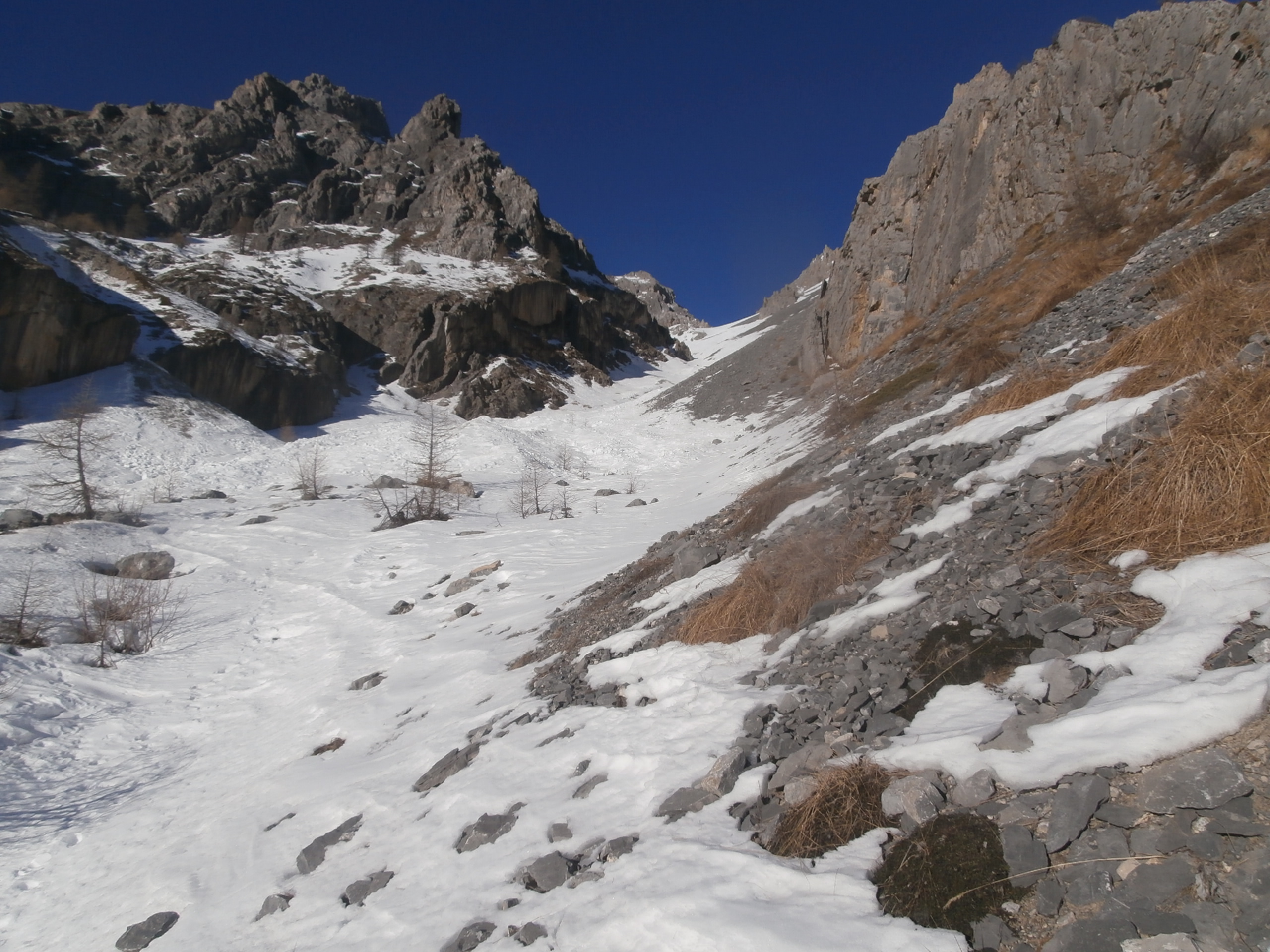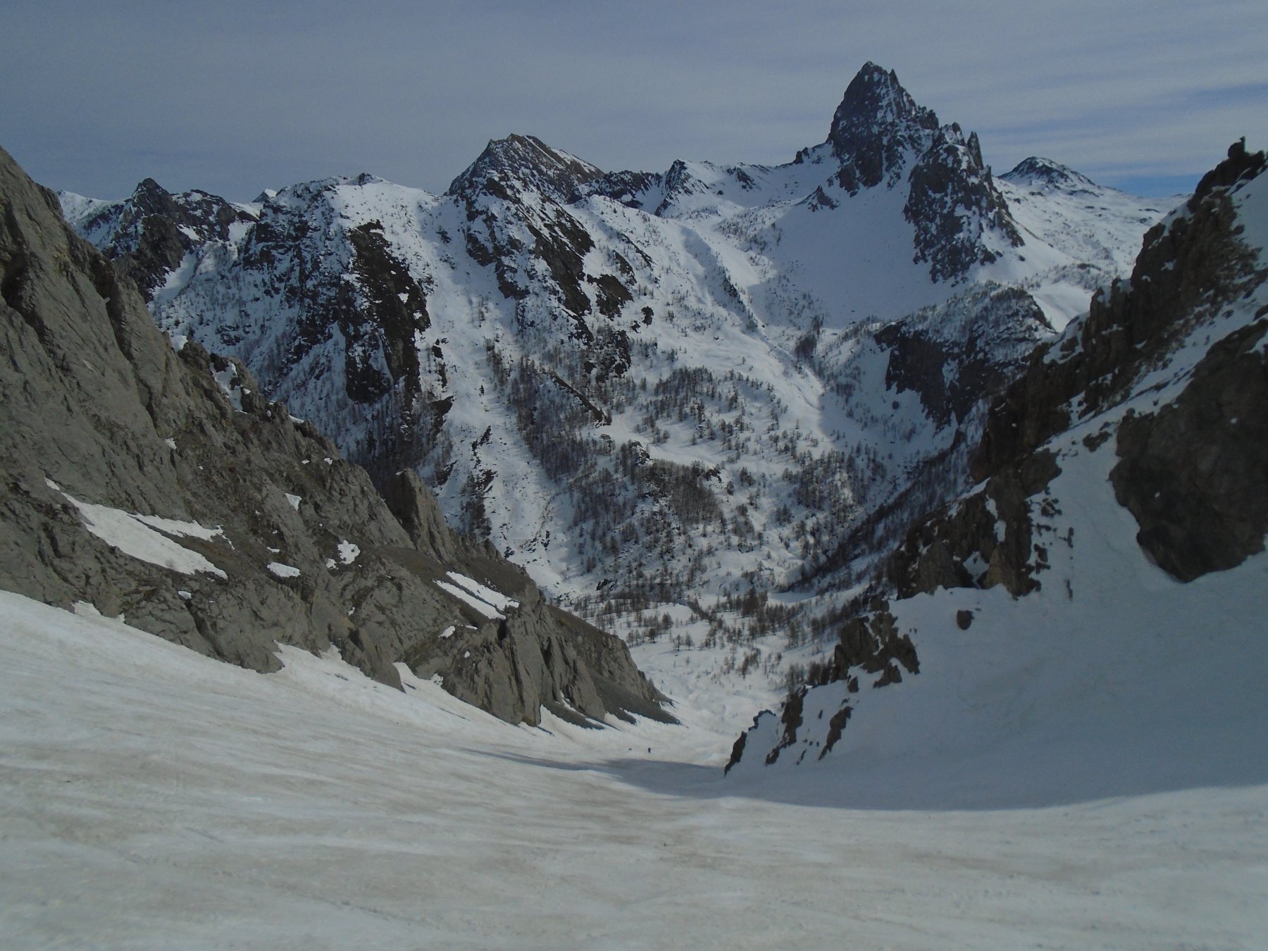 Il canale si presenta sempre piuttosto ampio, con pendenza costante tra 25-30° con qualche breve tratto superiore. E’ suddivisibile in tre parti intervallate da due brevi ripiani dove rifiatare. Dopo l’ultimo ripiano, una specie di avvallamento sotto il pendio sud della cima, si volge verso destra puntando ad una sella alla base della dorsale sud-ovest del Monte Cassorso. Percorrendola senza alcuna difficoltà, seppur abbastanza ripida, si perviene alla piatta cima ovest del Monte Cassorso.