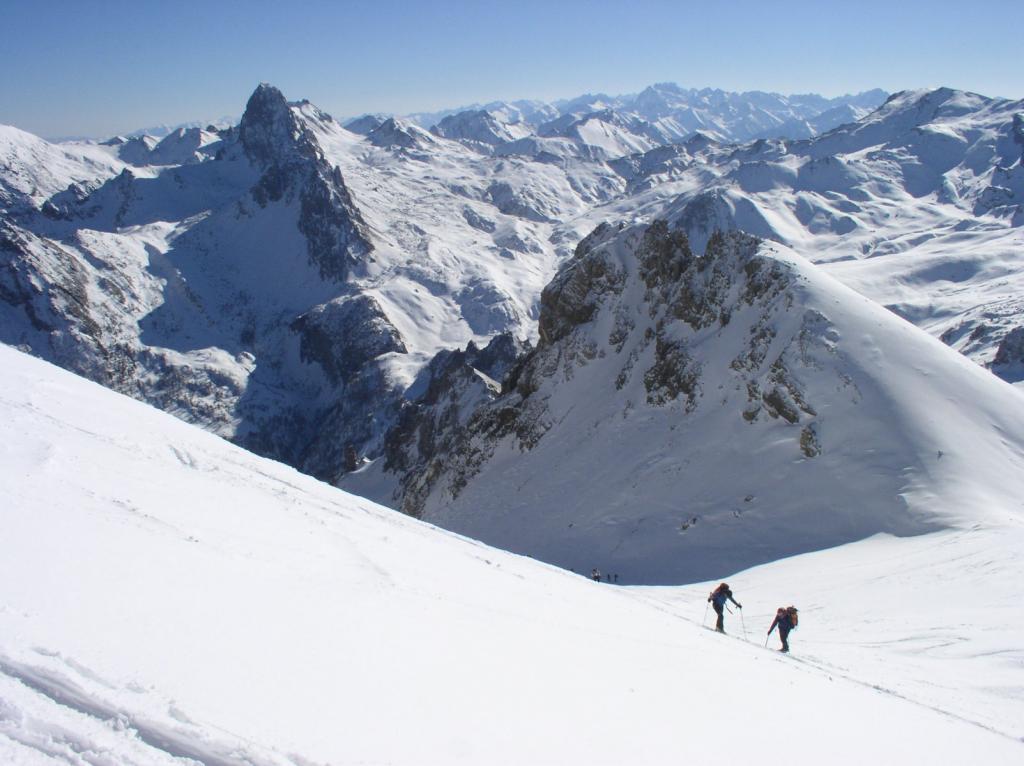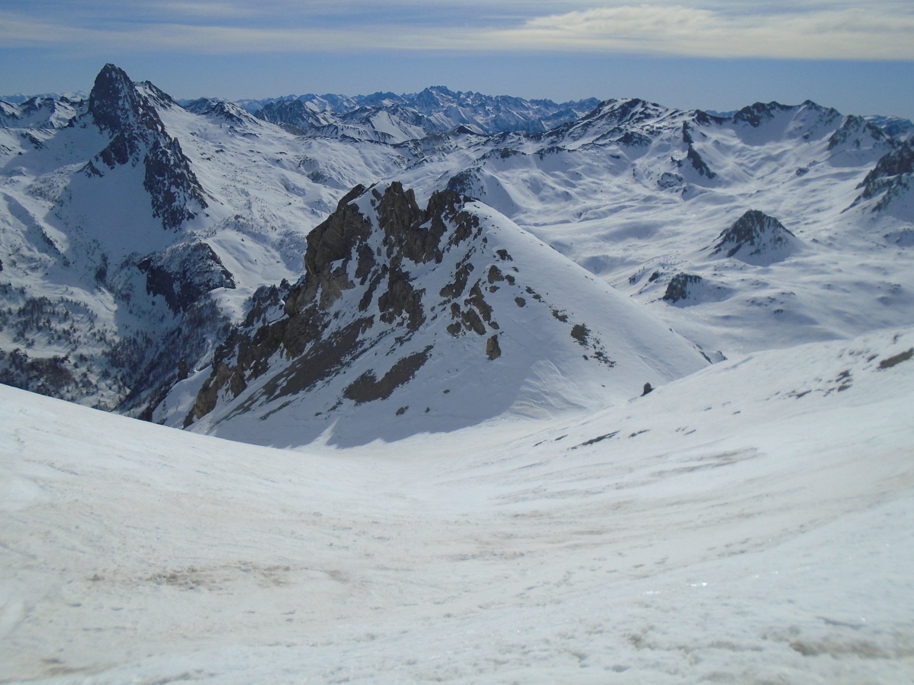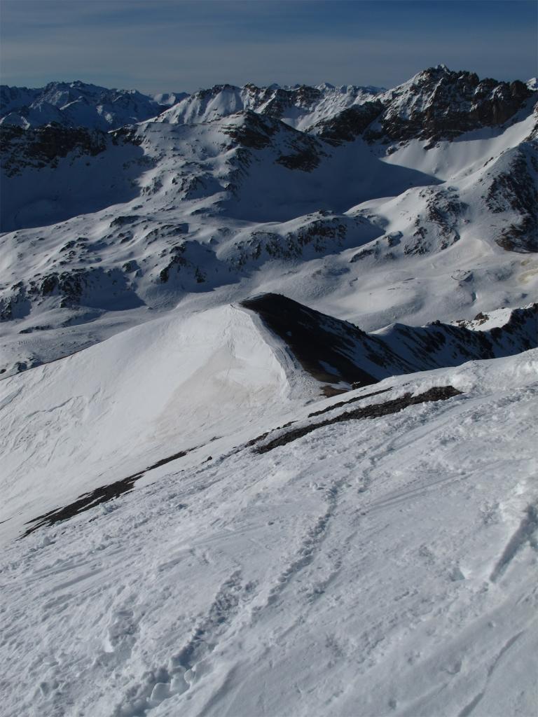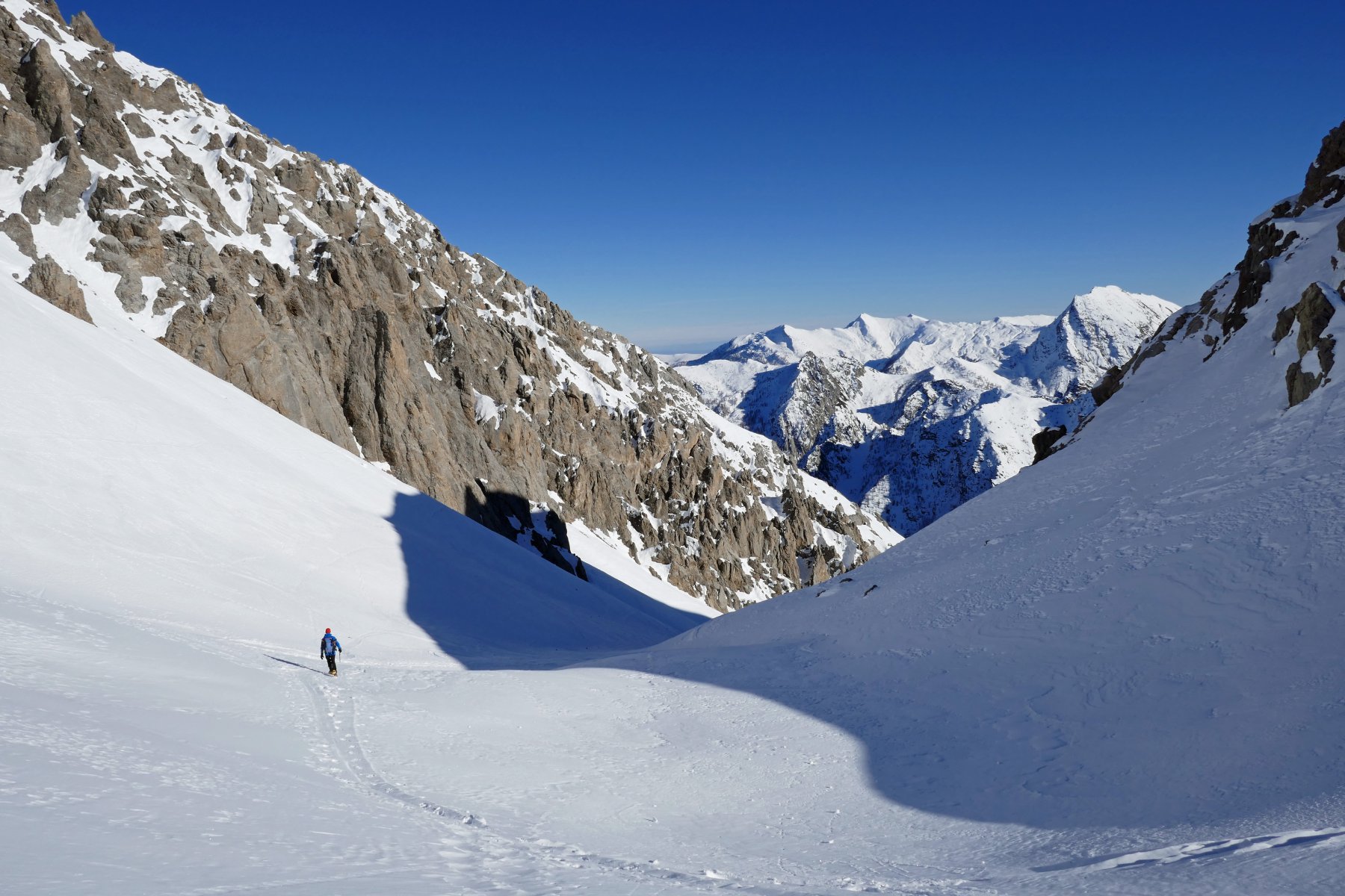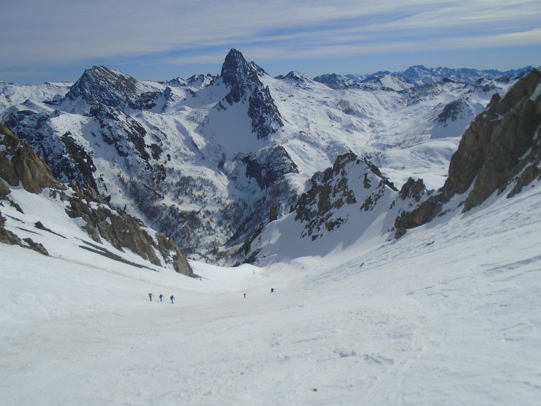 Il canale si presenta sempre piuttosto ampio, con pendenza costante tra 25-30° con qualche breve tratto superiore. E’ suddivisibile in tre parti intervallate da due brevi ripiani dove rifiatare. Dopo l’ultimo ripiano, una specie di avvallamento sotto il pendio sud della cima, si volge verso destra puntando ad una sella alla base della dorsale sud-ovest del Monte Cassorso. Percorrendola senza alcuna difficoltà, seppur abbastanza ripida, si perviene alla piatta cima ovest del Monte Cassorso.