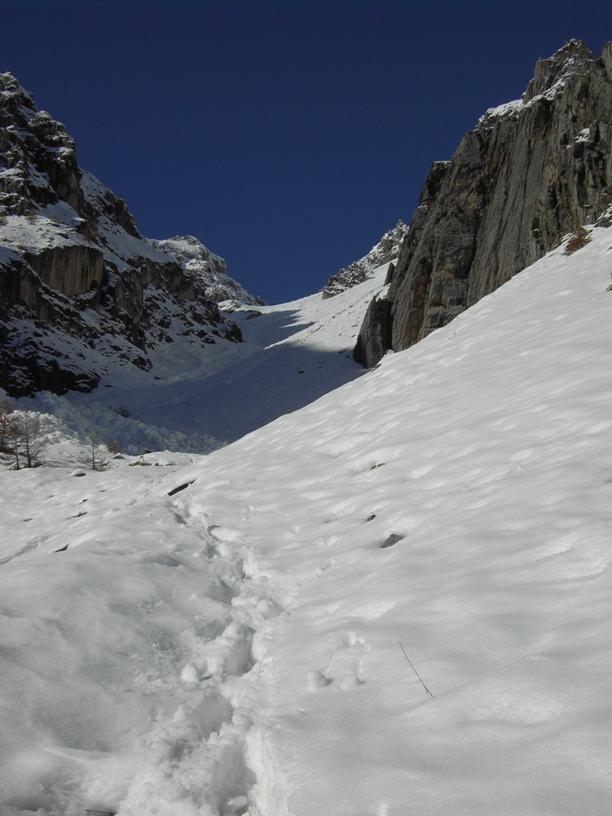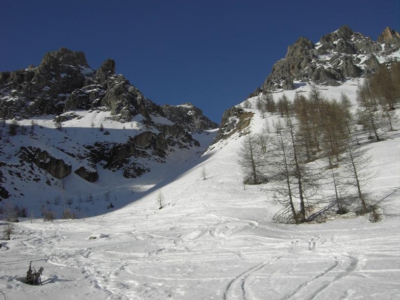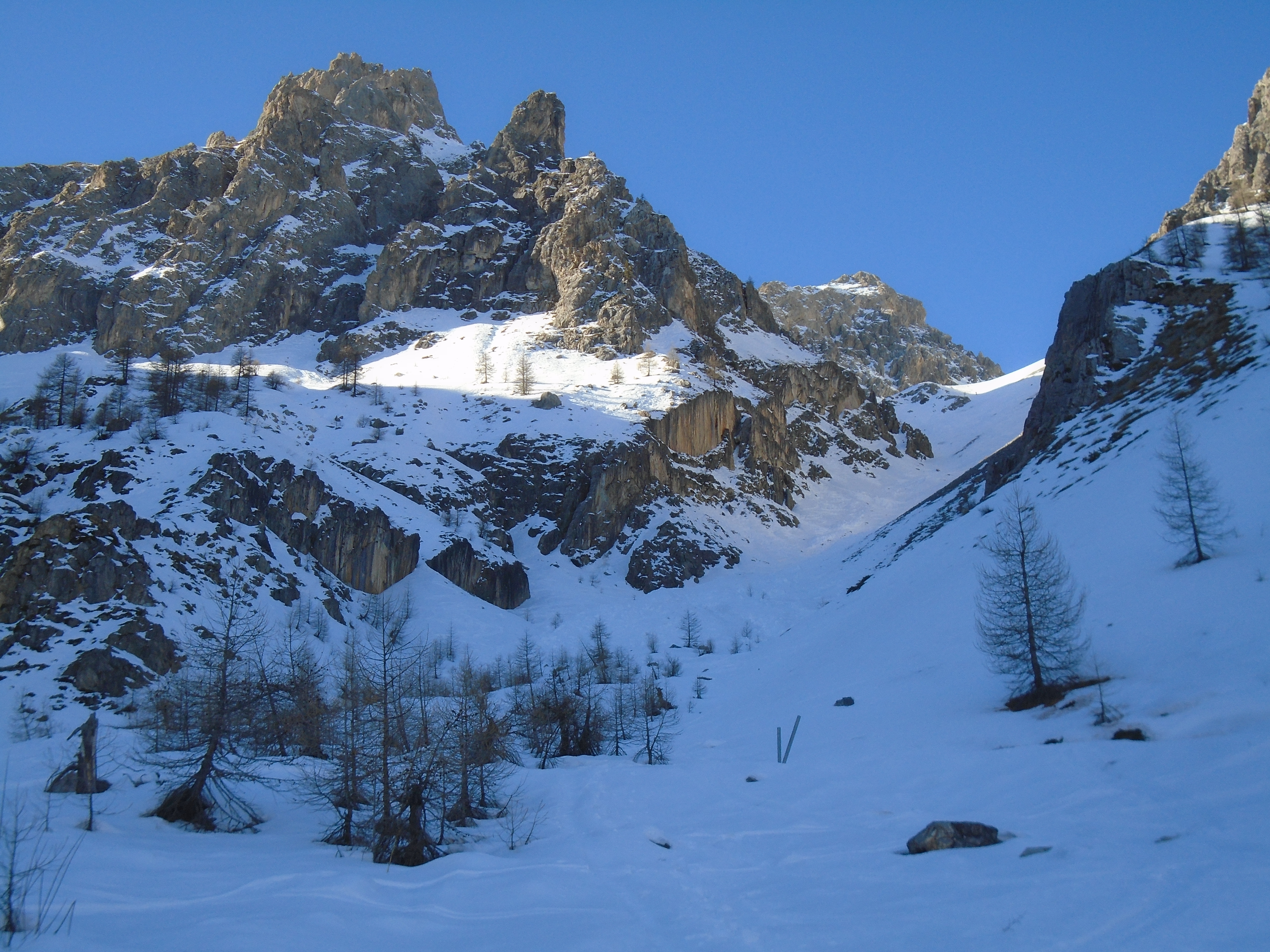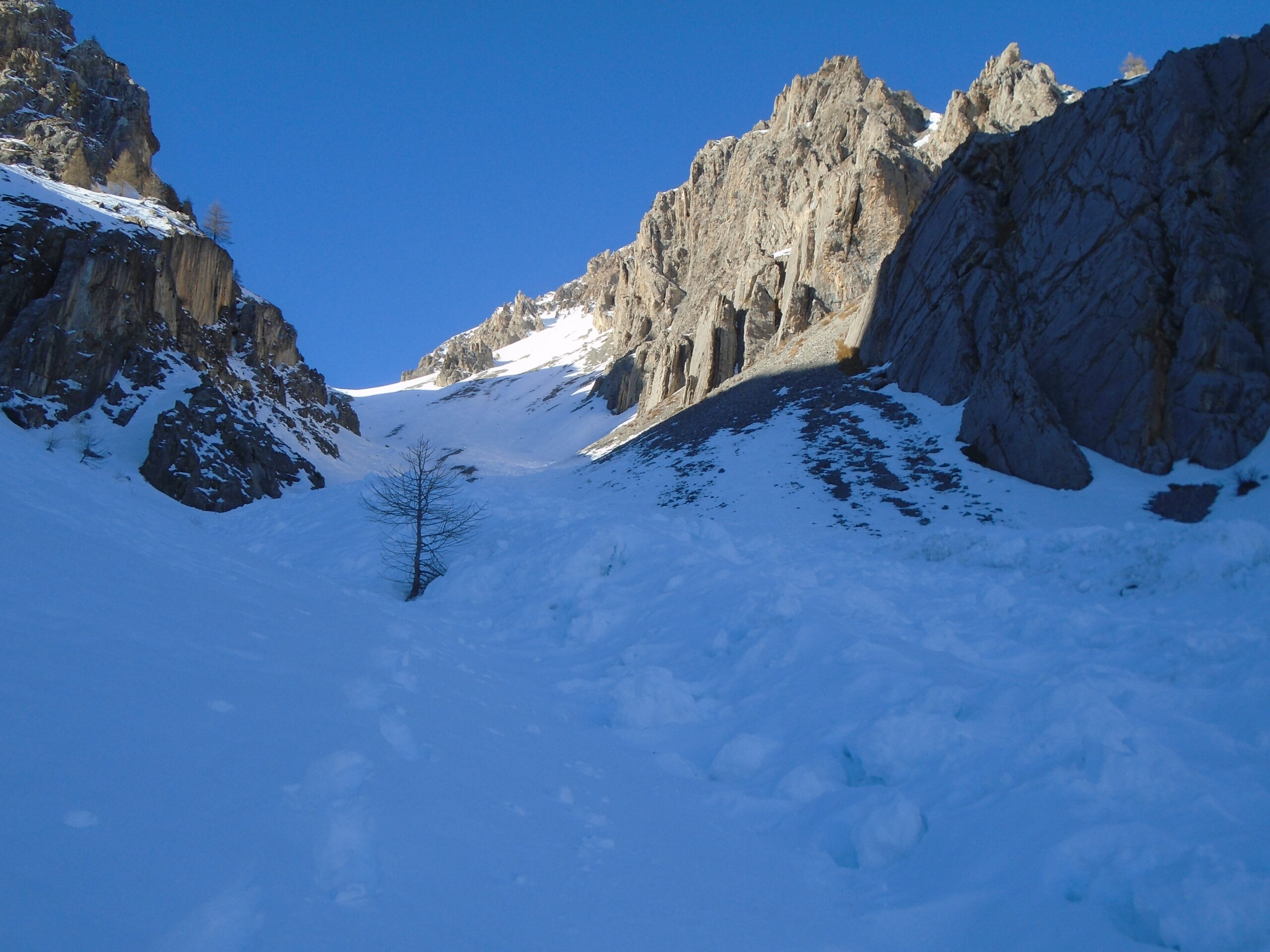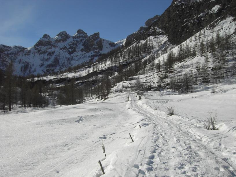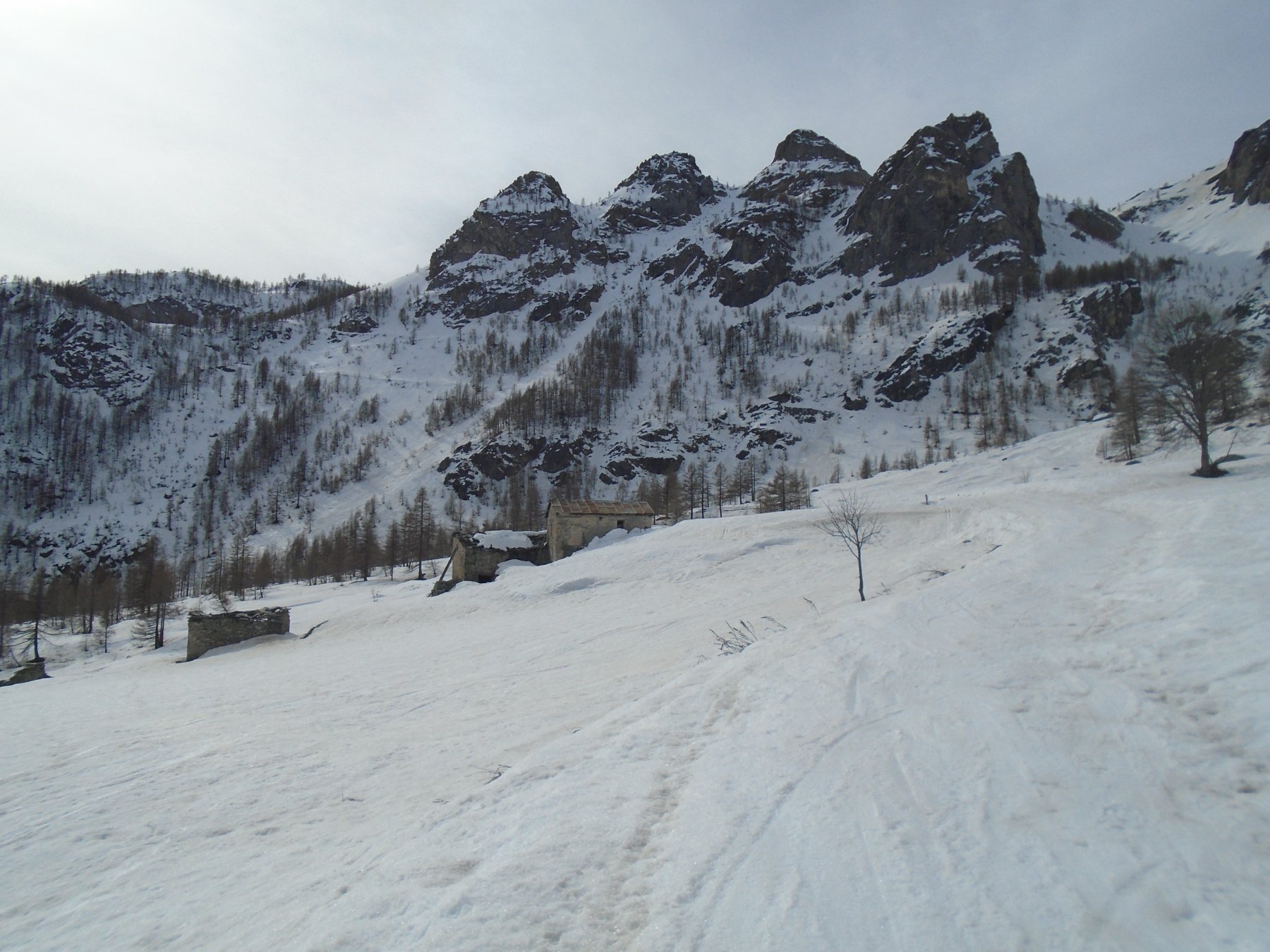 Dal parcheggio dopo Preit 1540 m, proseguire lungo il tracciato della strada che d’estate conduce al Colle del Preit, superando in breve una centrale idroelettrica e poco più avanti le Grange Selvest 1666 m. Sempre seguendo la pista principale, sulla sinistra idrografica del torrente, si sale più ripidamente per un tratto per poi raggiungere un ampia conca con le Grange Servino 1817 m. Superatele, dopo poche decine di metri si abbandona il tracciato della strada piegando a 90° verso destra, imboccando quello che risulterà come l’evidente canalone E/SE.