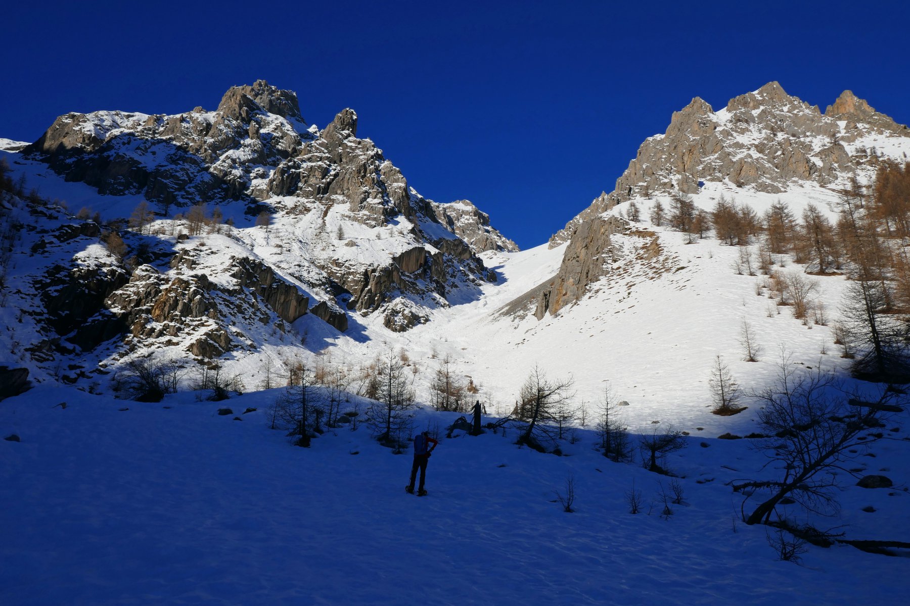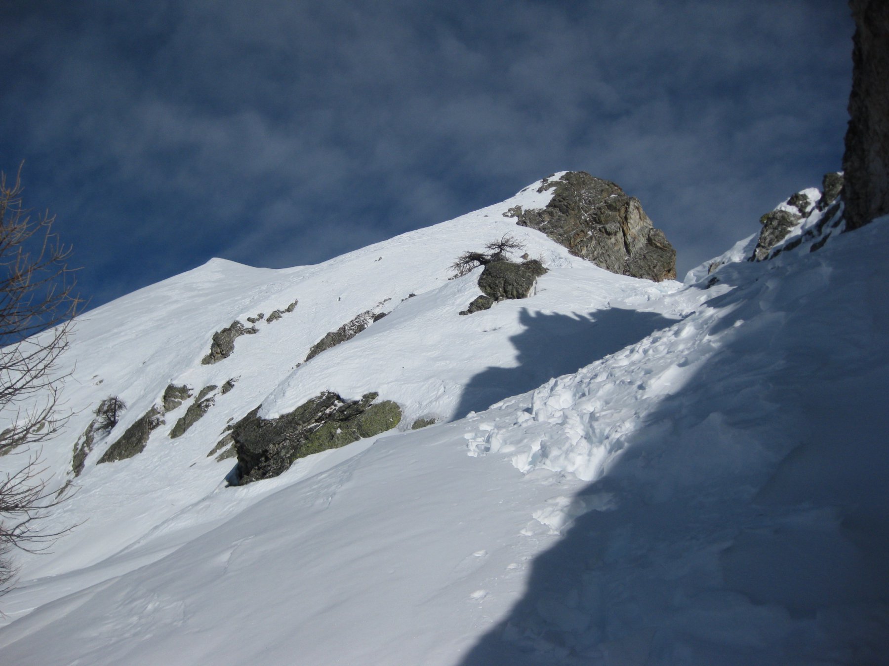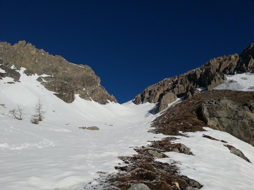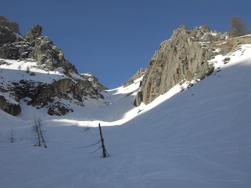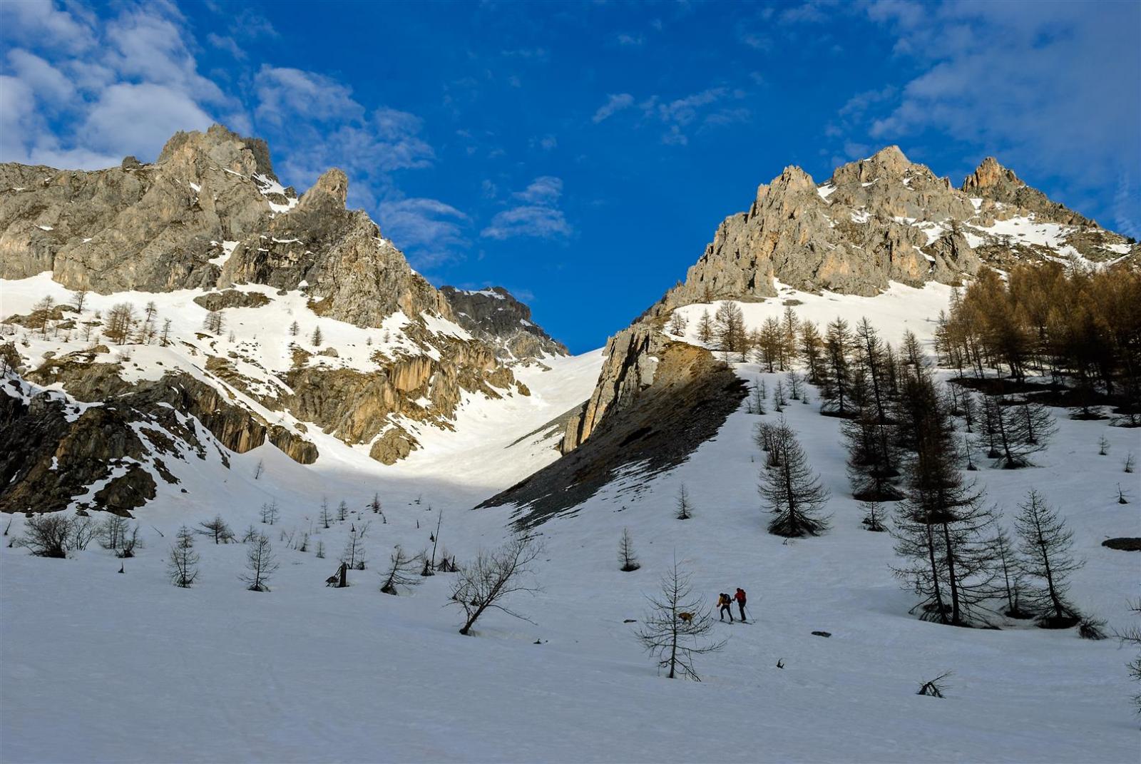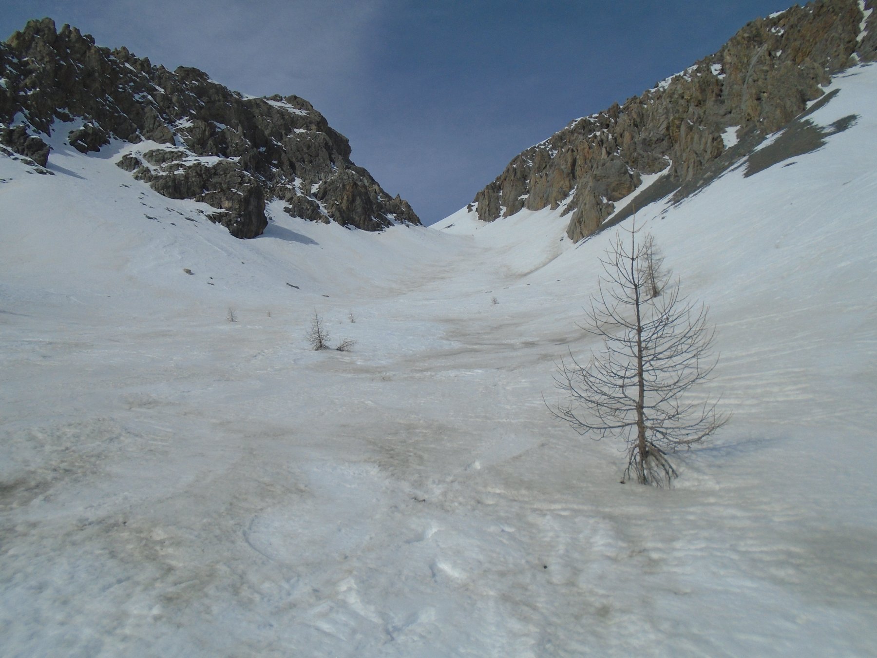 Dal parcheggio dopo Preit 1540 m, proseguire lungo il tracciato della strada che d’estate conduce al Colle del Preit, superando in breve una centrale idroelettrica e poco più avanti le Grange Selvest 1666 m. Sempre seguendo la pista principale, sulla sinistra idrografica del torrente, si sale più ripidamente per un tratto per poi raggiungere un ampia conca con le Grange Servino 1817 m. Superatele, dopo poche decine di metri si abbandona il tracciato della strada piegando a 90° verso destra, imboccando quello che risulterà come l’evidente canalone E/SE.