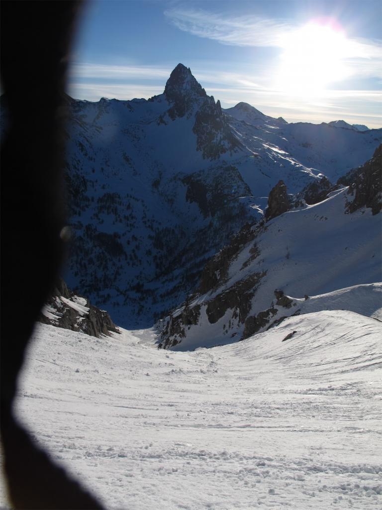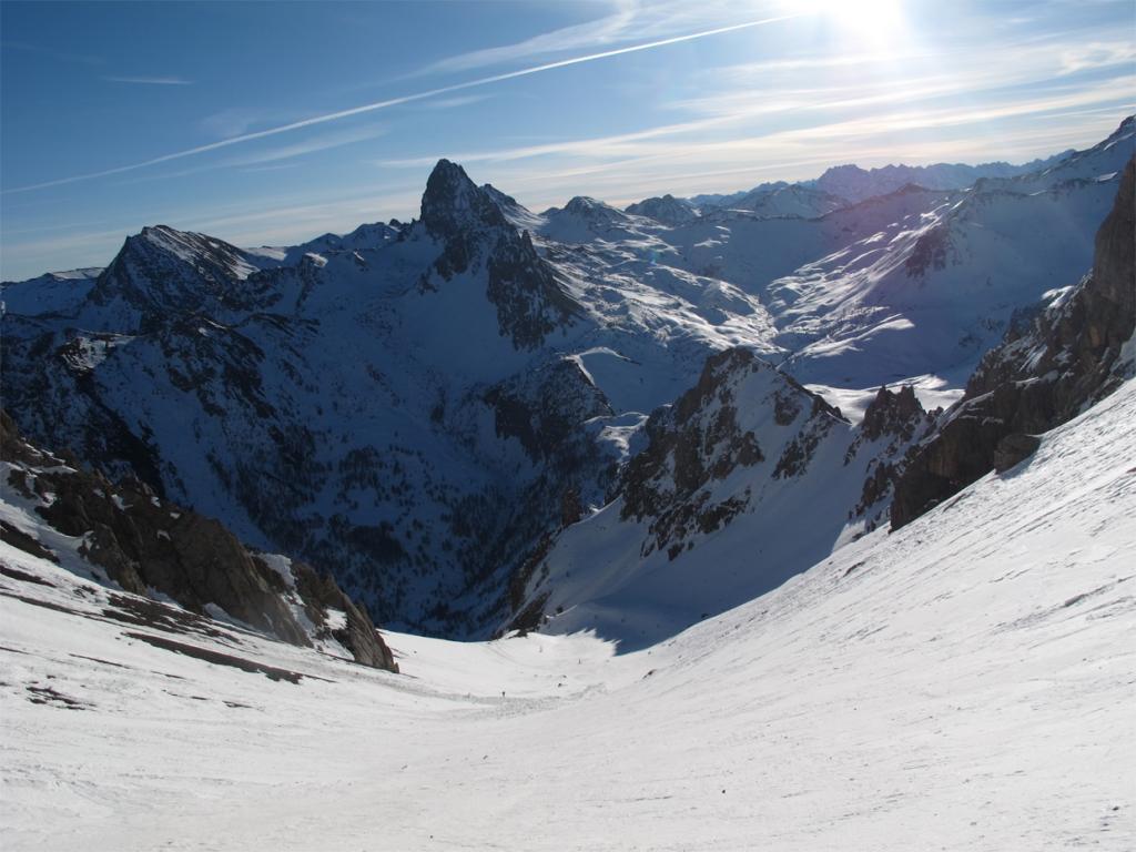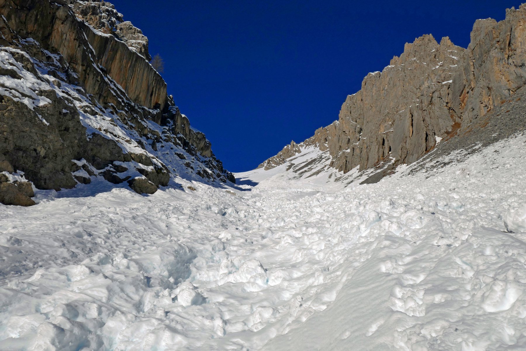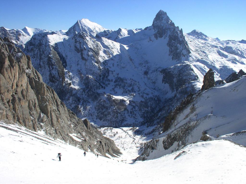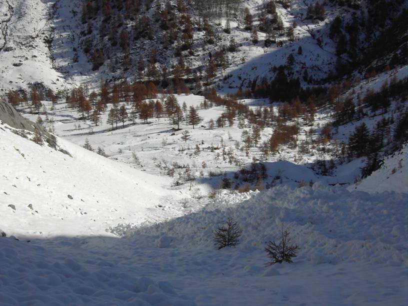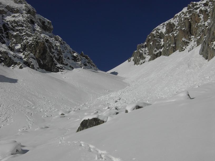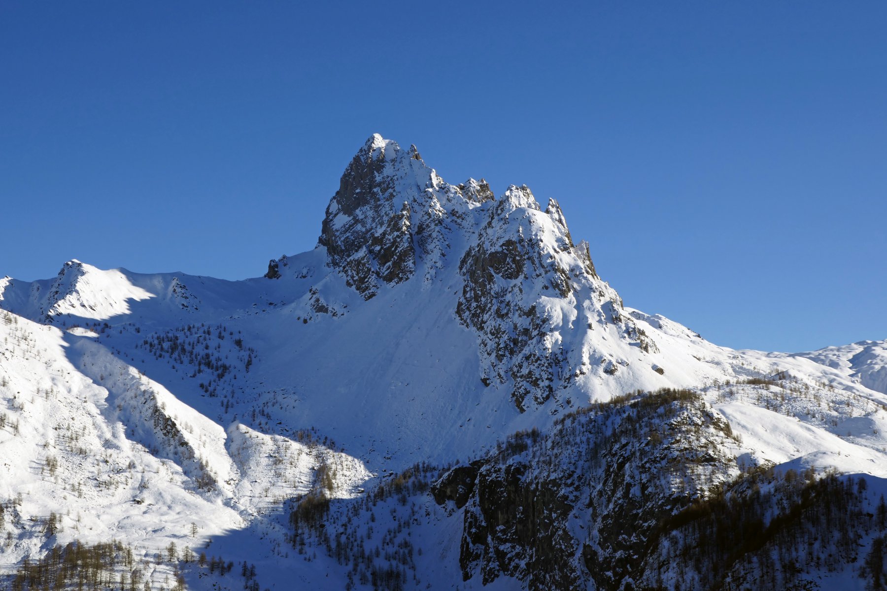 Dal parcheggio dopo Preit 1540 m, proseguire lungo il tracciato della strada che d’estate conduce al Colle del Preit, superando in breve una centrale idroelettrica e poco più avanti le Grange Selvest 1666 m. Sempre seguendo la pista principale, sulla sinistra idrografica del torrente, si sale più ripidamente per un tratto per poi raggiungere un ampia conca con le Grange Servino 1817 m. Superatele, dopo poche decine di metri si abbandona il tracciato della strada piegando a 90° verso destra, imboccando quello che risulterà come l’evidente canalone E/SE.
