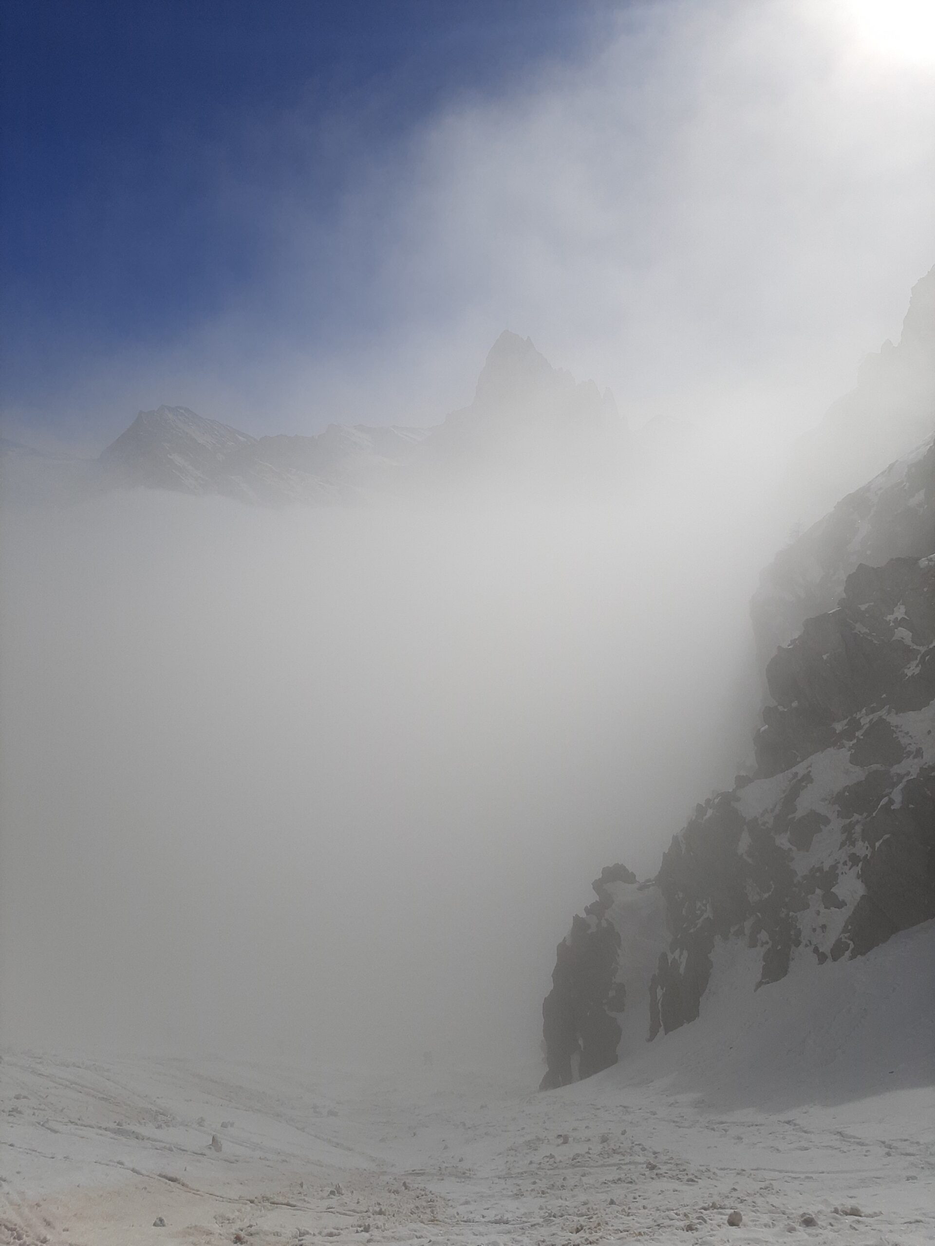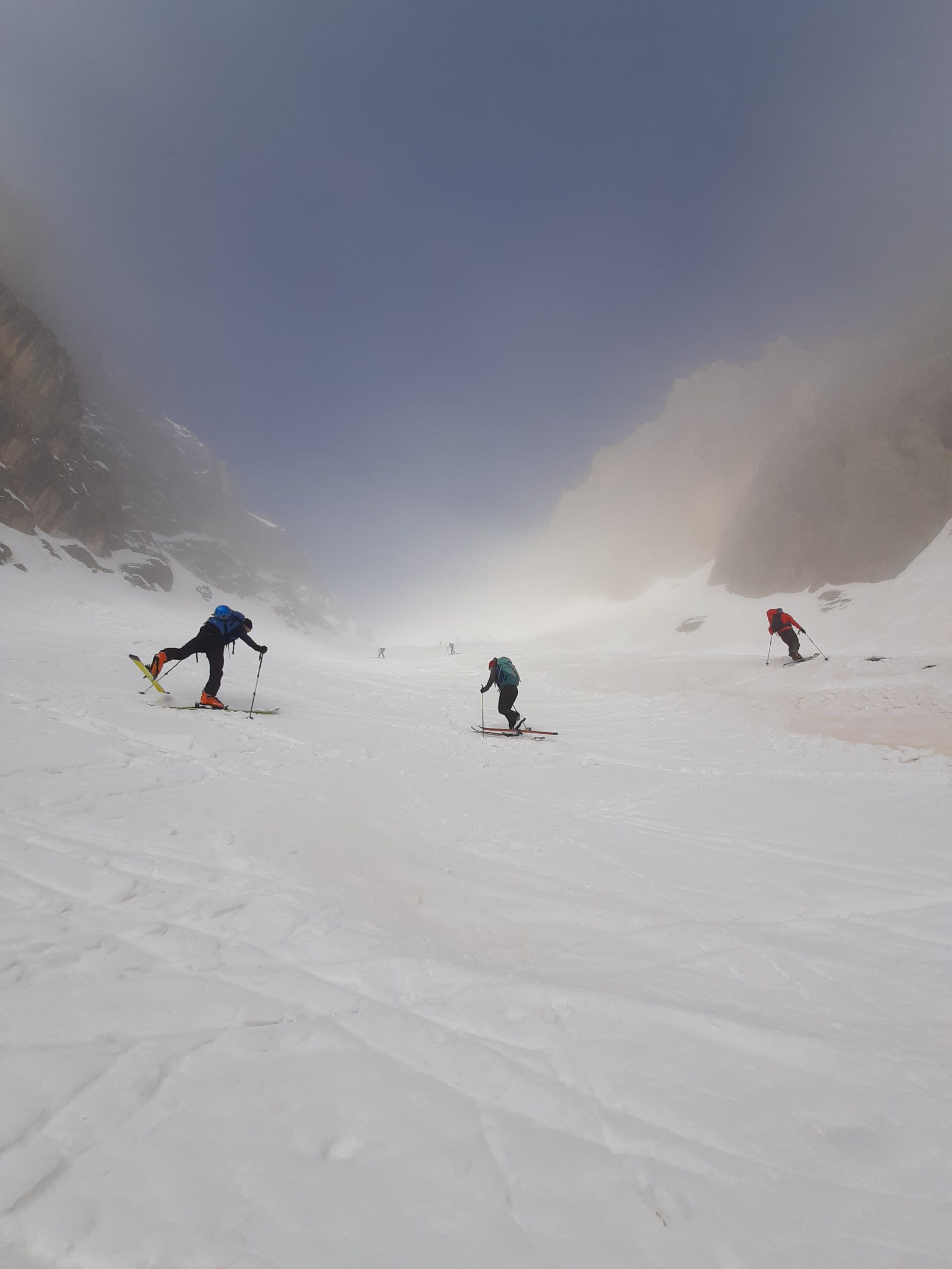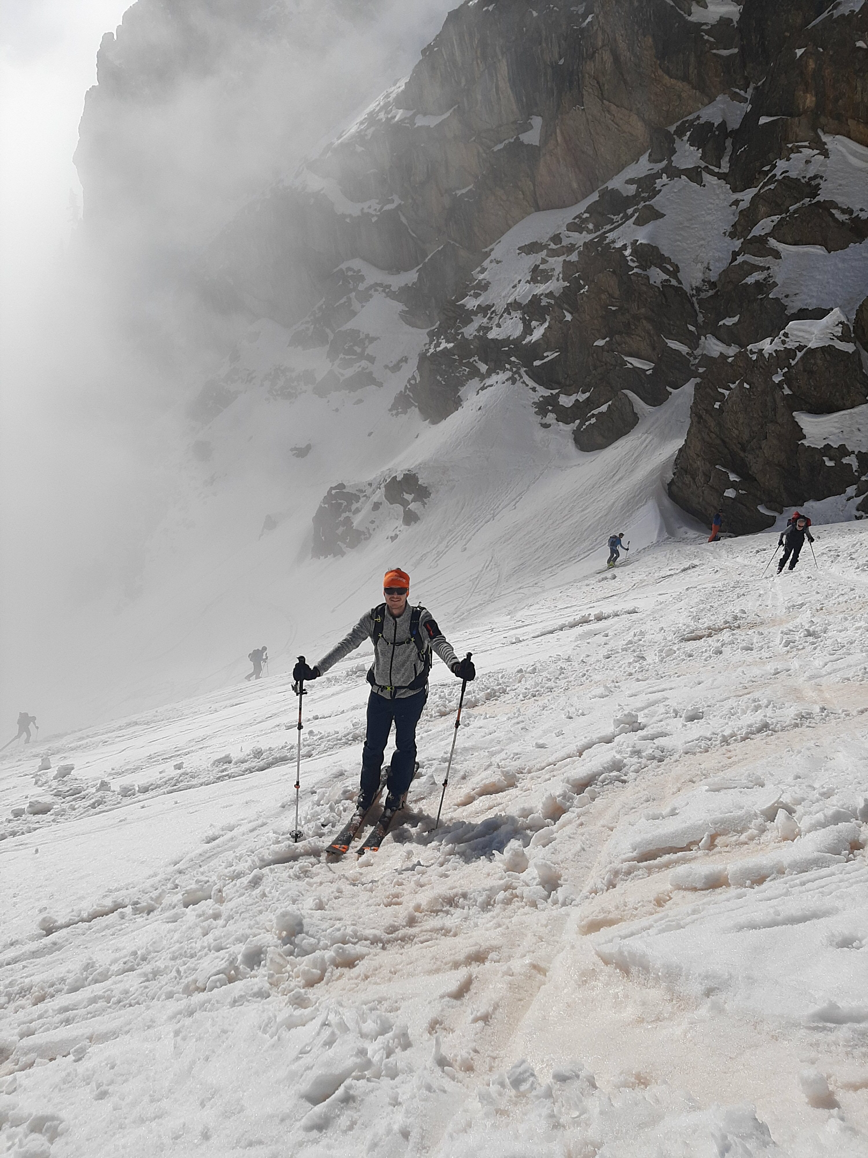 Anche oggi val maira. Da tempo volevo provare questa classicissima e oggi viste temperature e expo pareva il giorno giusto. Partiti insieme ad altre 1383829292929292 persone, all’attacco del canale eravamo avvolti dalle nebbie e su neve dura (utili i coltelli) ma dopo 200 d+ siamo usciti al sole e abbiamo proseguito fino in cima su neve progressivamente mollata.