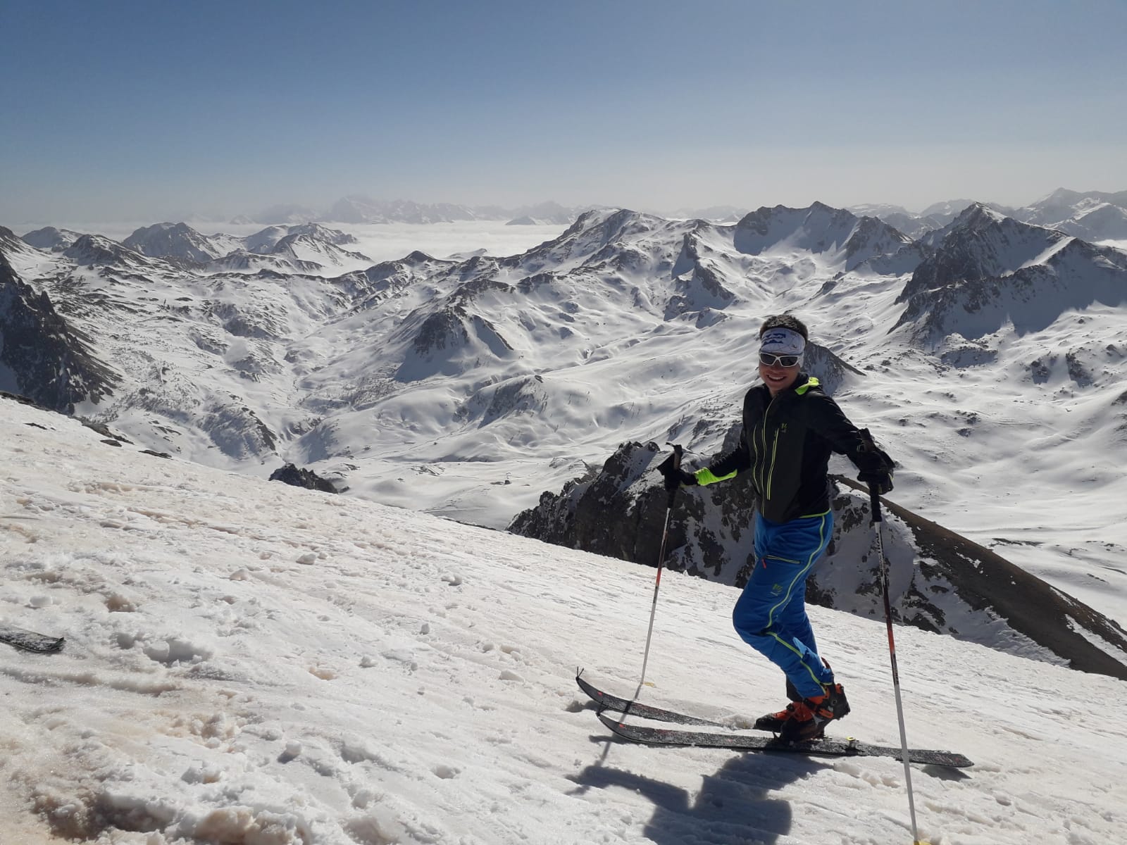 Discesa: dalla croce di vetta situazione magra ma ancora fattibile interamente in sci (sfruttando la cresta), canale mollato con riporti dei tantissimi passaggi che danno un po’ fastidio, verso metà abbiamo sciato una contropendenza a dx scendendo e abbiamo trovato vecchia farina, per il resto meglio stare al sole (si evita crosta) facendo attenzione alle pietre affioranti. Da fine canale neve continua e crostosa fino alla macchina. Con roby fino in cima e lupo che si è fermato a 3/4 canale per problema alla caviglia. Panorama sublime, canale a pendenza costante sui 30° su neve accettabile e tanto caldo.