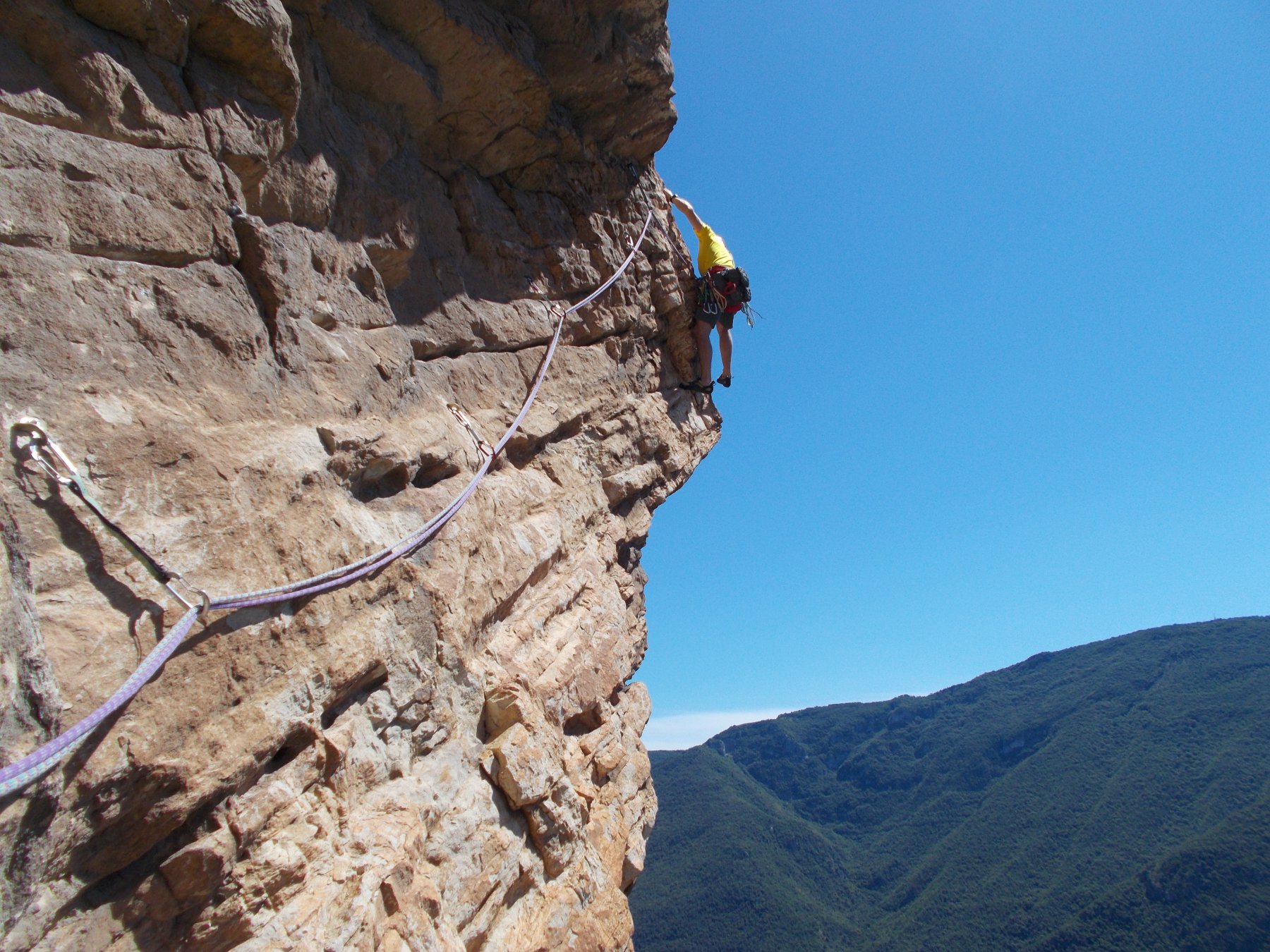 - L5 Si va in diagonale a sinistra in forte strapiombo, molte prese sono state resinate e consolidate, chiodatura fitta fitta. Si entra poi un un bellissimo muro verticale a grandi tasche diagonali. Con arrampicata entusiasmante si aggira lo spigolo verso comoda sosta su albero, 6c;