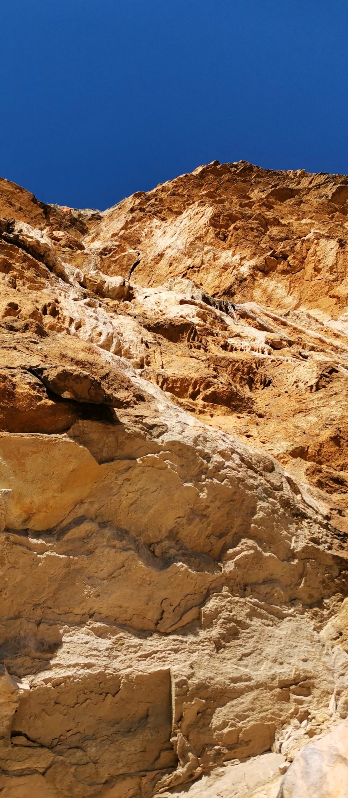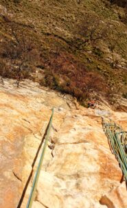- L4: Lungo tiro prima su di una estetica placca con grossi buchi e clessidre che conduce a una fessura verticale fino a scomoda sosta, allungare le protezioni per evitare l’attrito, 6a;