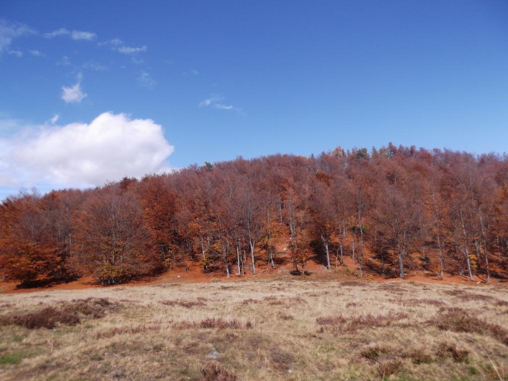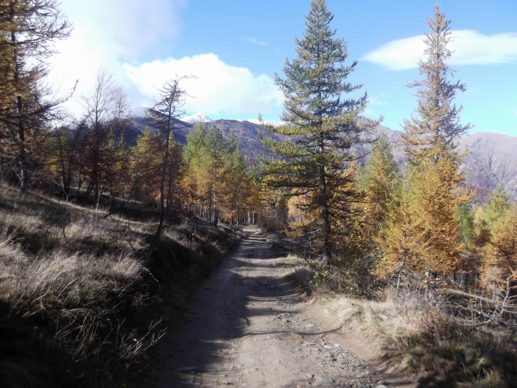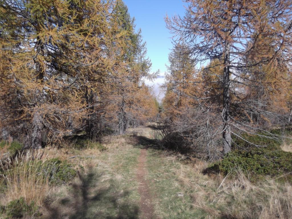 Dopo Sangle il terreno diventa sterrato e le pendenze si addolciscono sun po’. In altri 5 km a tratti nel bosco a tratti attraverso prati, la carrareccia conduce al Colle Vaccera 1461 m.