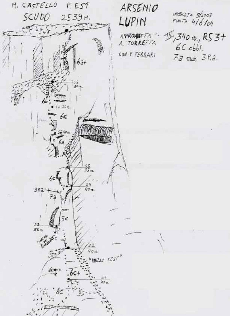- L5 : 6a+, 3 spit, 35 m. Difficile da proteggere, diedro lichenoso a destra sopra la sosta. Uscire all’inizio del diedro chiuso dal tetto nero.