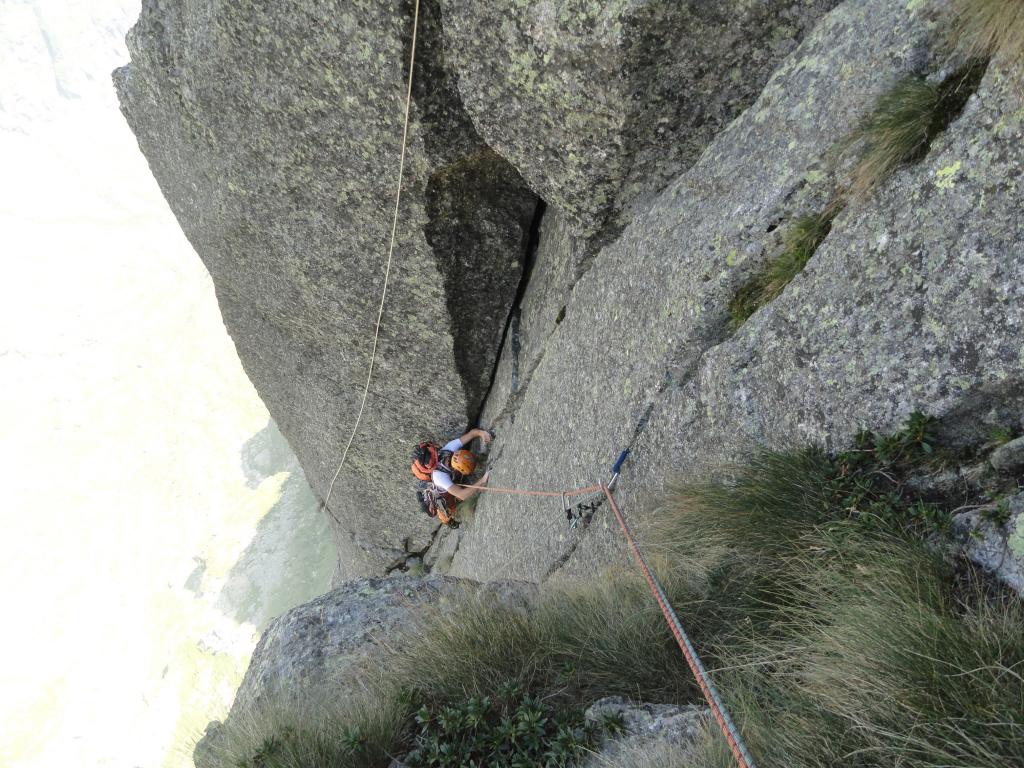 - L7 : 6a+, 30 m. Stupenda fessura ad incastro, che finisce con un diedro svaso fessurato. Sosta sotto all’evidente camino.