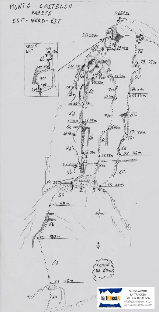 - L1 : 6a, 3 spit, 35 m, fessura, poi placca, fino alla cengia erbosa), sosta a spit.