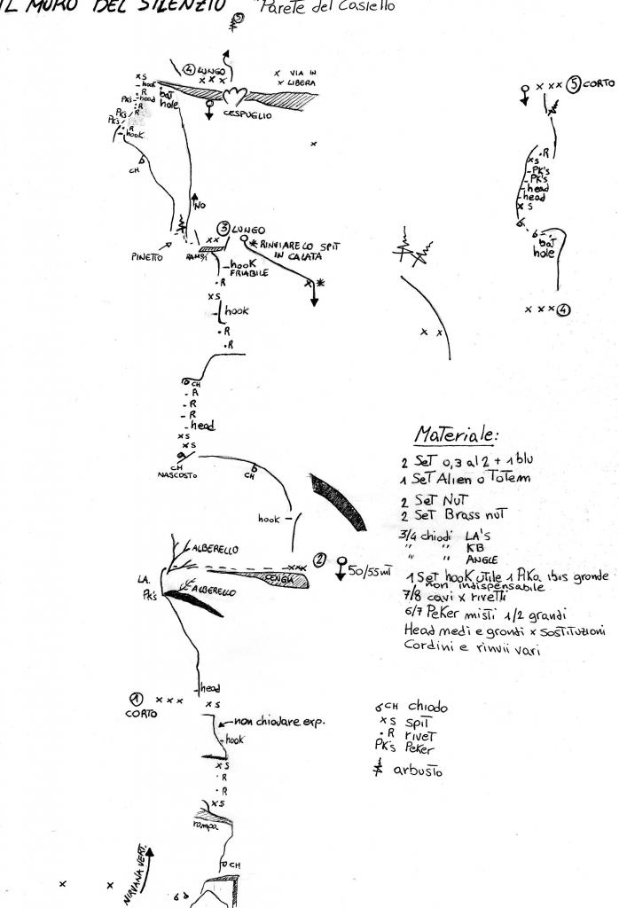 - L2: si parte con un altro copper, segue fessurina verticale poi più larga traversa verso sx (friend medi e nut grossi, 1 LA). Dopo 1 spit, quando la fessura finisce sotto un tettino, non proseguire dritto x l’evidente fessurina da micronut ma traversare a sx e risalire il lungo diedrino con una serie di pecker. Da un ultimo alien si tira un cordino su un alberello, ci si ribalta su una cengetta comoda che si segue in orizzontale 10 m a dx fino a sosta comoda, 2 spit. 30 m, A2+. Io all’inizio ho seguito la fessurina dritta e ho dovuto pendolare da un KB che ho poi abbandonato.