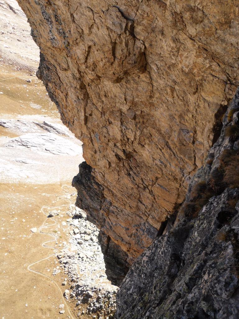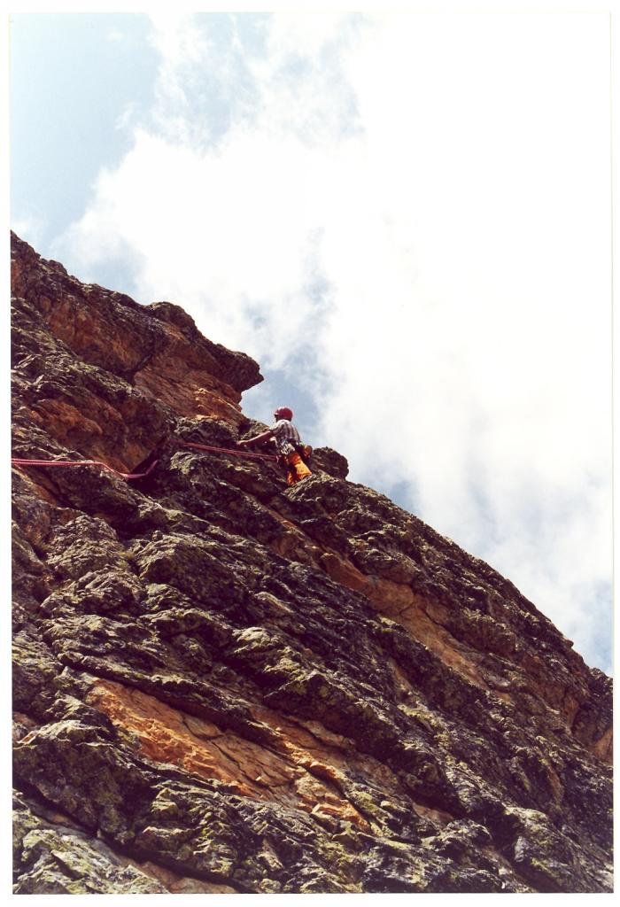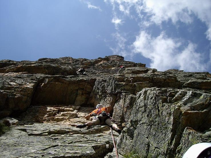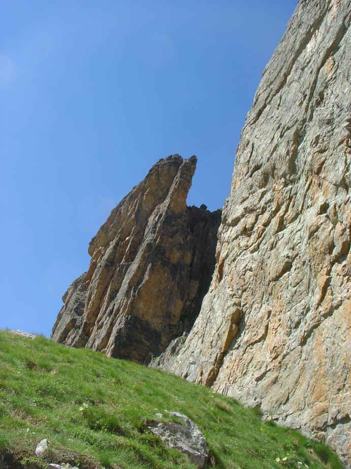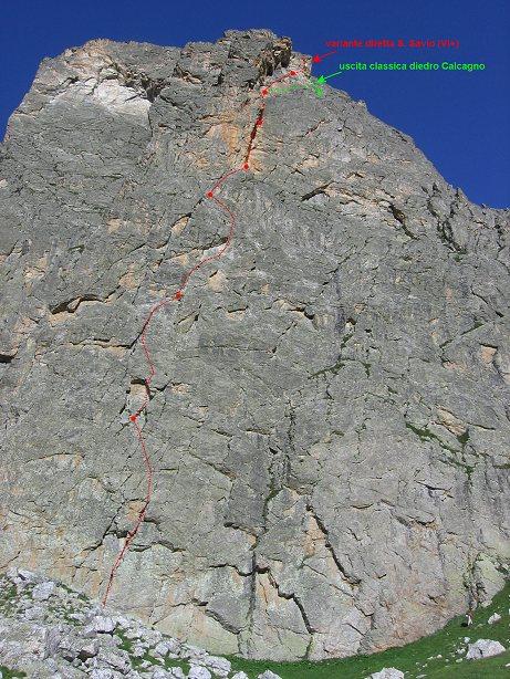 Se si evita la Variante Diretta nella parte alta (Variante Savio, VI, VI+) completando la via originale (obliquando a dx invece di continuare a seguire il diedro), le difficoltà si riducono (III, IV) e si può raggiungere la vetta seguendo l’ultima lunghezza della via Diagonale Est.