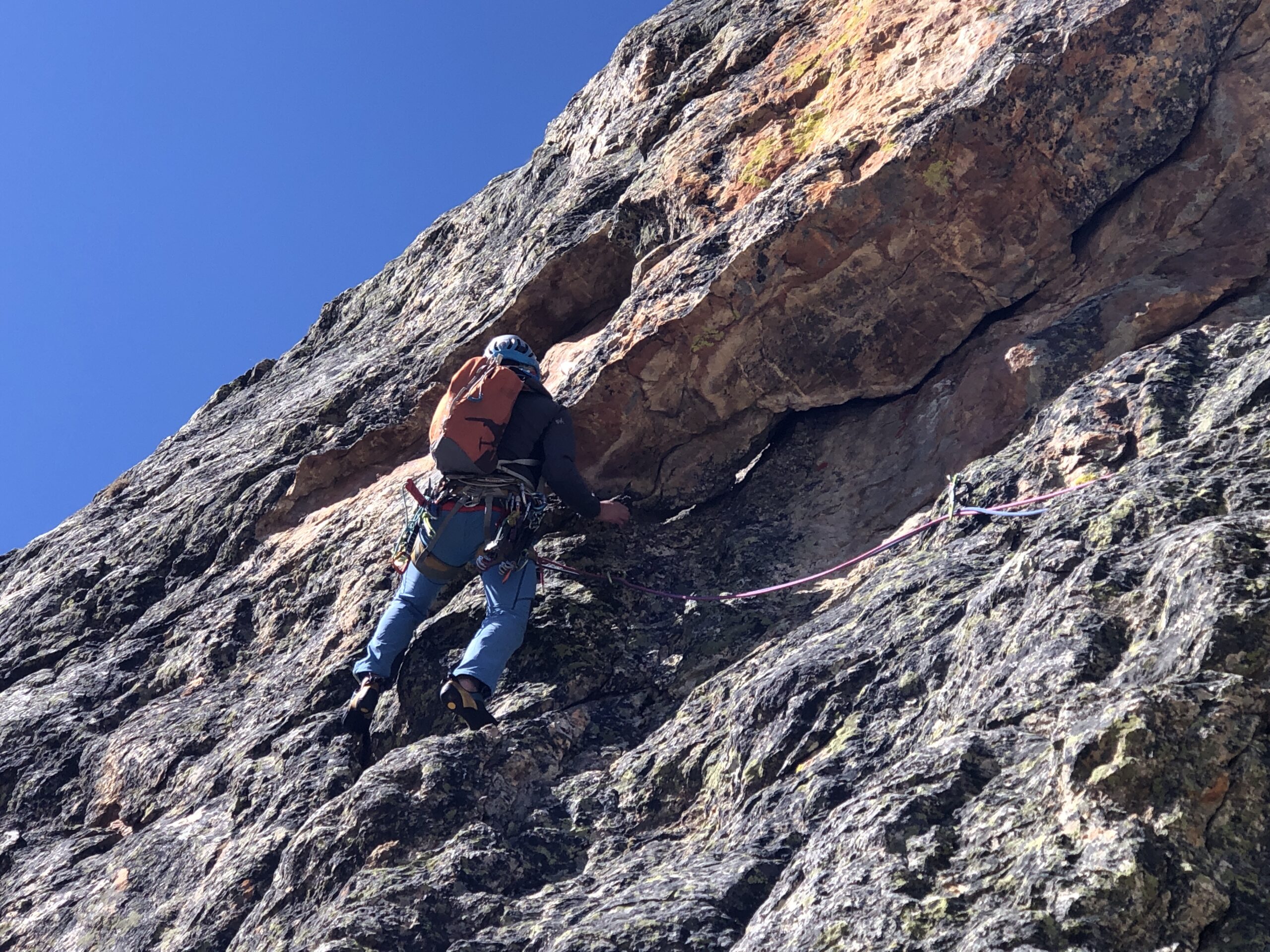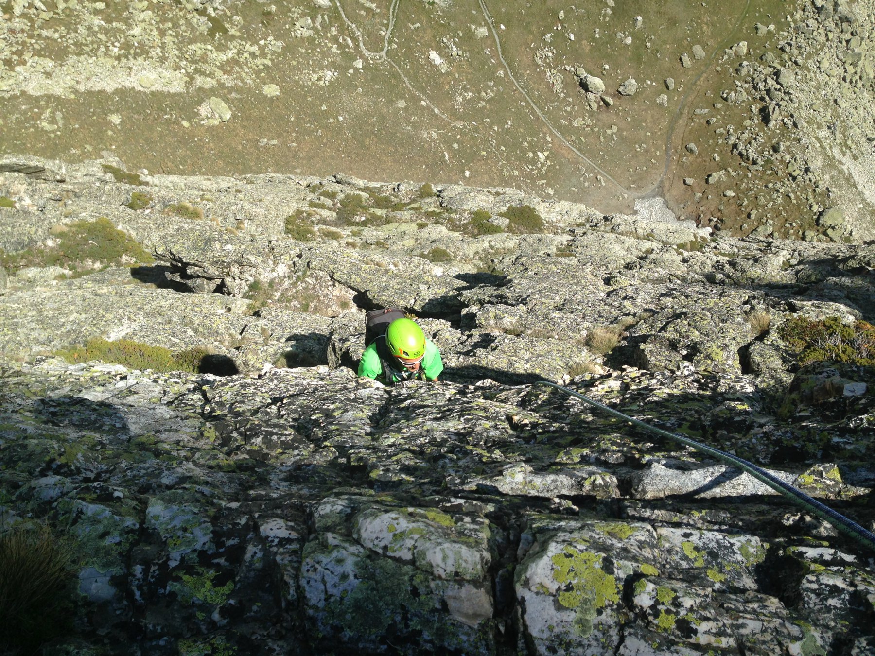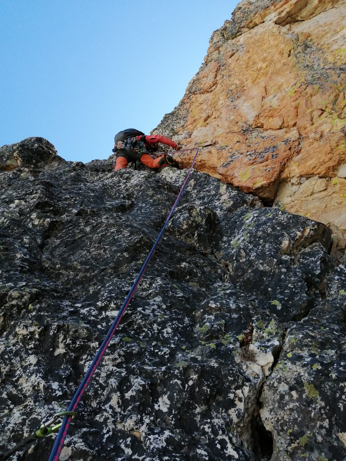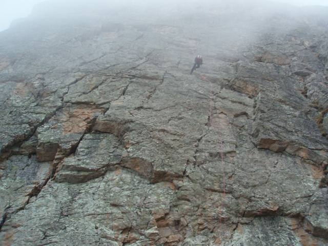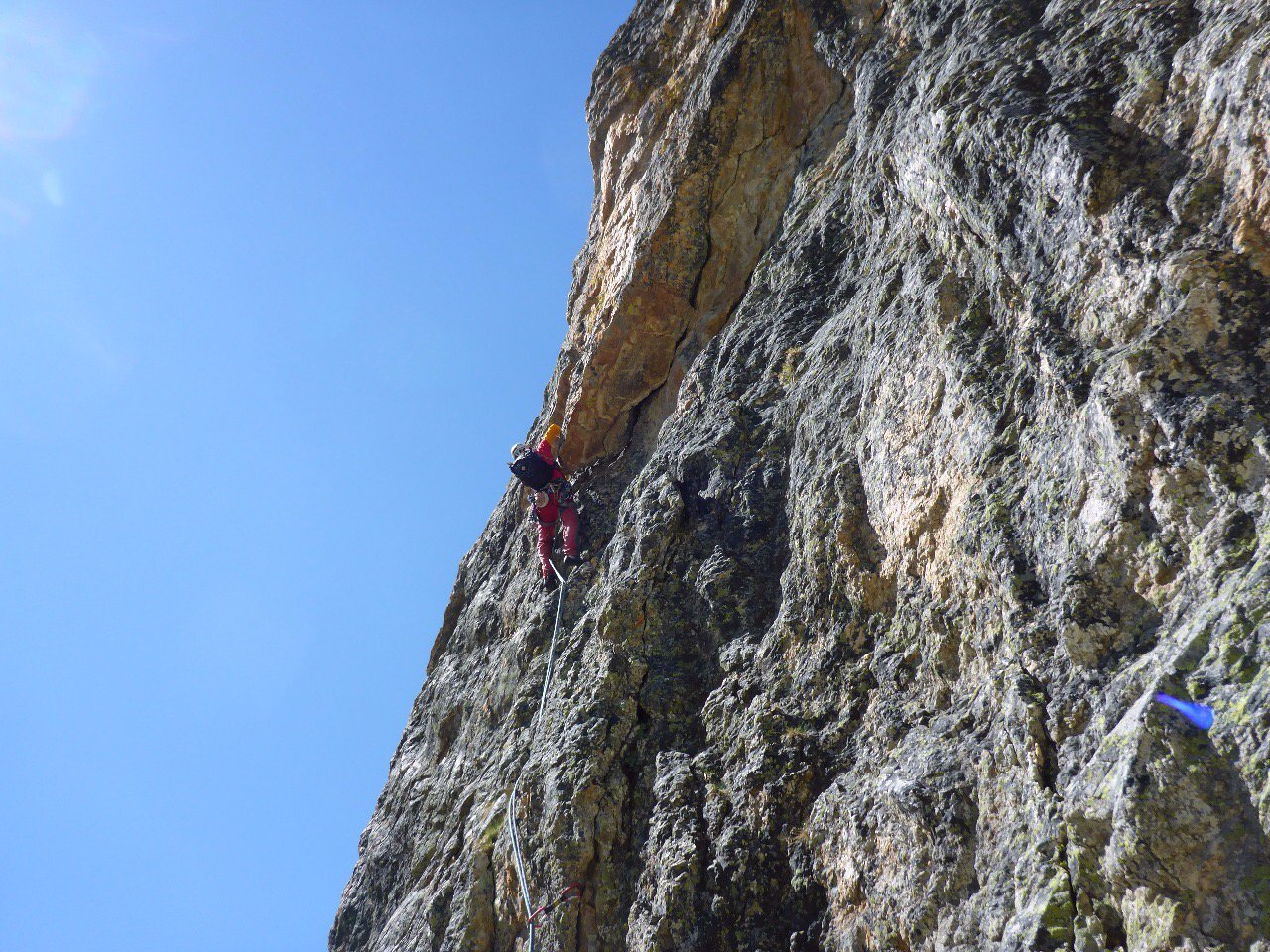- Continuare per 4 m nella fessura che forma il diedro, obliquare a destra (2 m) e salire la placca (IV,IV+, ch.), poi spostarsi in traversata a sinistra e superare il diedro sul fondo (IV, ch.).