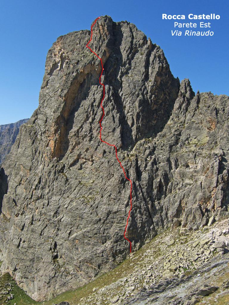 Elevarsi a destra del diedro per 20 m, poi ritornare in traversata a sinistra aggirandone lo spigolo (ch.) e continuare per esso fino alla congiunzione del Diedro Calcagno e della Diagonale (IV)(sosta su spuntone con cordoni). - Salire il muretto obliquando verso sinistra fino a raggiungere la Cengia Alta della Rocca Castello. Spostarsi verso sinistra fin sotto lo Spigolo Sud-Est e salire fino in vetta.