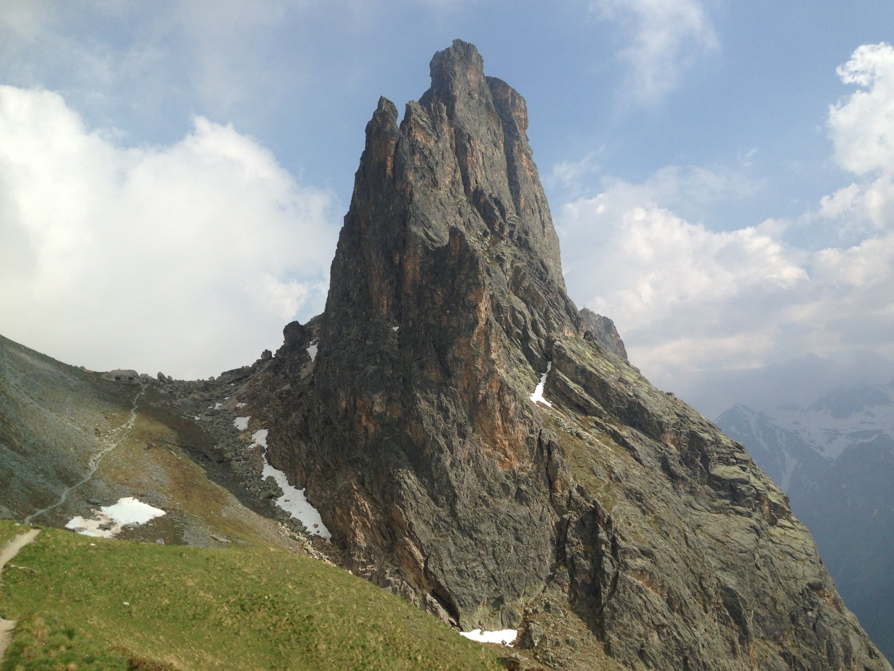 - Passare alla base del grande spuntone e con traversata a sinistra di c. 10 m giungere ad una lama staccata sotto uno strapiombo (IV, 1 ch.); superarlo per una fessura gialla ed uscire su un terrazzo alla base di un diedro dove si trova una pianta secca (V, 1 ch.).