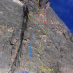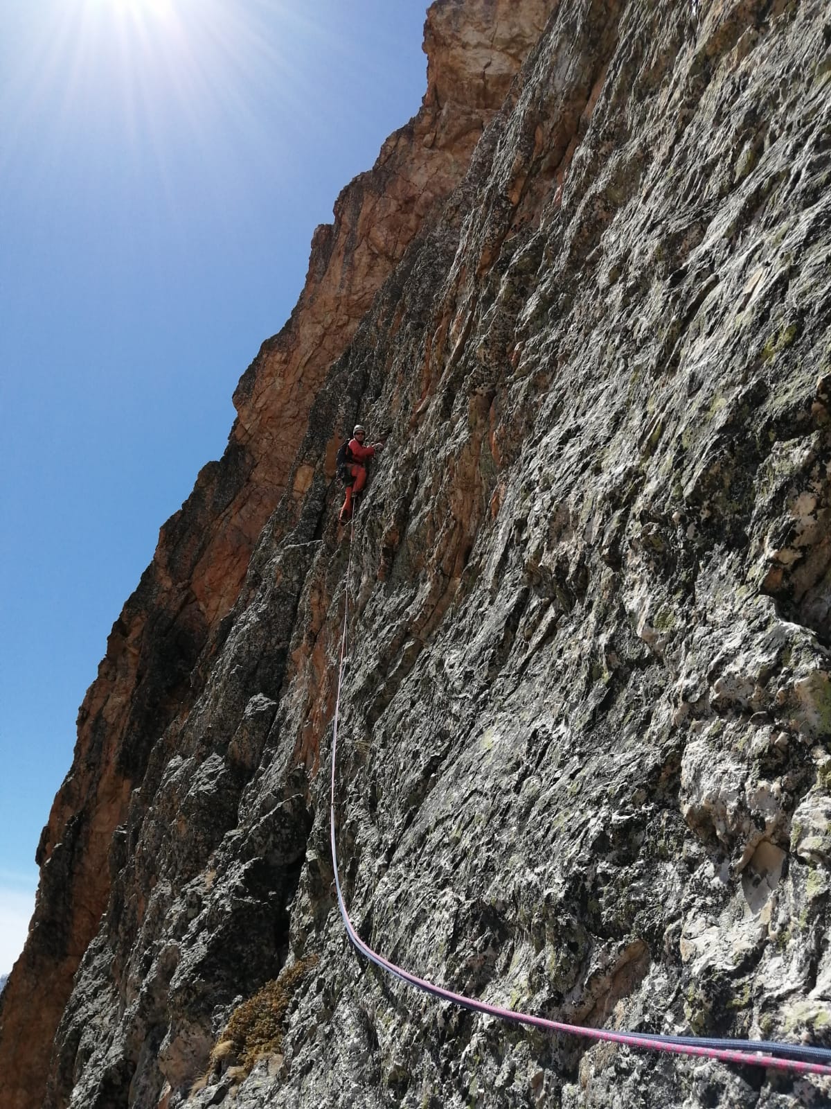 - Attaccare la parete sotto un evidente tetto rosso, obliquare a sinistra fino alla sua estremità(III), superare il tetto, seguire una fessura diagonale verso destra, uscire su una piccola cengia (V,2 spit con cordone) e continuare per uno spigolo sulla destra fino ad un punto di sosta (III+).