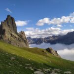 - Proseguire verticalmente (20m, III+), spostarsi sulla destra e per un diedro, obliquare a sinistra e raggiungere la cengia della via digonale est(III).