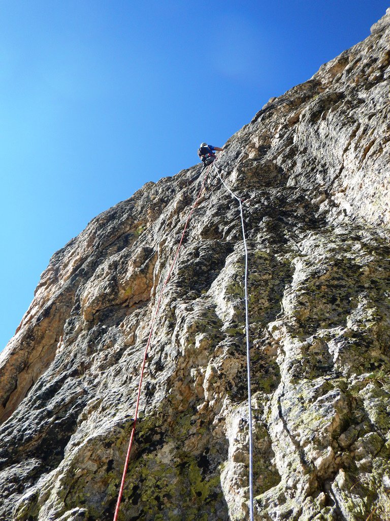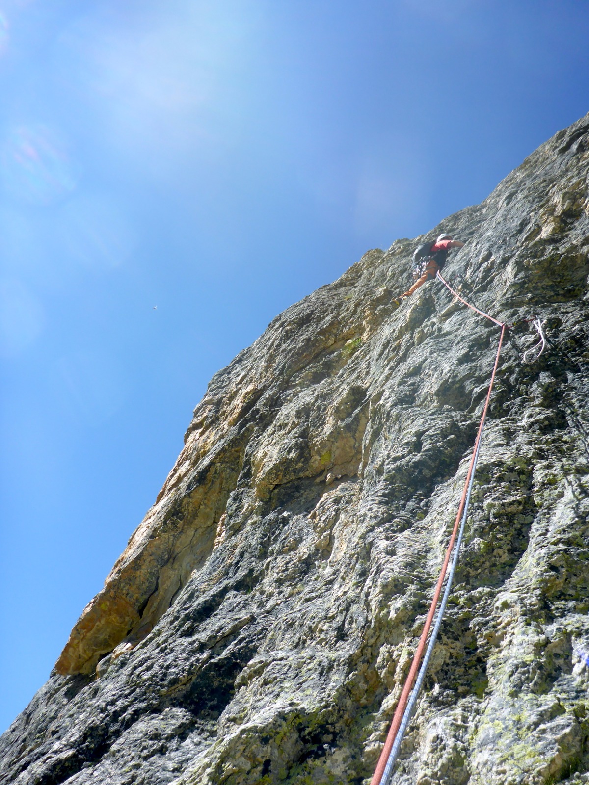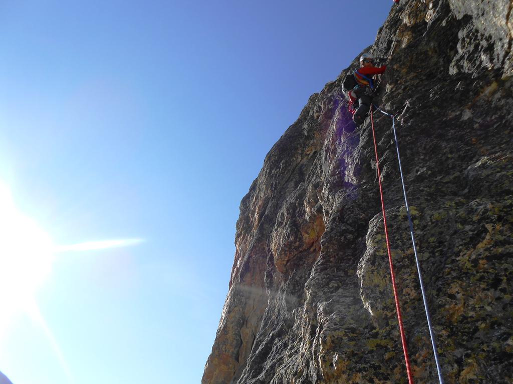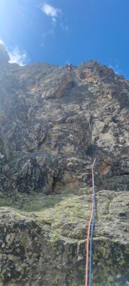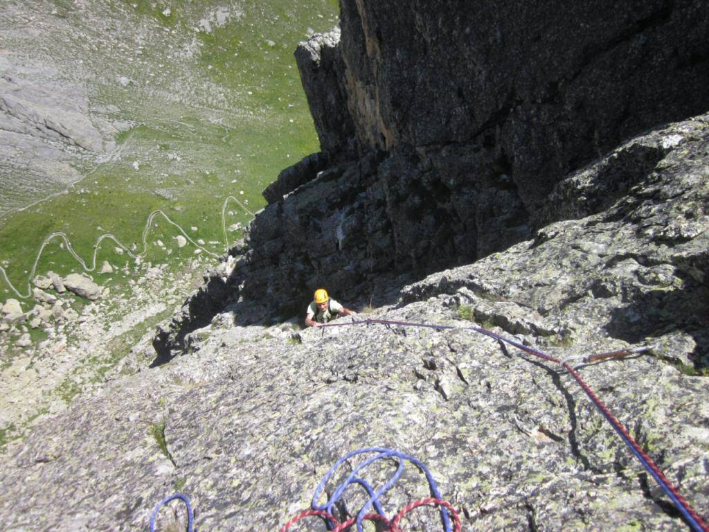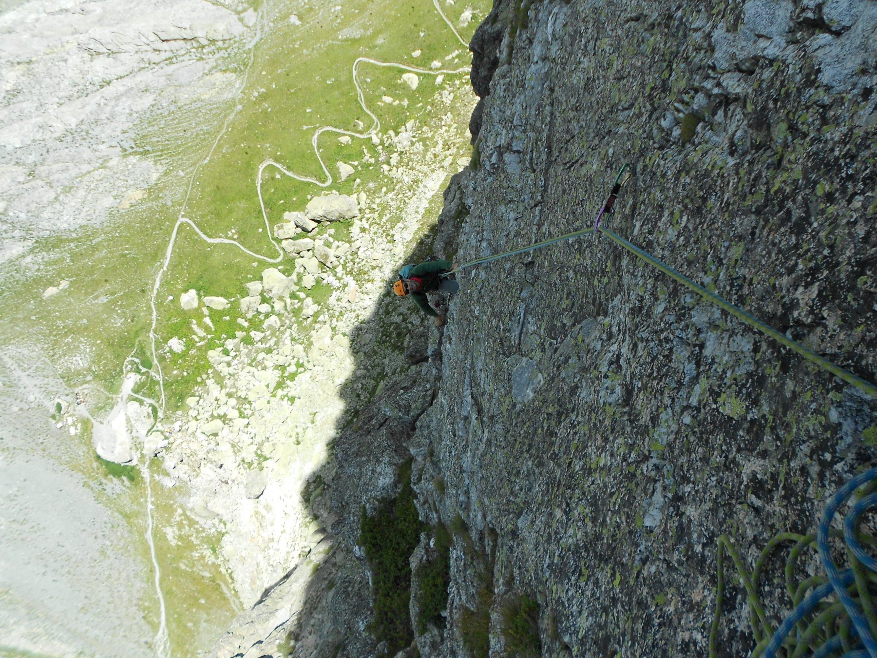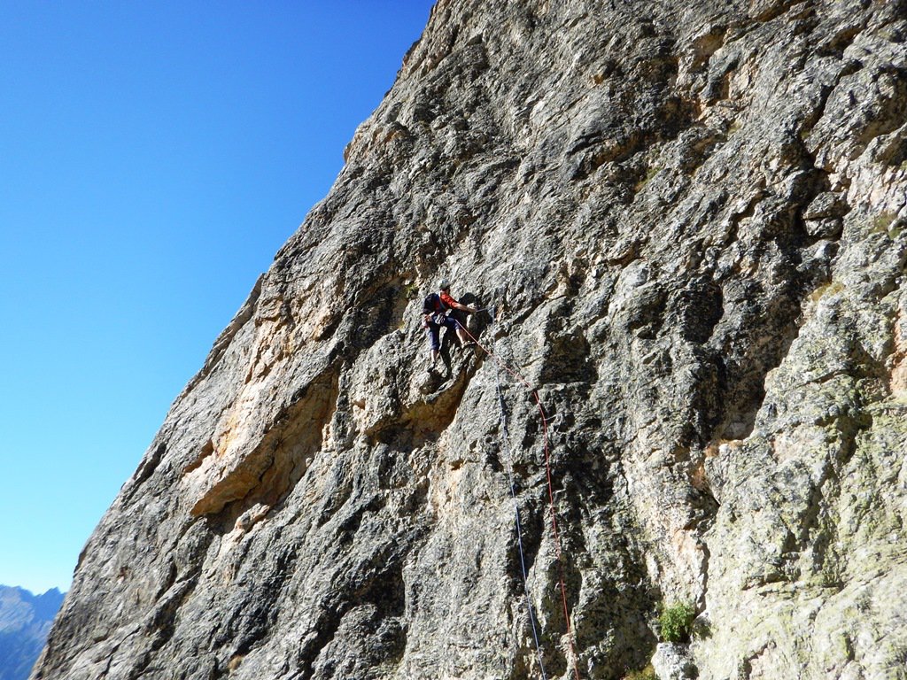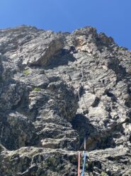 Dalla quarta sosta, in verticale 6/8mt. poi a sx per doppiare lo spigolo(cordino tra rocce), quindi su dritti. NON puntare a dx verso fettuccia viola con maillon.