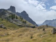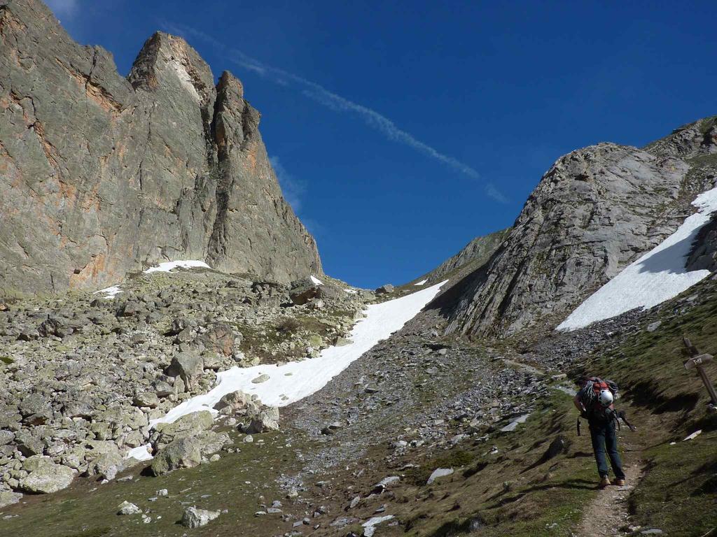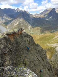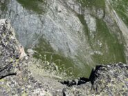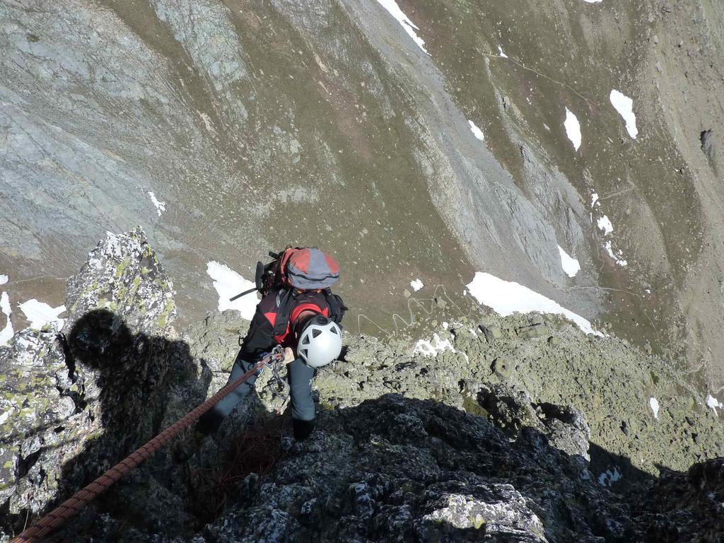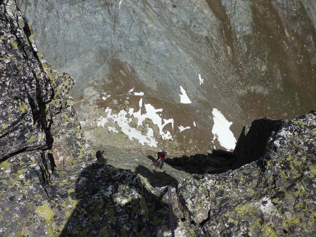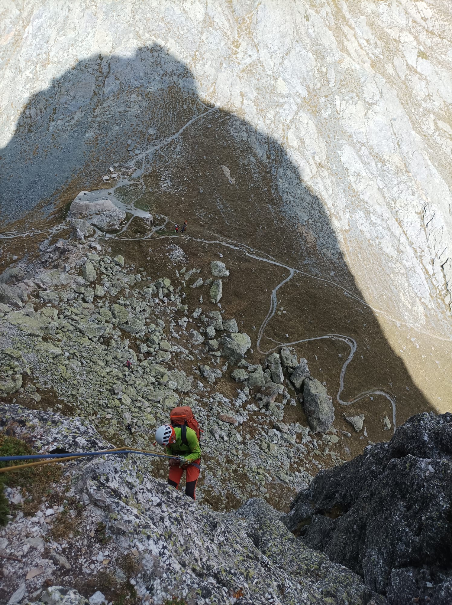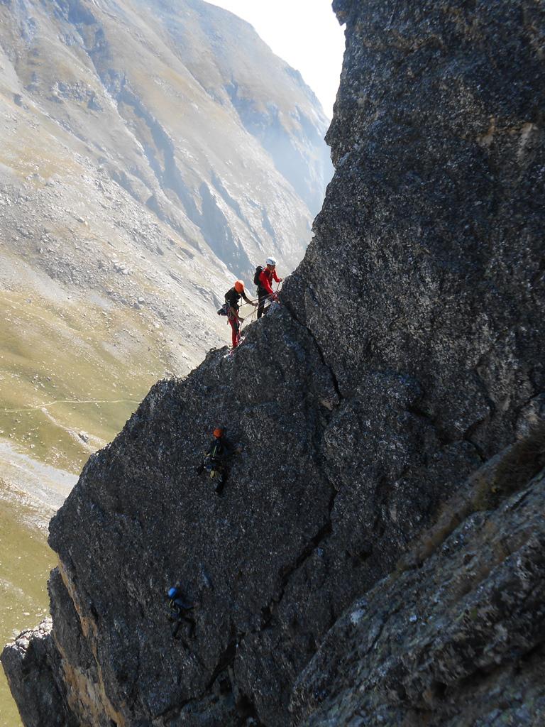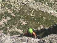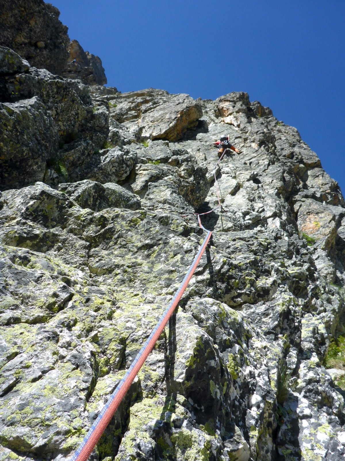 Dalla quarta sosta, in verticale 6/8mt. poi a sx per doppiare lo spigolo(cordino tra rocce), quindi su dritti. NON puntare a dx verso fettuccia viola con maillon.