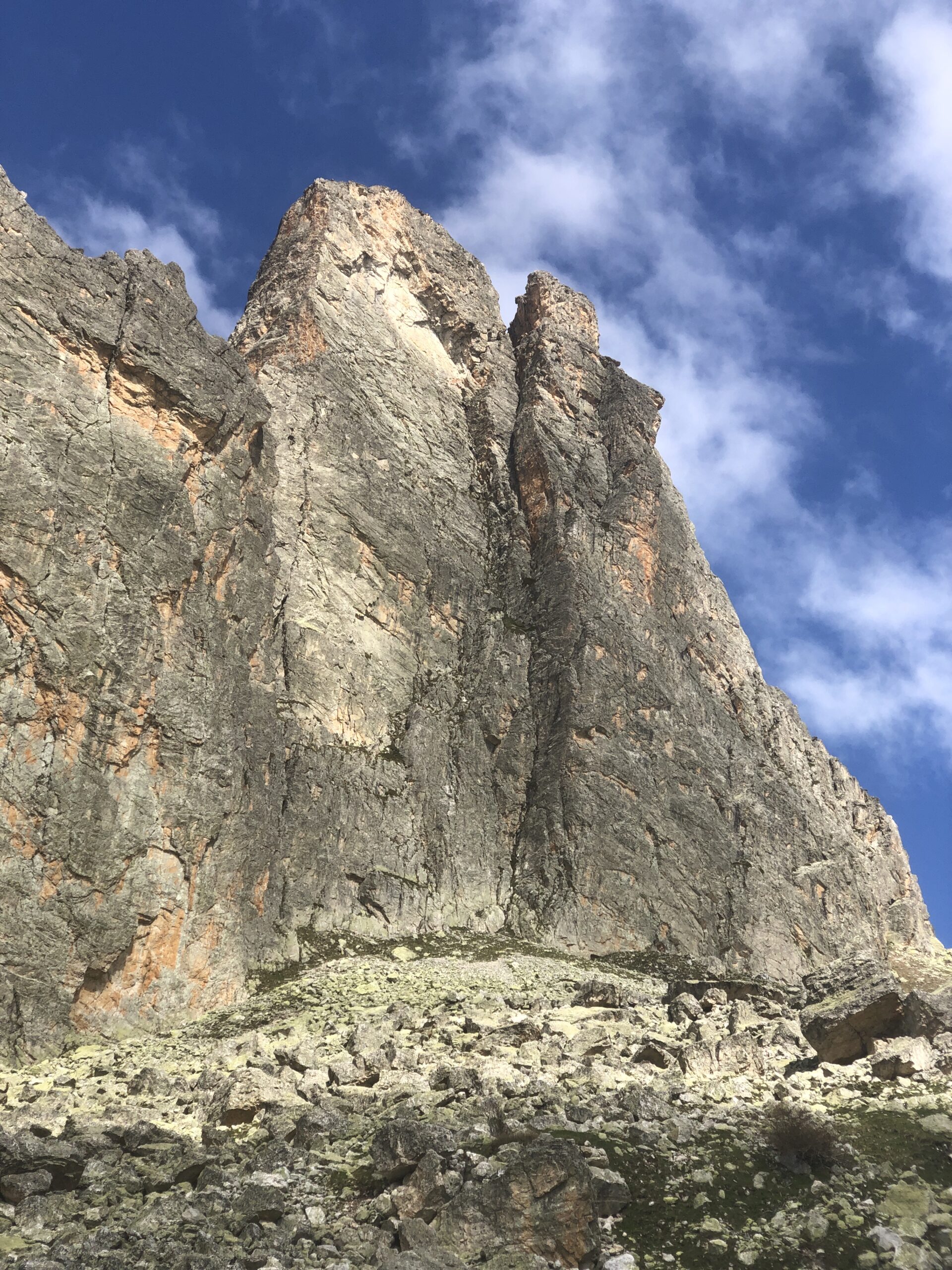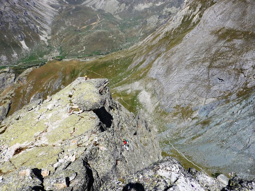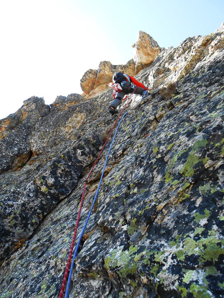 - L6 – Tiro non difficile, ma mai banale. Placca poi puntare verso dx per facile uscita a pochi metri dalla cima. Sosta Su spit e catenaIV/IV+ poi III