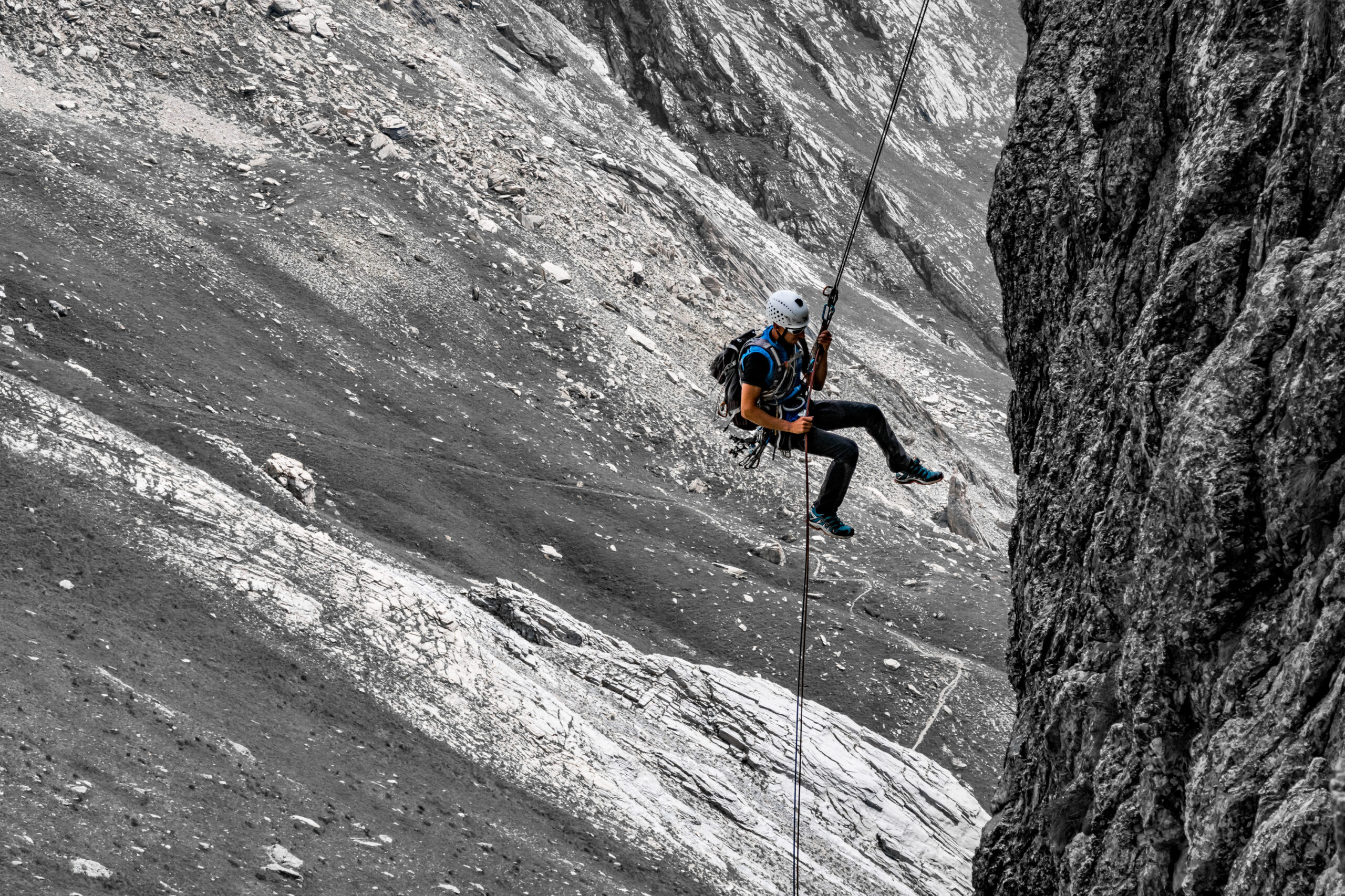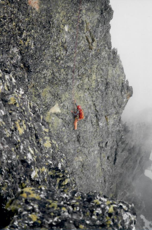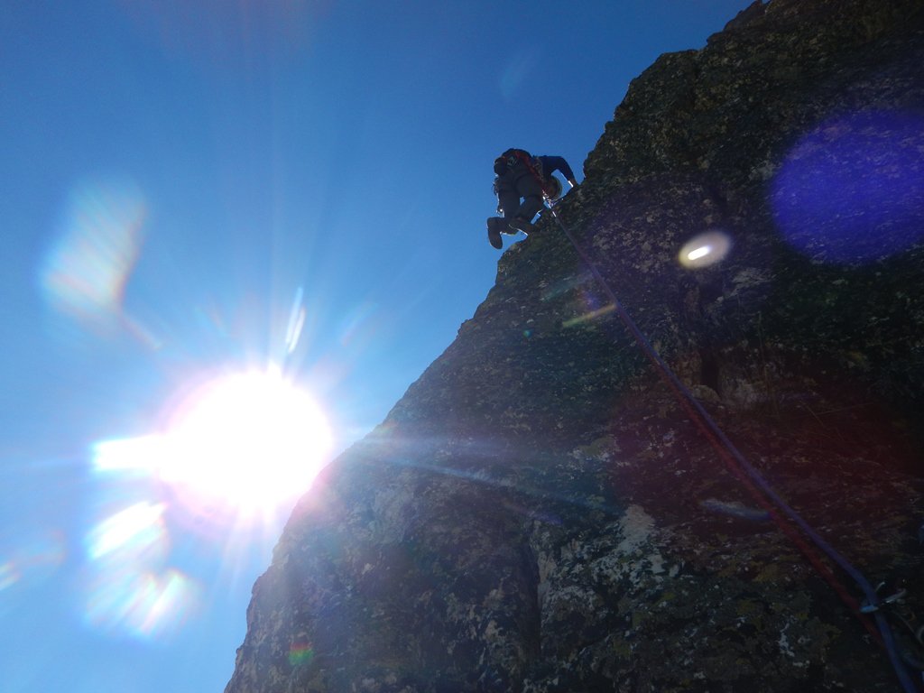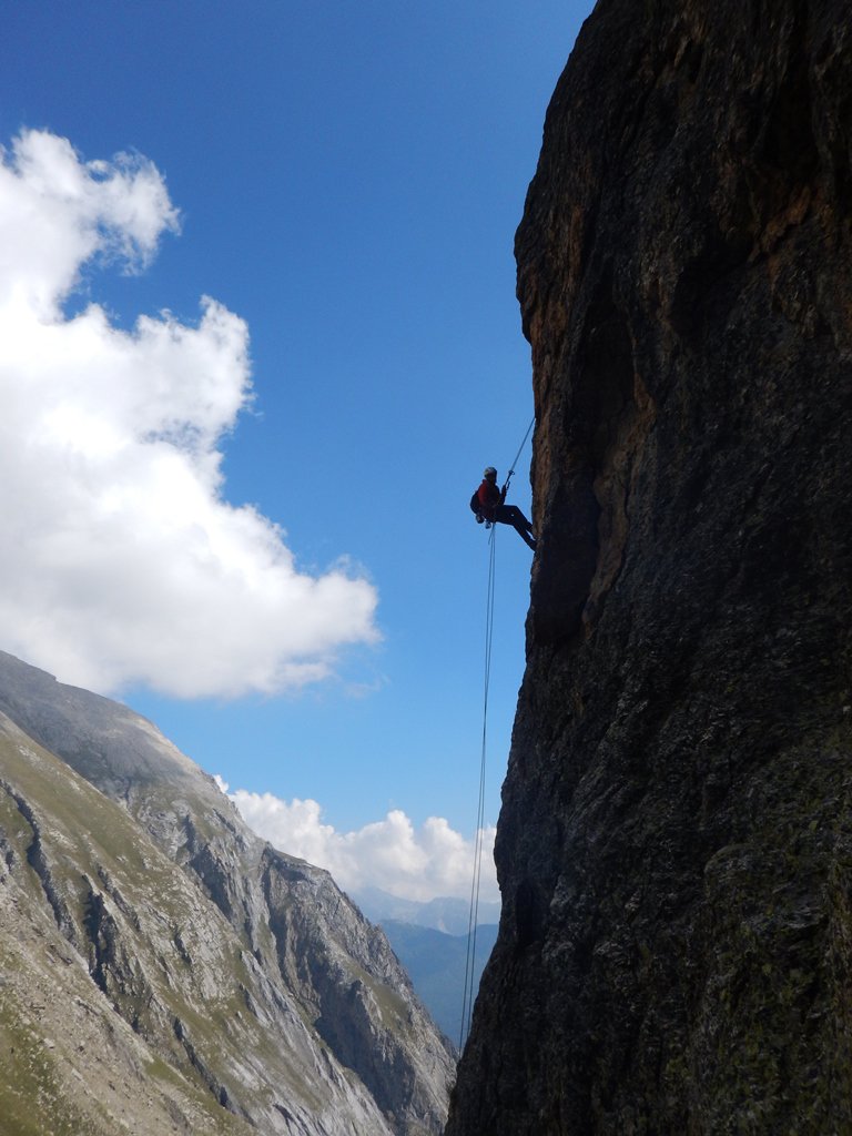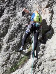 Calata sulla via oppure dal canale della via normale. Ancoraggio con spit e catena. Attenzione: alla seconda calata, tenersi su quella contro parete. NON dove cavi d’acciaio. Rischio di incastrare le corde.