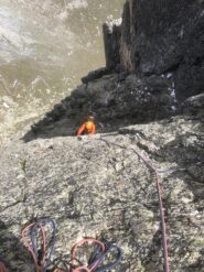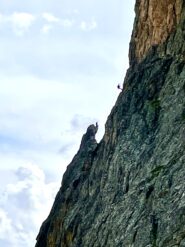 - L1- Interessante ed abbastanza impegnativa. Sosta a spit dietro uno spigolo. V/V-
