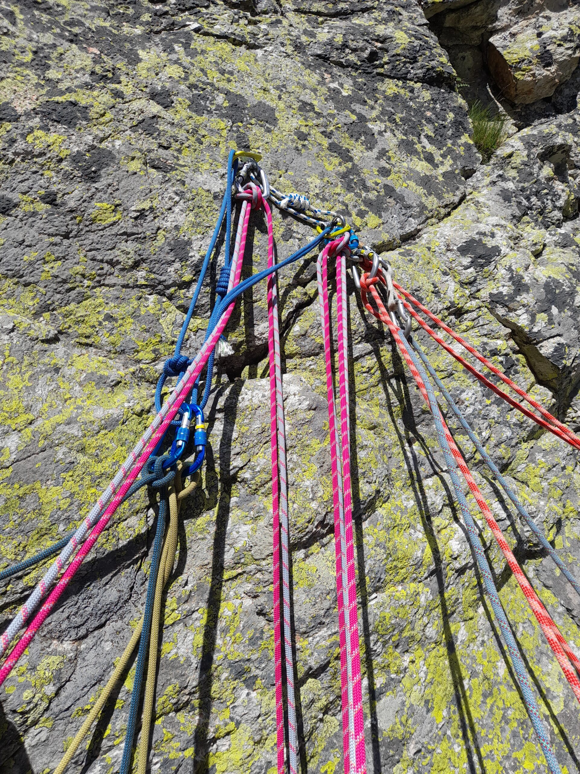 Per la discesa ci sono numerose possibilità di calata, noi abbiamo scelto di calarci sulla via ‘ solo per Bruna” la cui ultima sosta ( in salita) è posta sulla sx in uscita della Sigismondi.