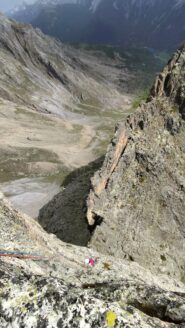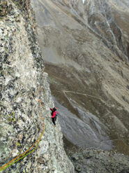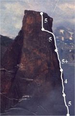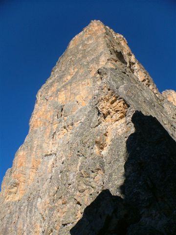 Qui inizia lo spigolo vero e proprio, raggiungibile anche dalla via Fessure Brunilde. - L3: Traversare a destra del filo, quasi fin sotto uno strapiombo biancastro (molti ch. e il filetto di un fix, V e passo di V+), quindi traversare a sinistra verso il filo (vecchia sosta su 3 ch.) e seguirlo (spit e ch.) fino ad un esiguo terrazzino (S3, 30m).