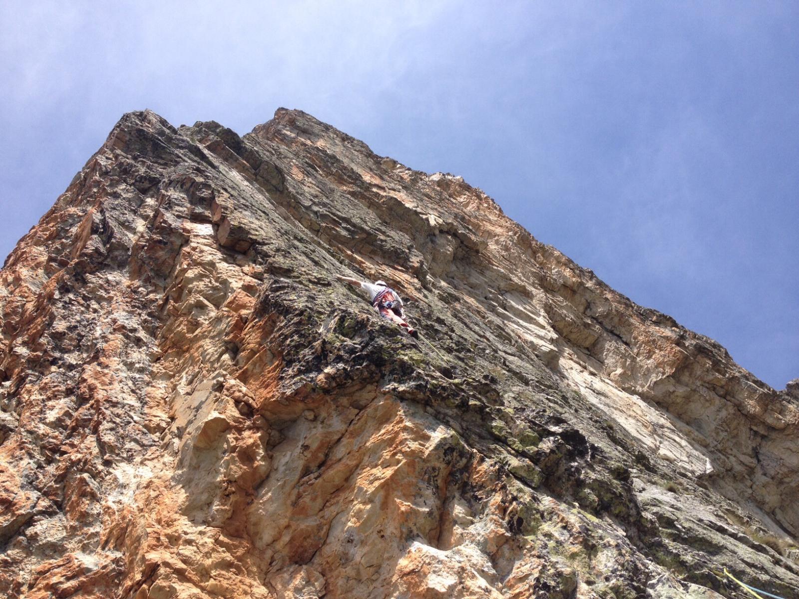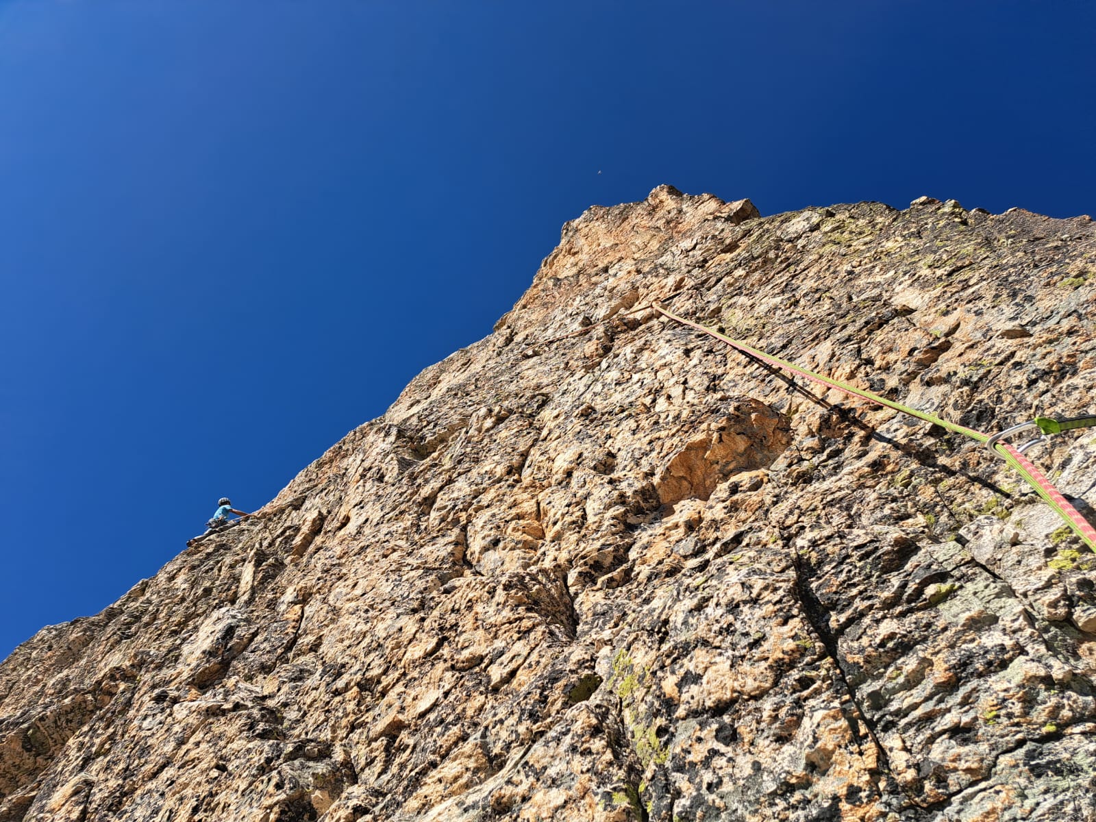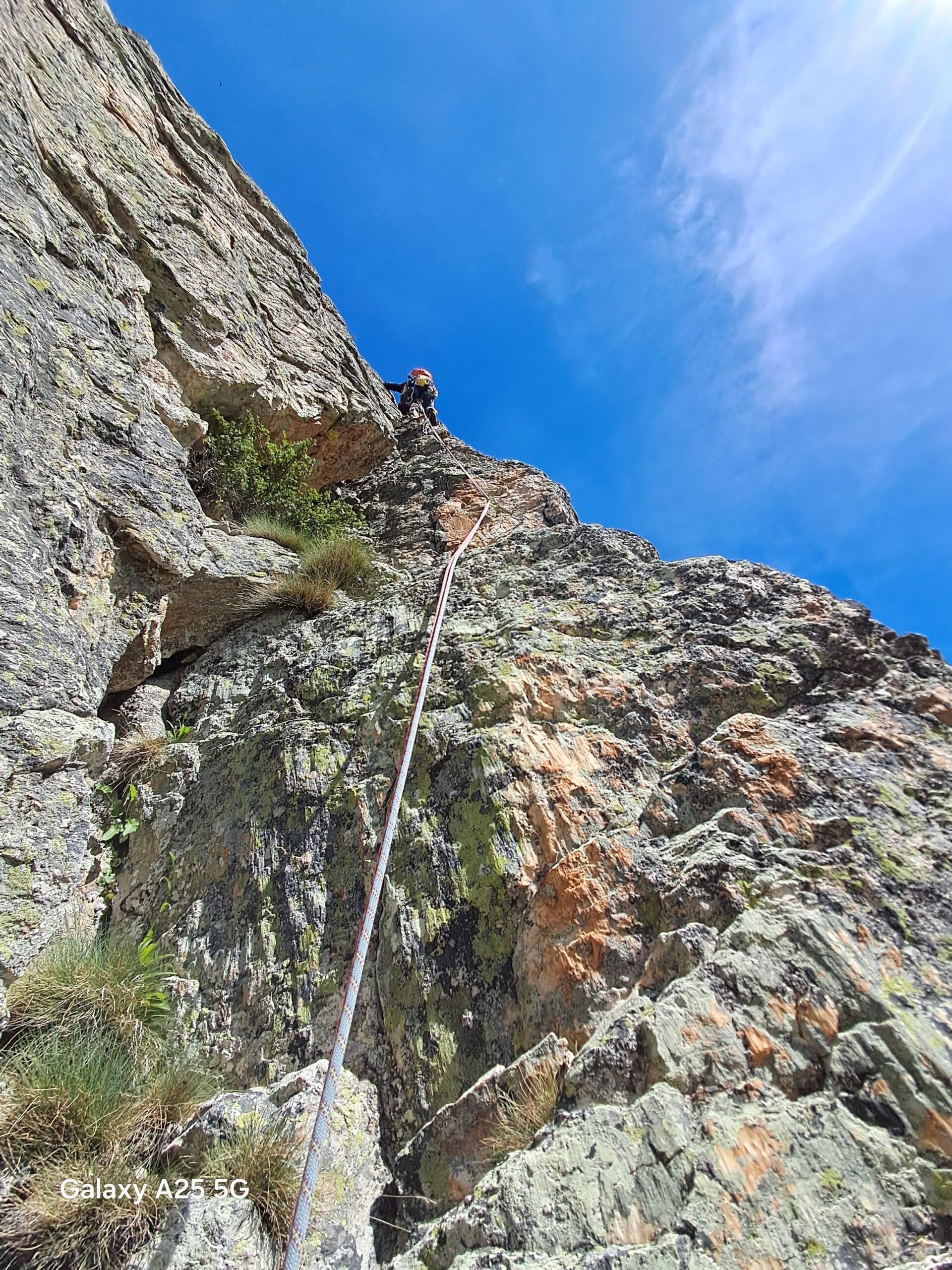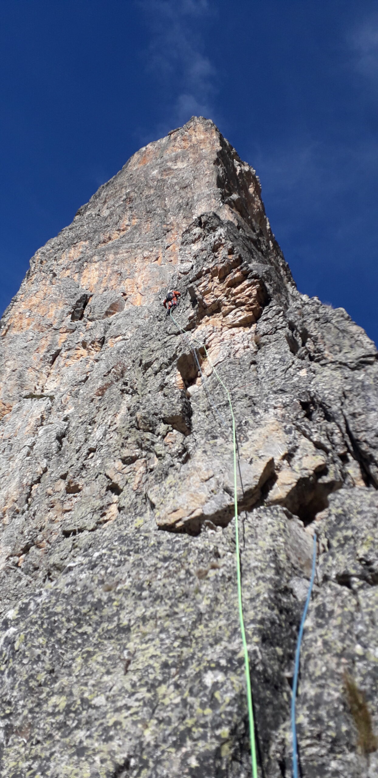 - L1: Salire sulla destra del filo di spigolo fino ad un terrazzino (S1. 30m III+). Sconsigliato saltare questa sosta.