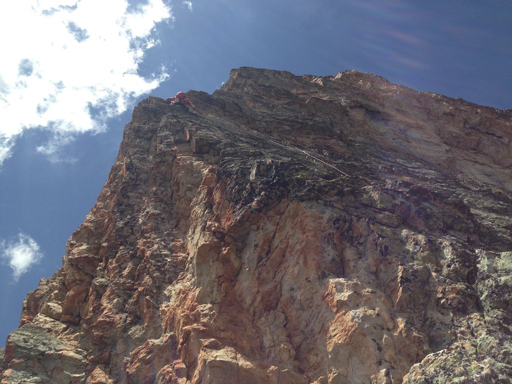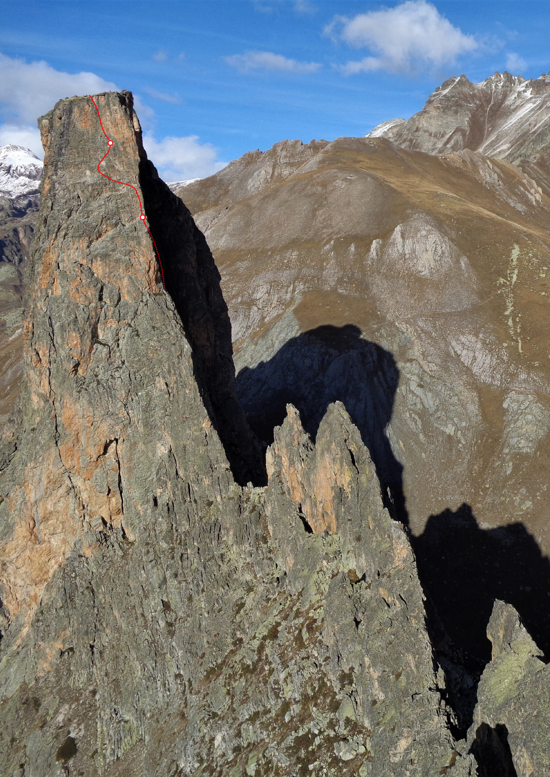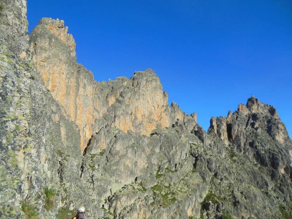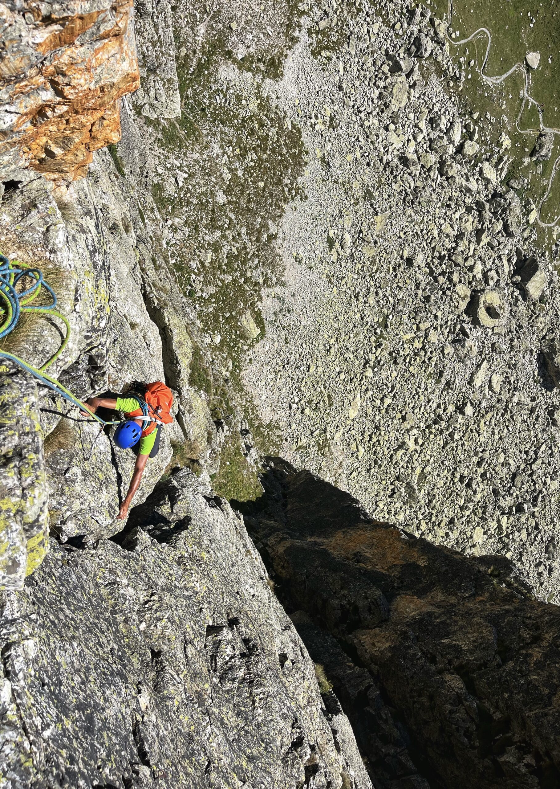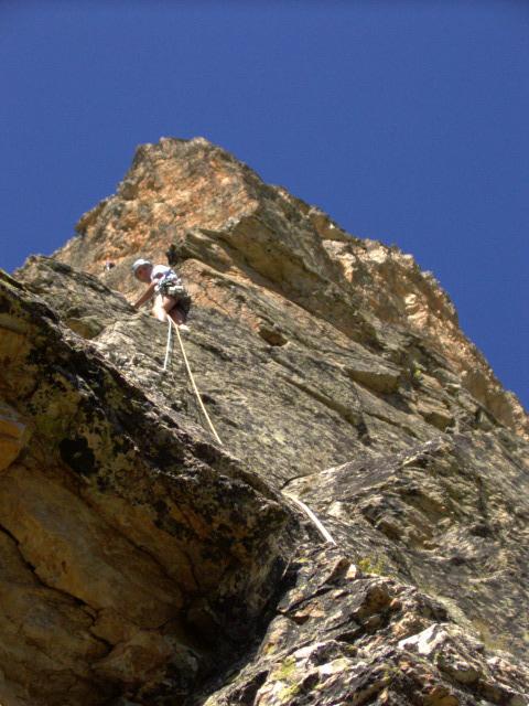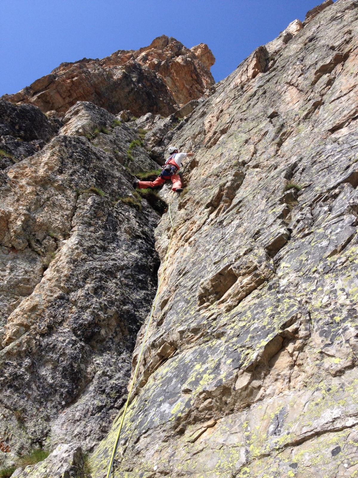 - L1: Salire sulla destra del filo di spigolo fino ad un terrazzino (S1. 30m III+). Sconsigliato saltare questa sosta.