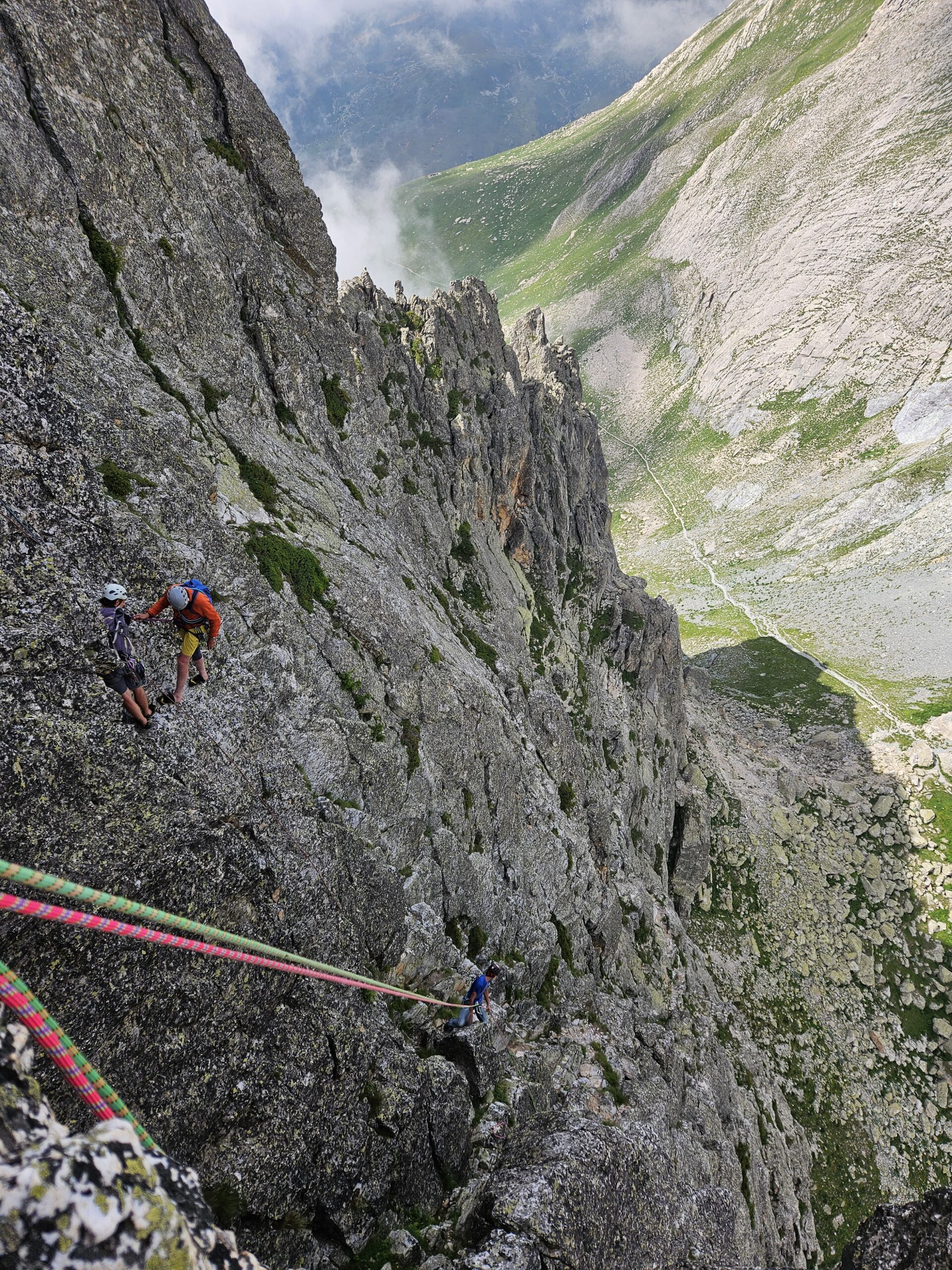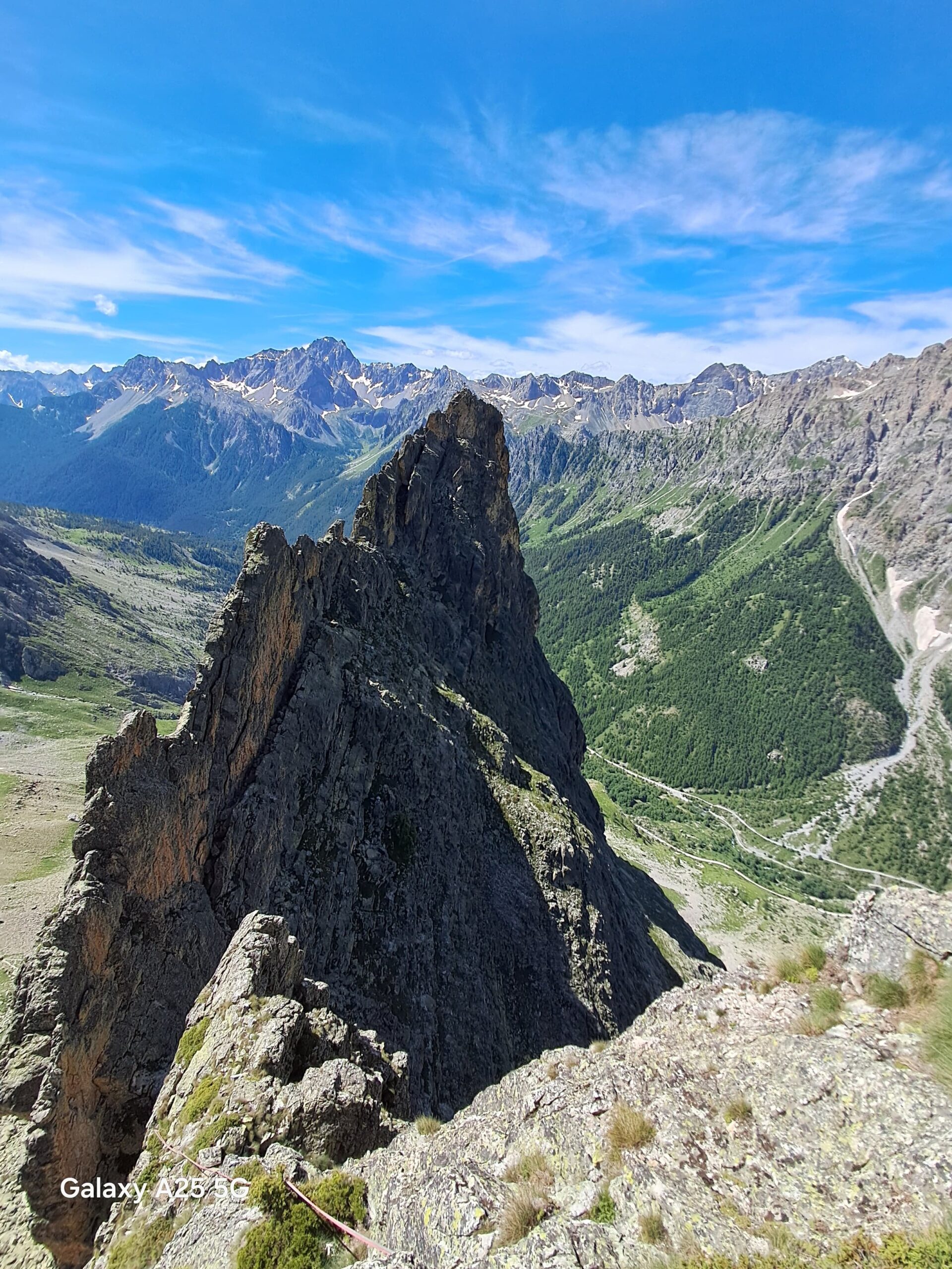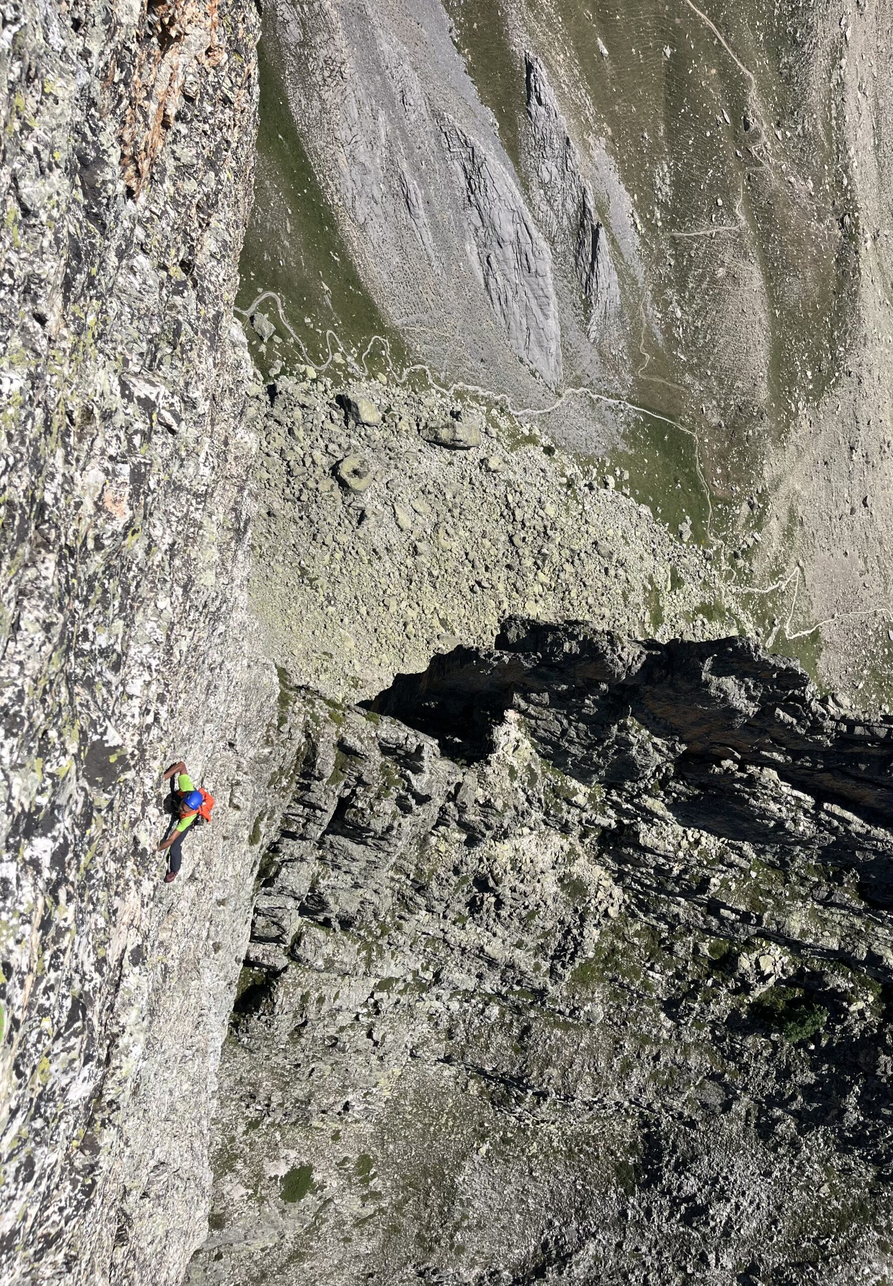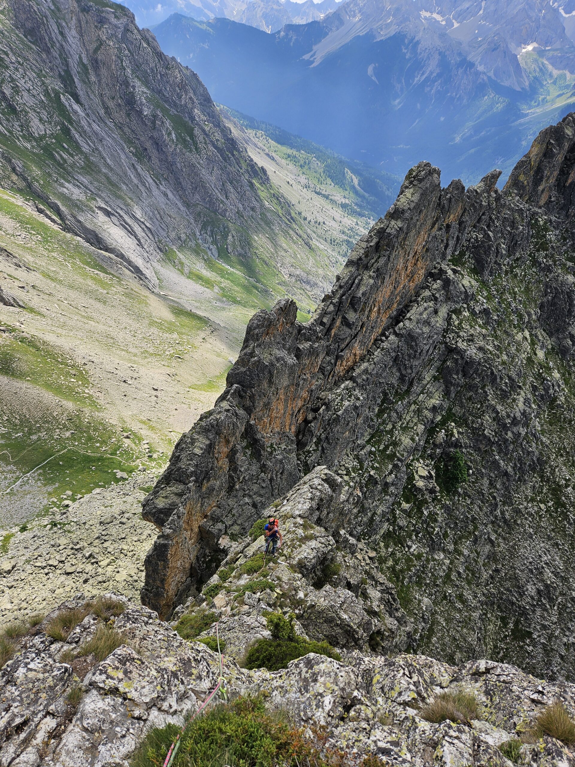 - L1: Salire sulla destra del filo di spigolo fino ad un terrazzino (S1. 30m III+). Sconsigliato saltare questa sosta.