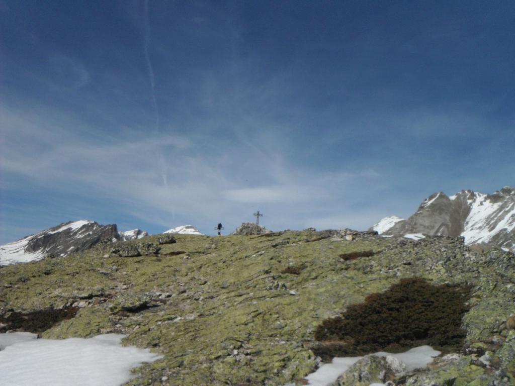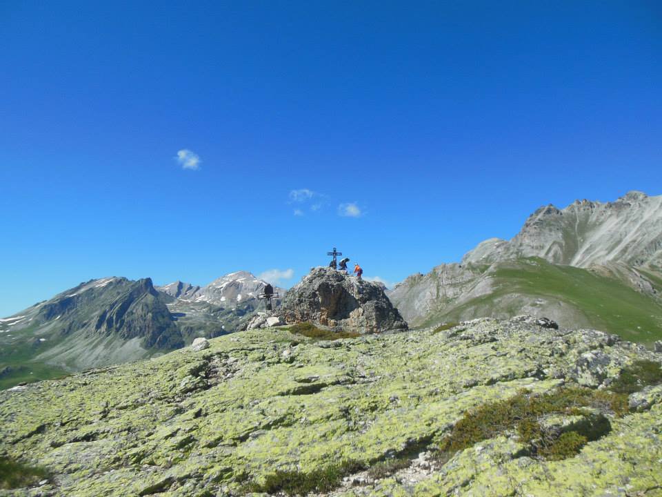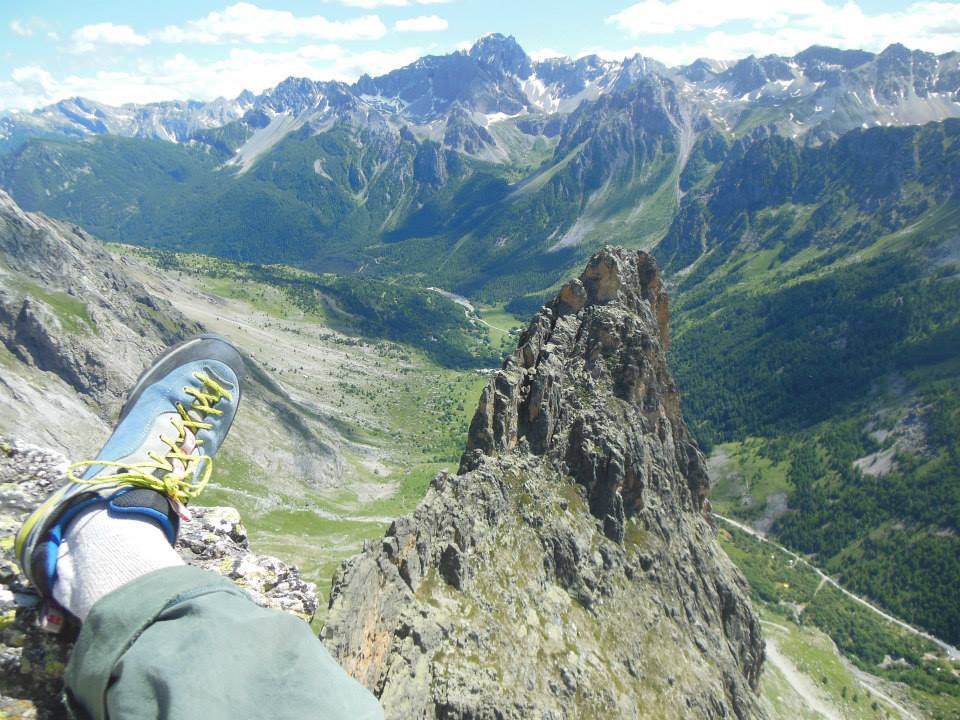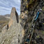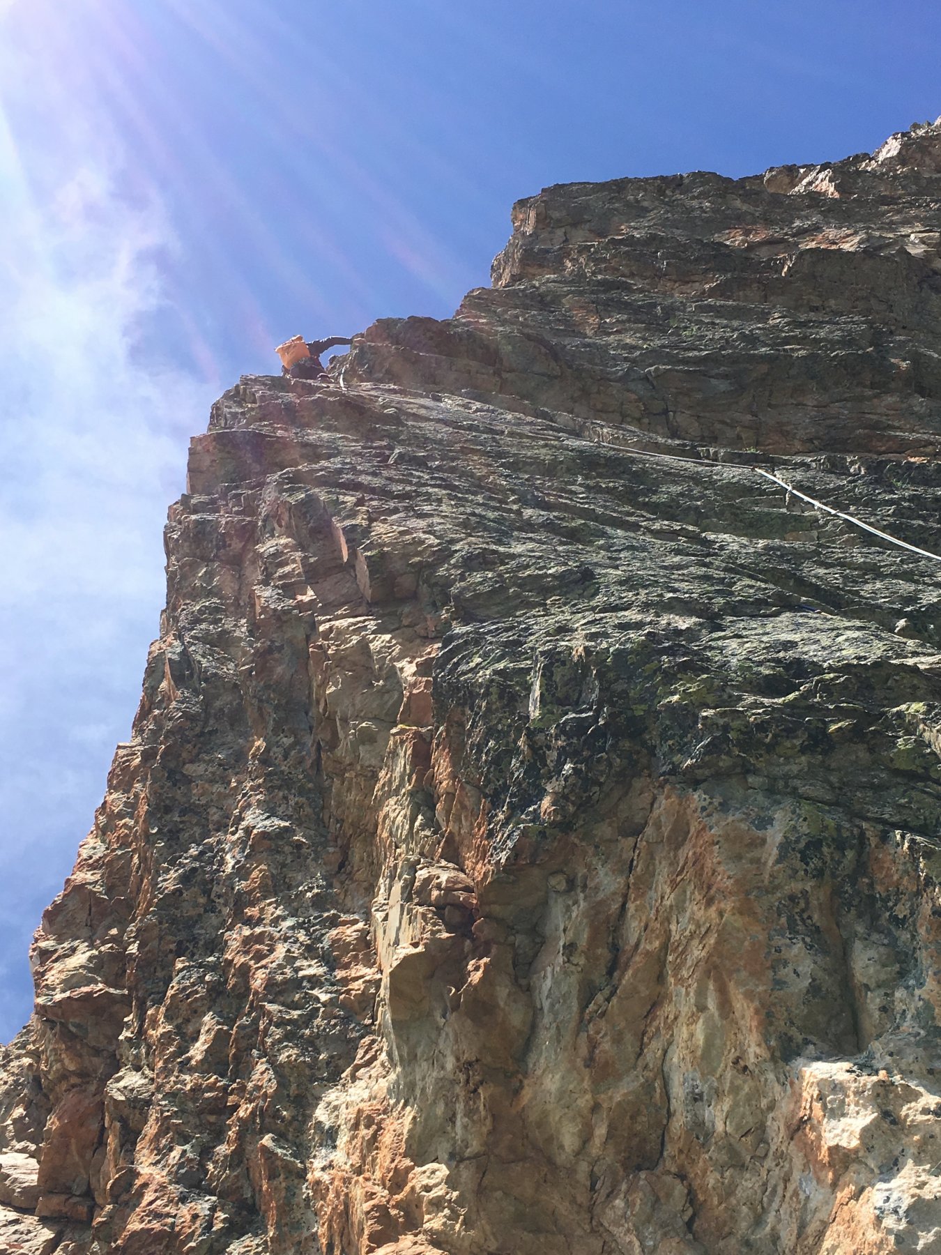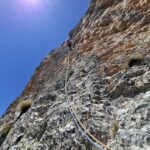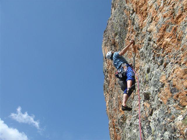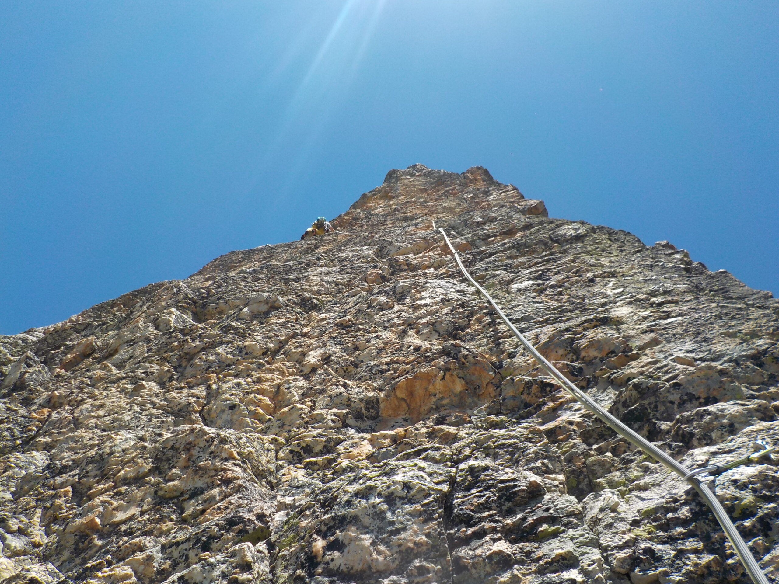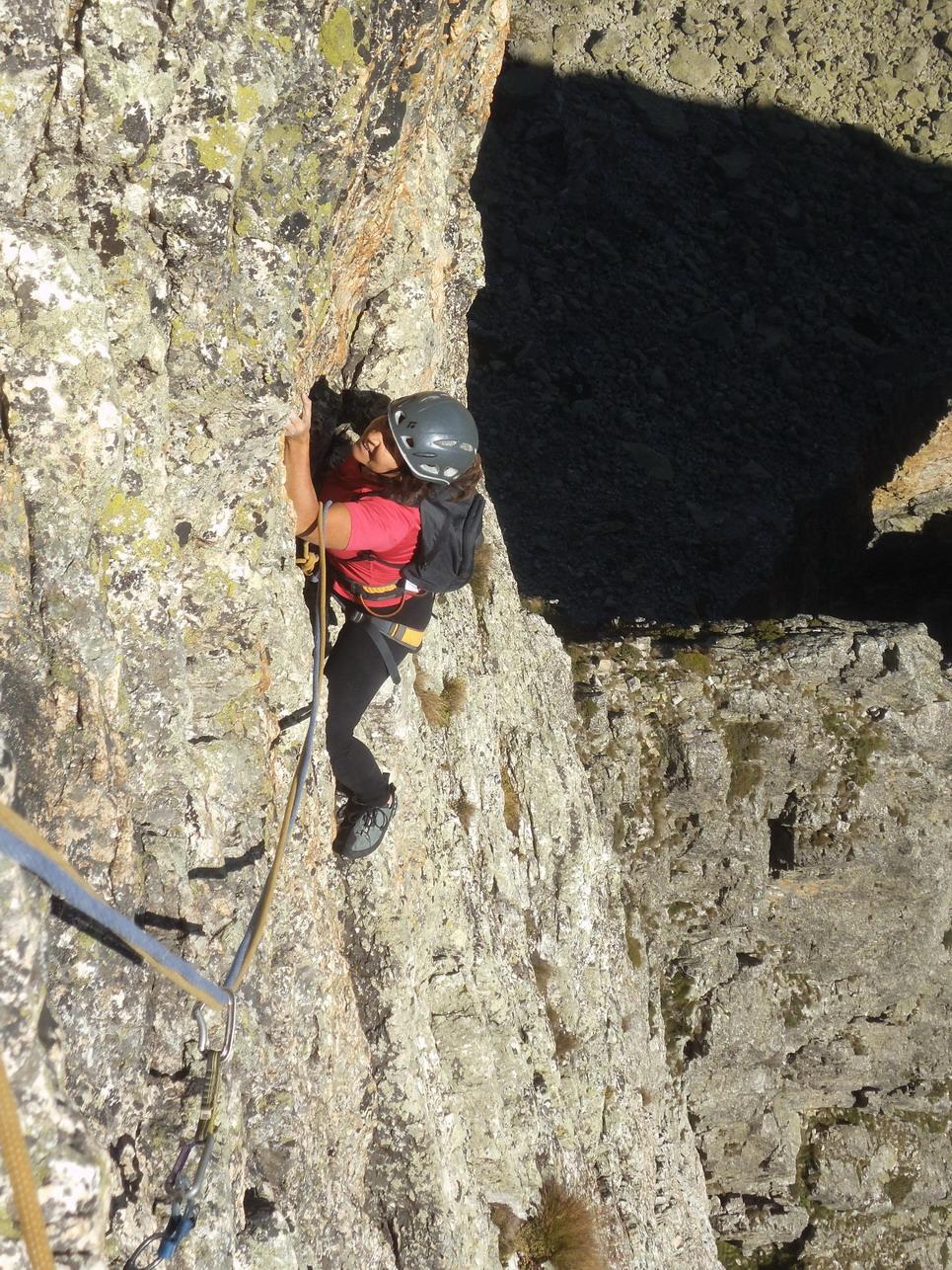 - L5: Dalla sosta si supera l’ultimo tratto di parete verticale ma ben appigliato (IV+, passo di V, 3 ch. e 1 fix). In ultimo si obliqua a sinistra raggiungendo il pianoro sommitale. (S5, 20m)