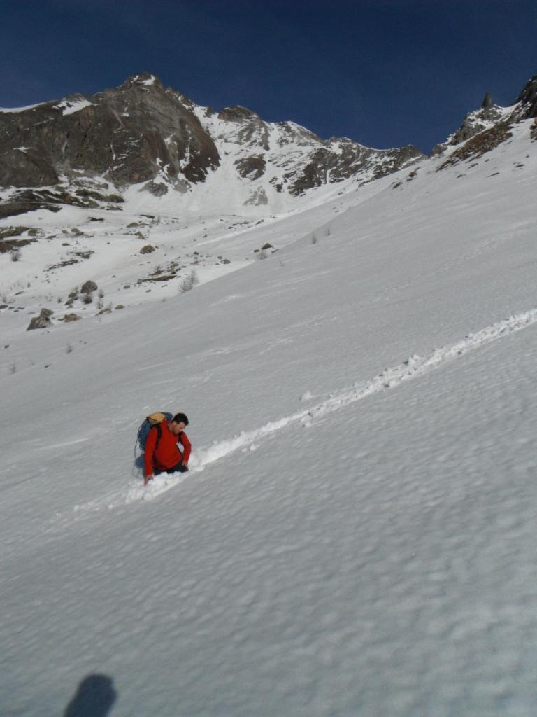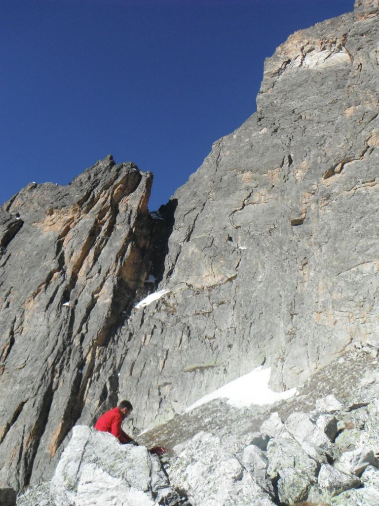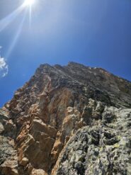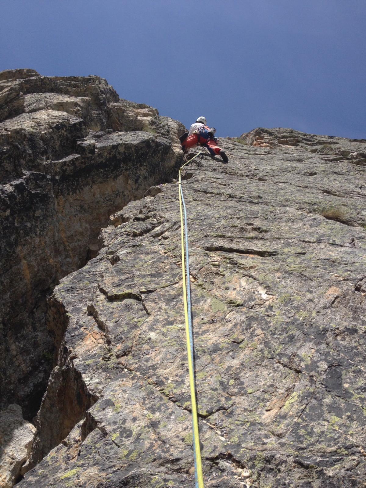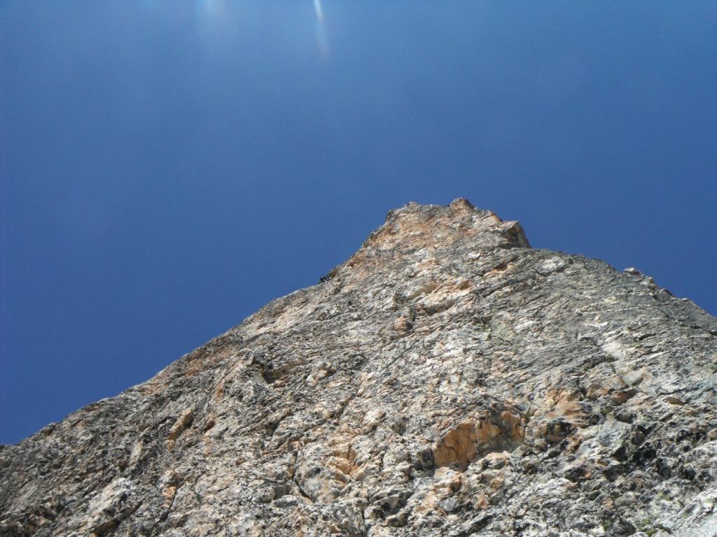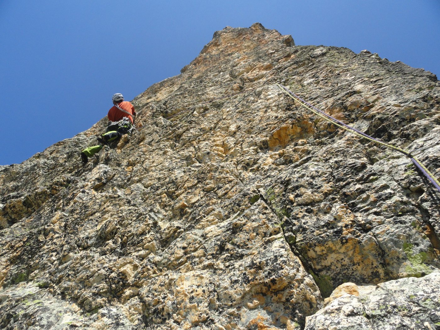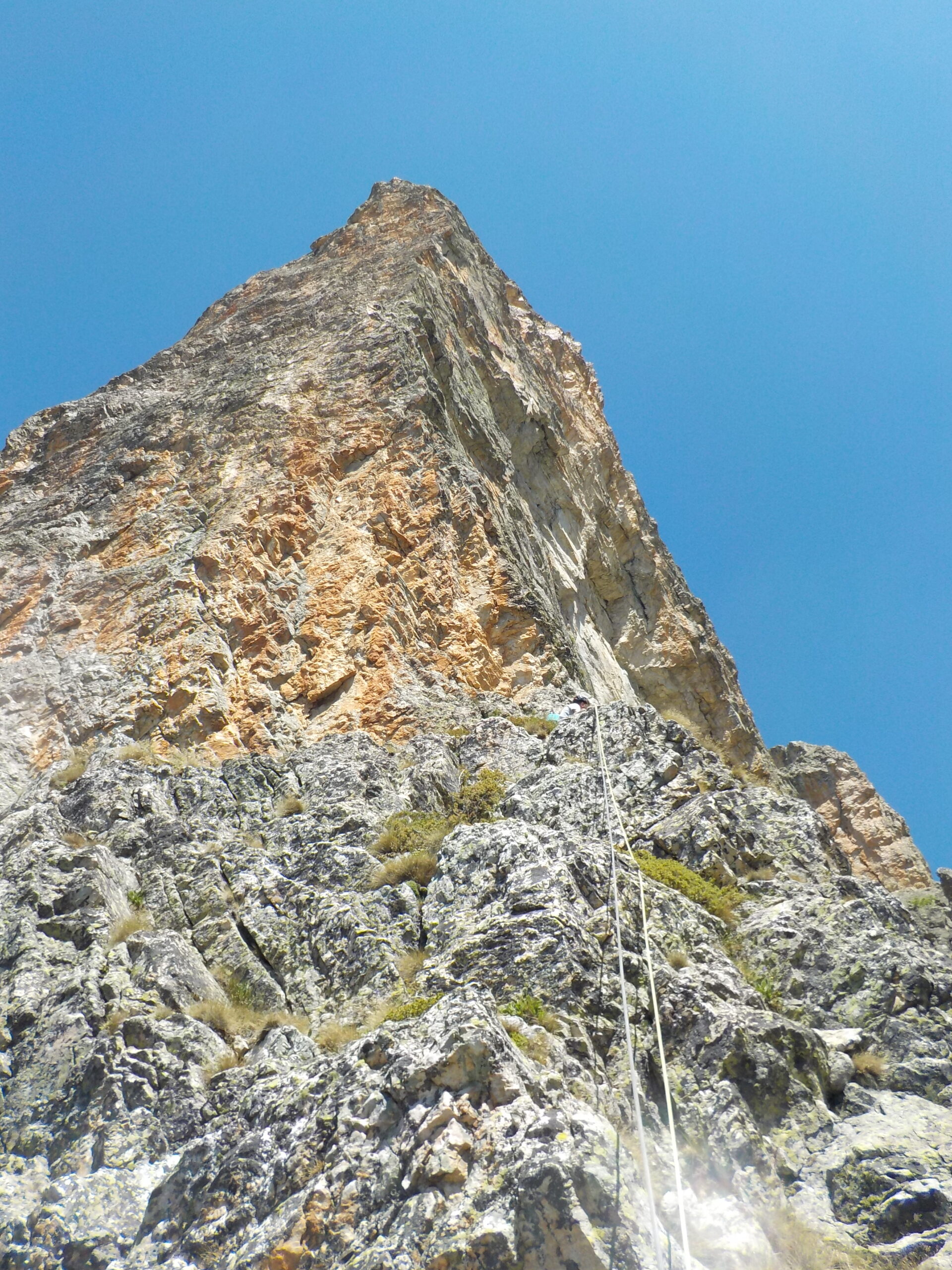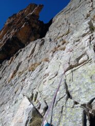 - L2: Traversare sulla sinistra (2 ch.) e salire nel facile fino raggiungere la base dello spigolo vero e proprio (S2. 40m III+).