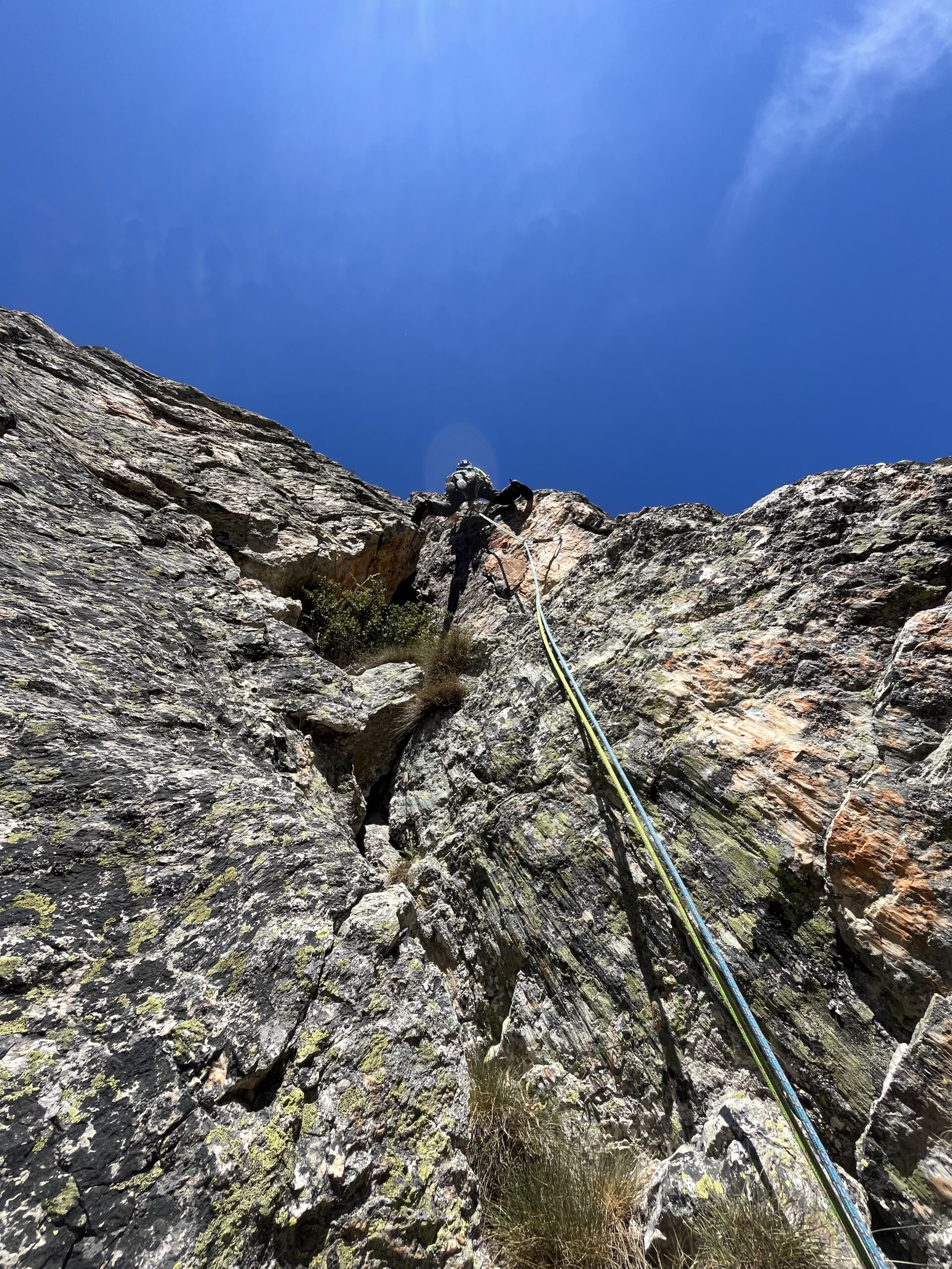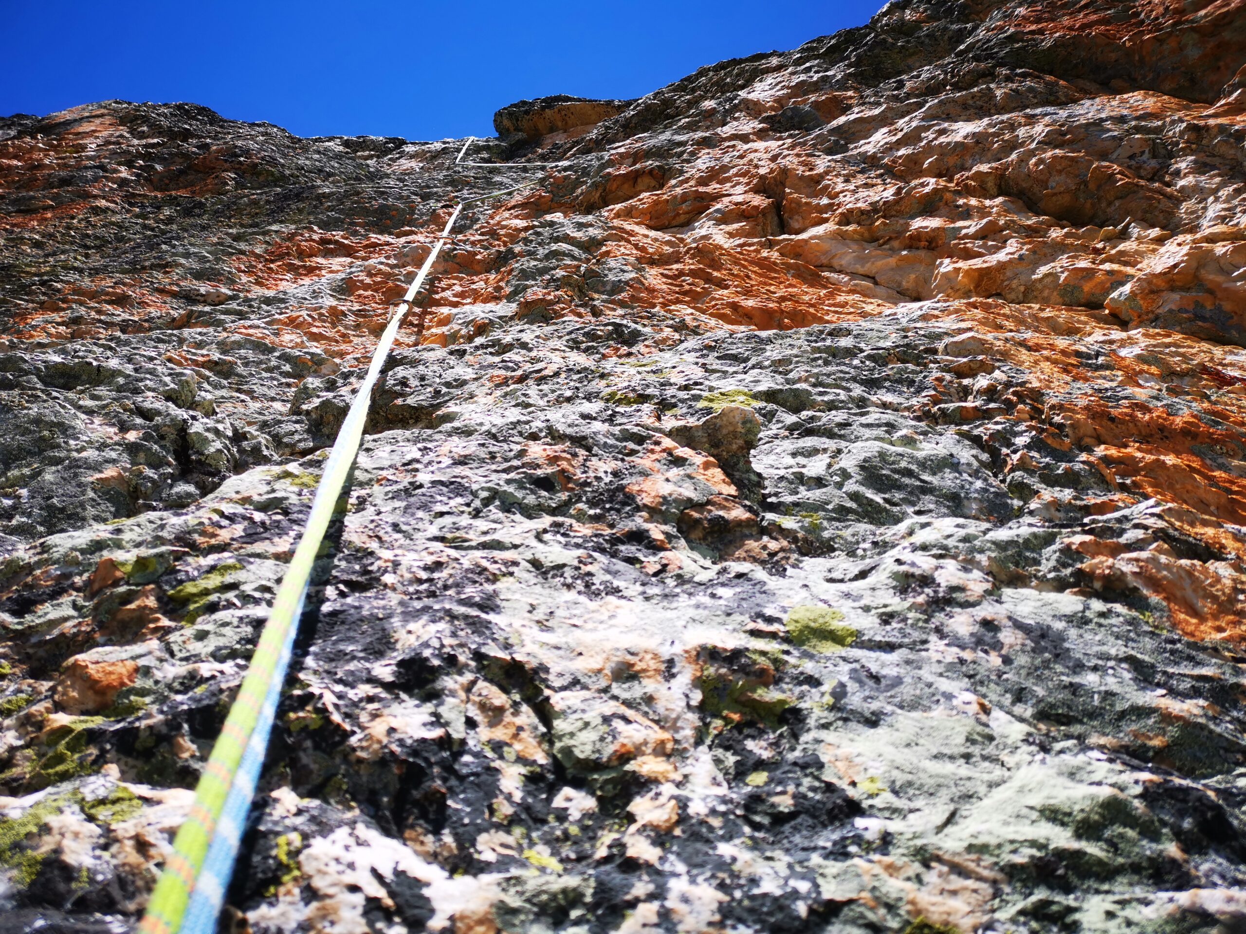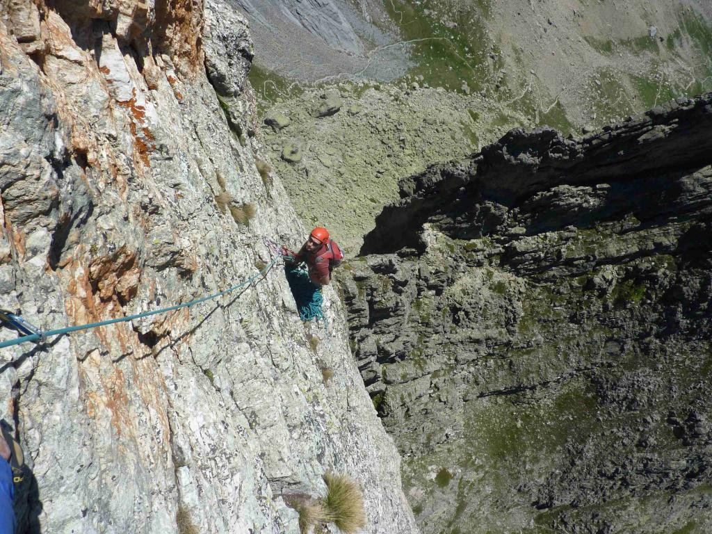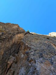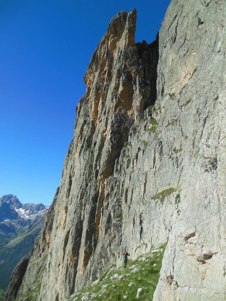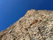 - L4: Salire dritti 3 o 4 metri fino a un primo spit, poi al successivo vecchio chiodo (cordino blu visibile da sotto, V) obliquare a sinistra. Traversare ancora a sinistra (un fix, V) fin sotto un muretto strapiombante. Superarlo in traverso verso sx (V, più ch.) poi, sfruttando buone prese, salire nuovamente in diagonale a destra (ignorando la vecchia sosta a ch. sulla sx) e continuare 10 m su terreno via via più facile verso la sosta (non visibile da sotto ma individuabile per dei ciuffi d’erba), sotto la verticale di un grande masso-tetto posto in cima alla parete. (S4, 25m).