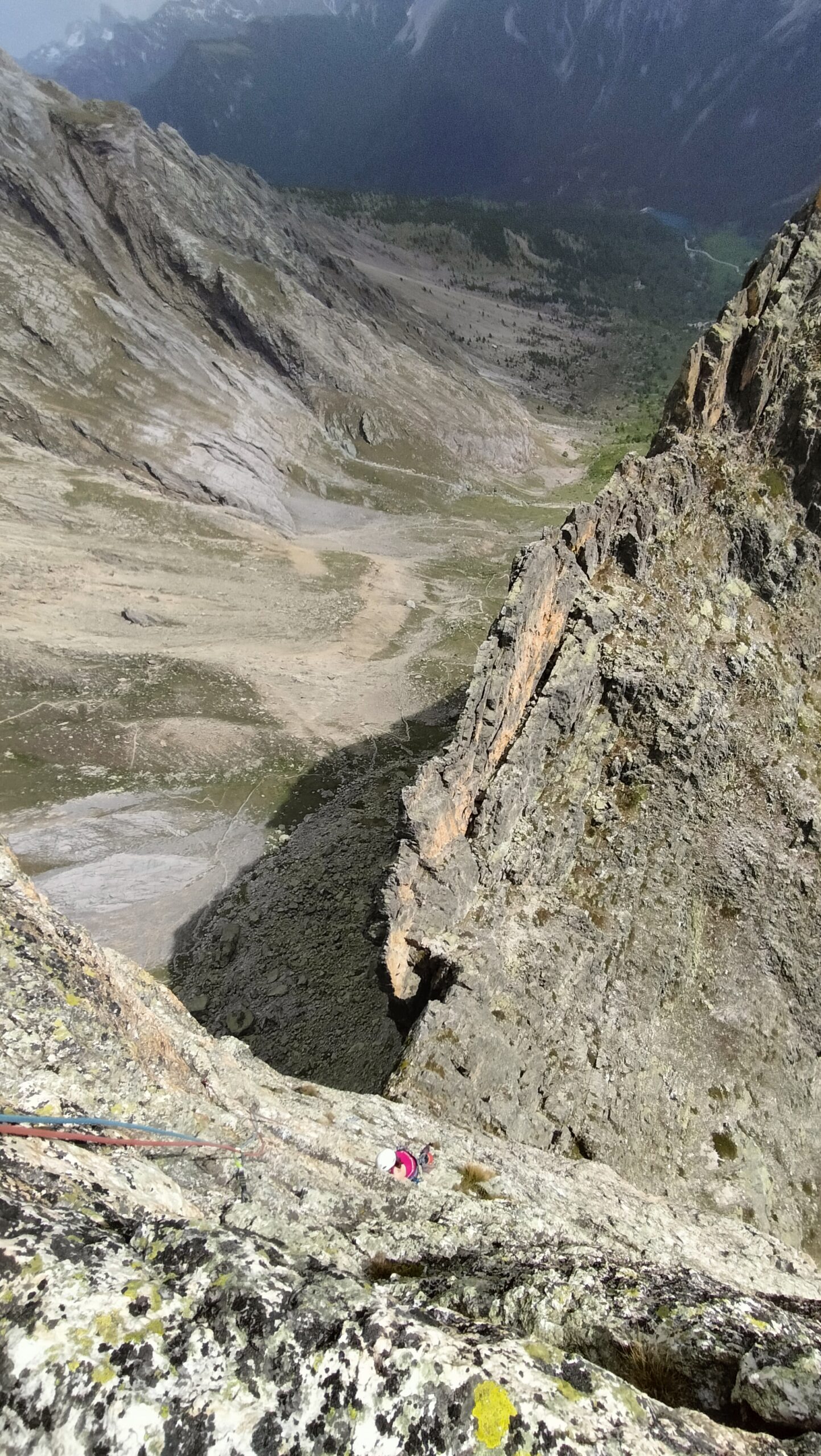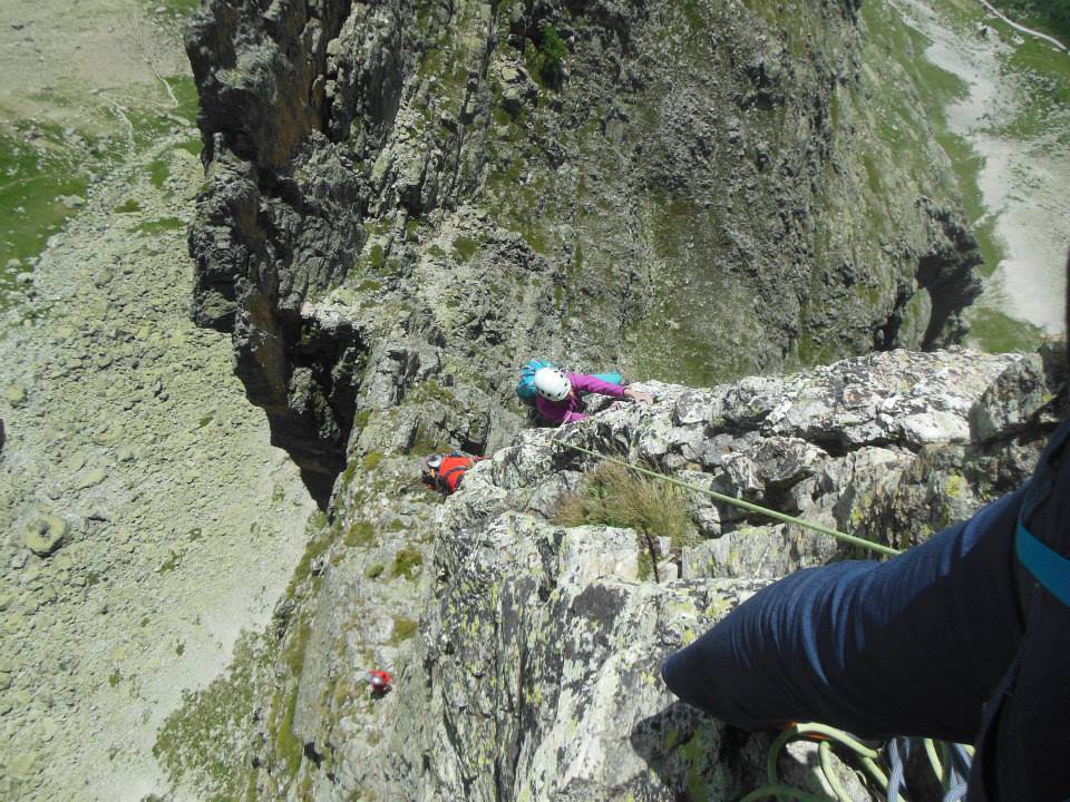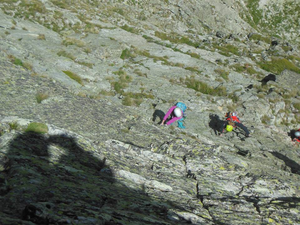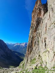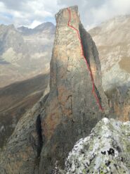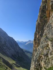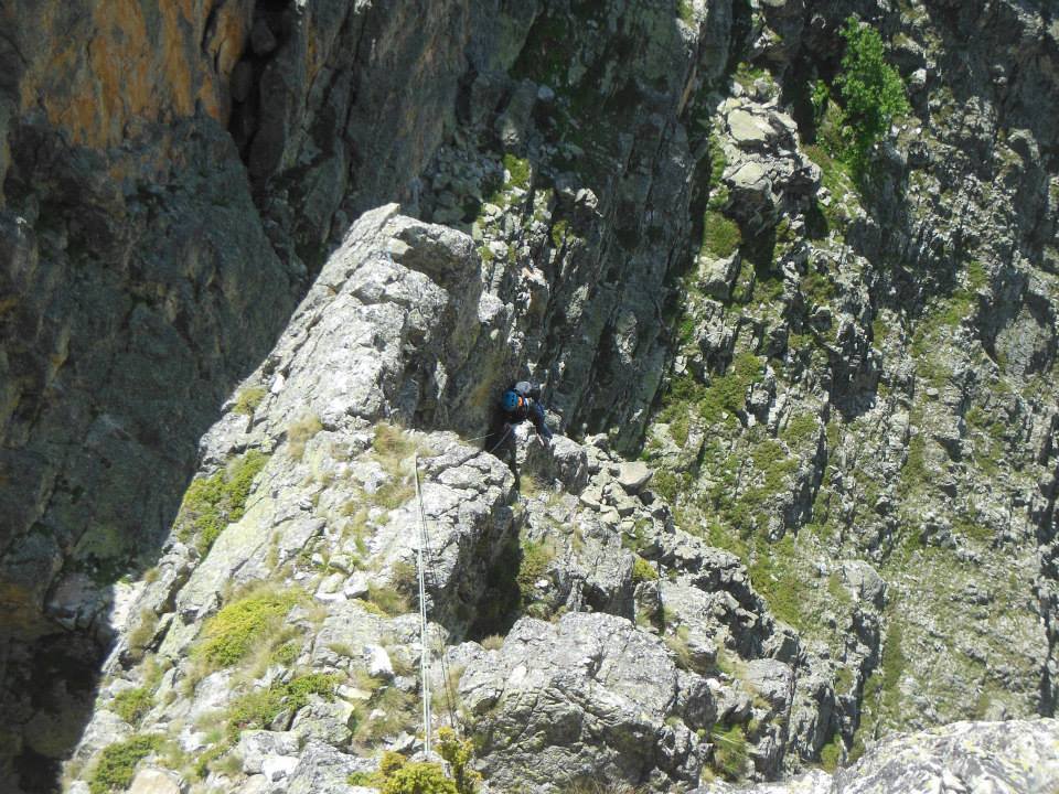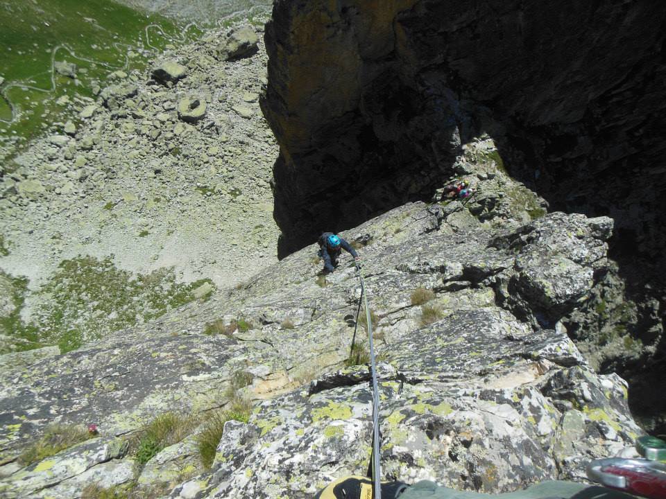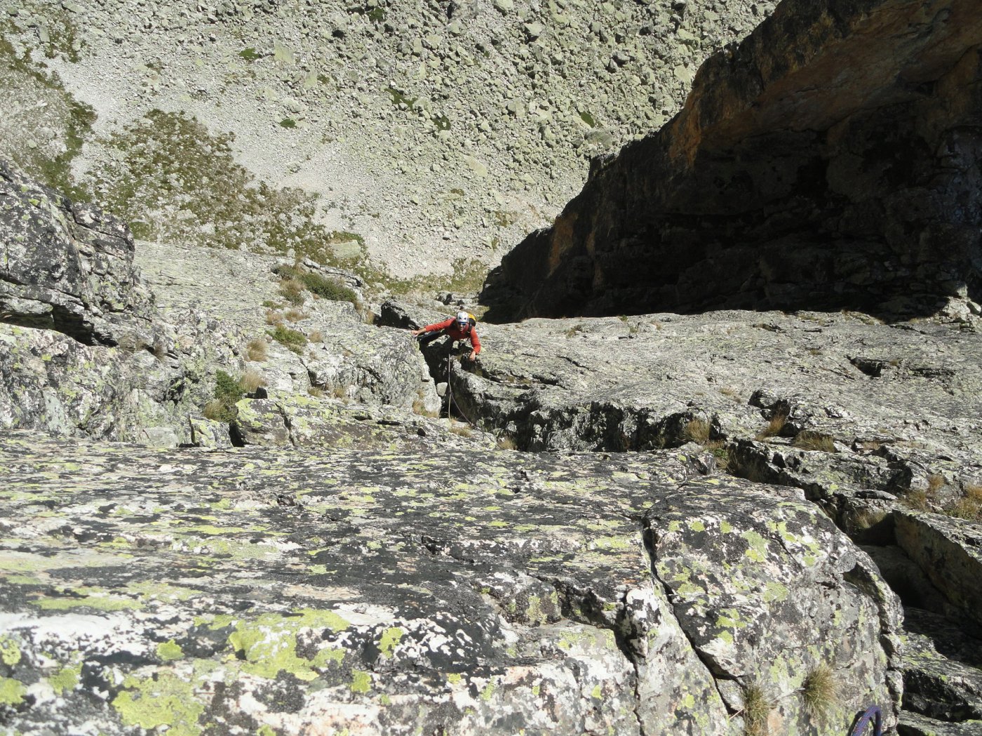 - L3: salire nel camino fino a che non si fa troppo stretto, quindi uscire a destra, passaggio esposto ma protetto da fix. Quindi salire in verticale su rocce più facili seguendo sempre il camino fino ad un esiguo terrazzino di sosta. 30 metri. 5c l’uscita dal camino, poi 5a. Quattro fix.