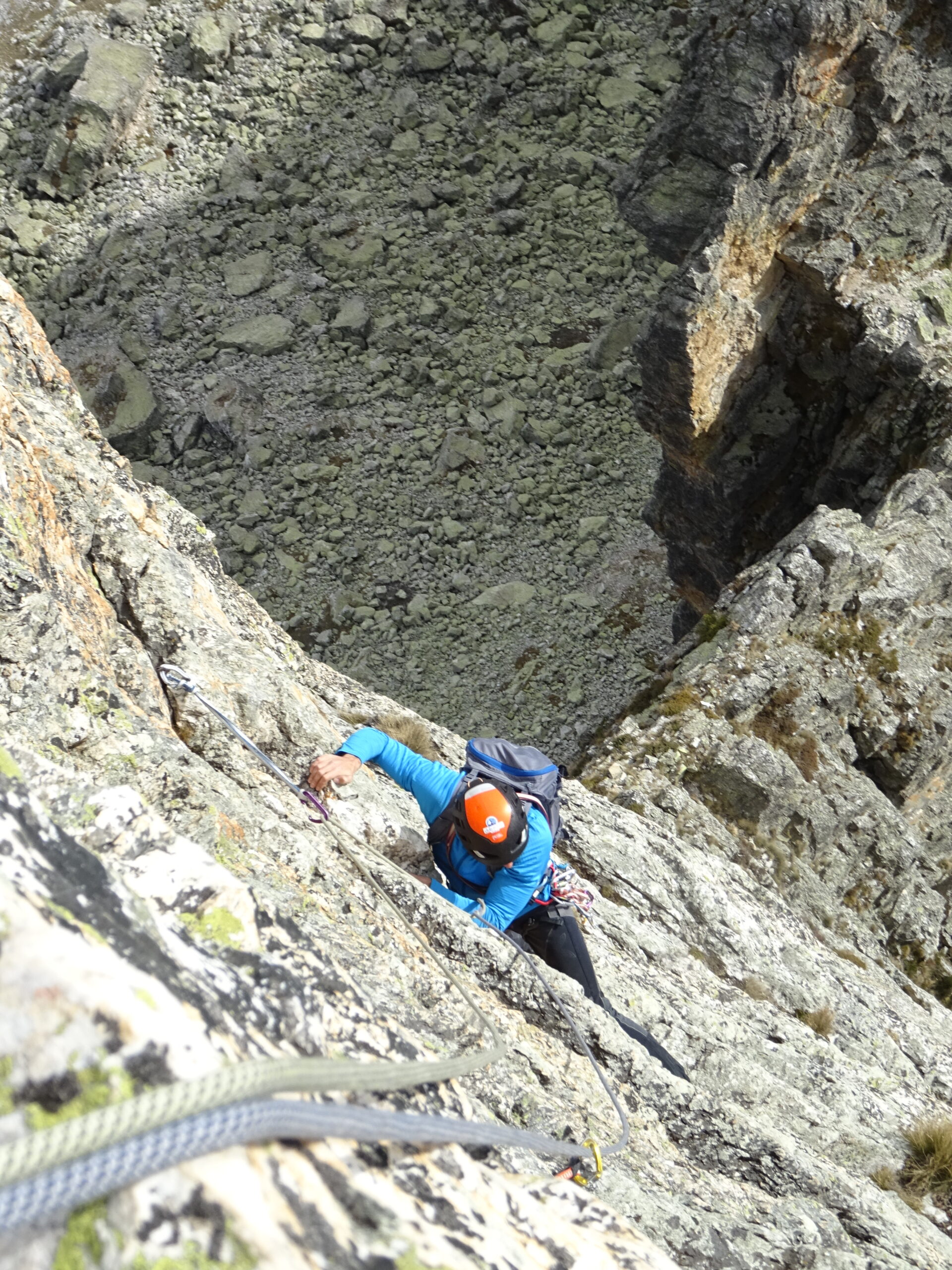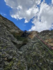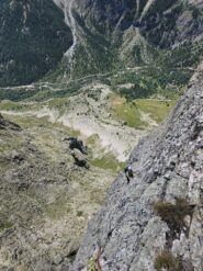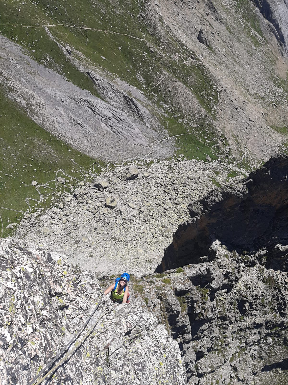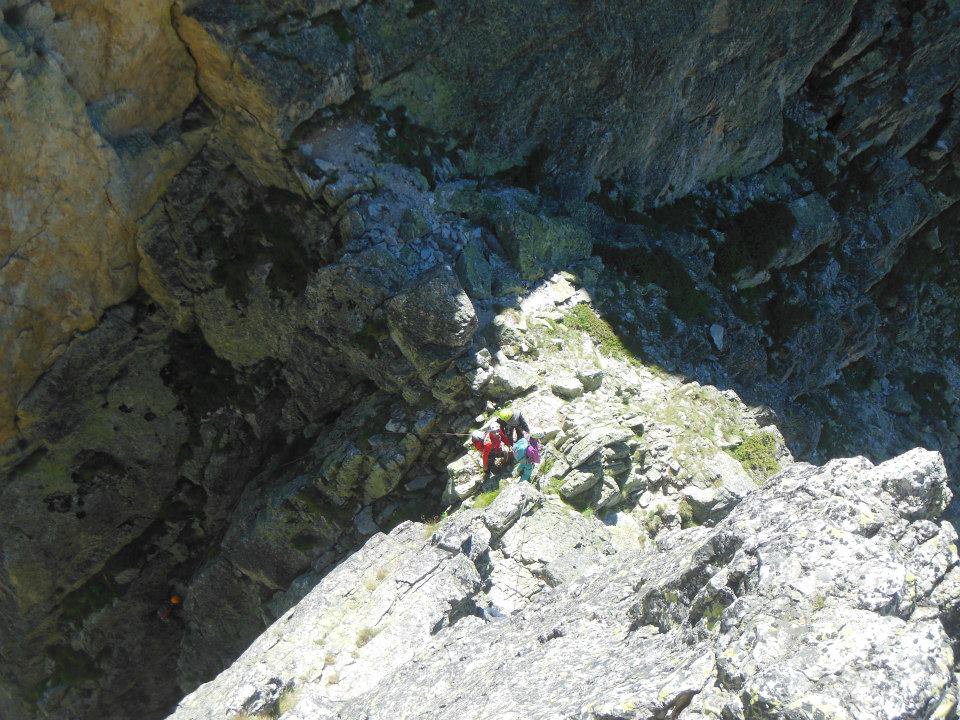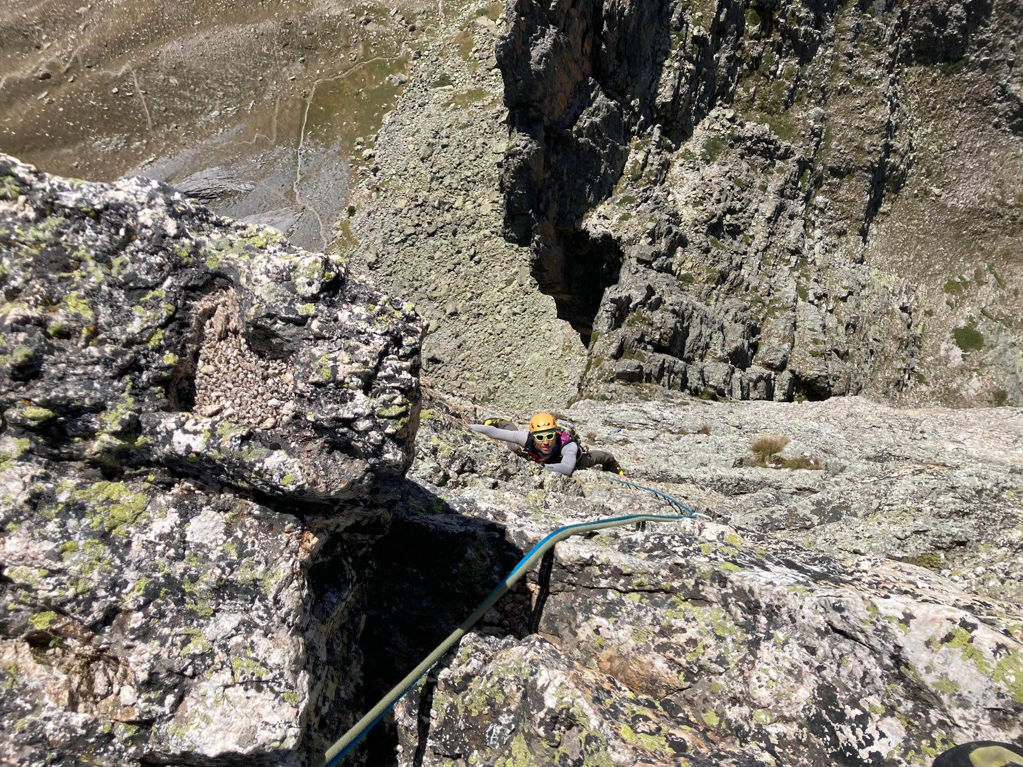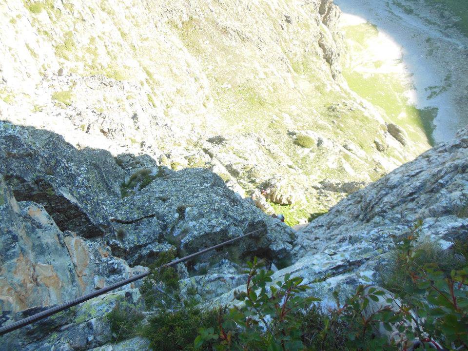 - L3: salire nel camino fino a che non si fa troppo stretto, quindi uscire a destra, passaggio esposto ma protetto da fix. Quindi salire in verticale su rocce più facili seguendo sempre il camino fino ad un esiguo terrazzino di sosta. 30 metri. 5c l’uscita dal camino, poi 5a. Quattro fix.