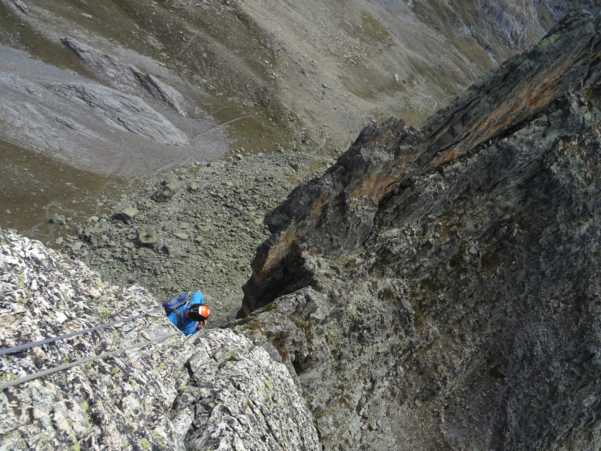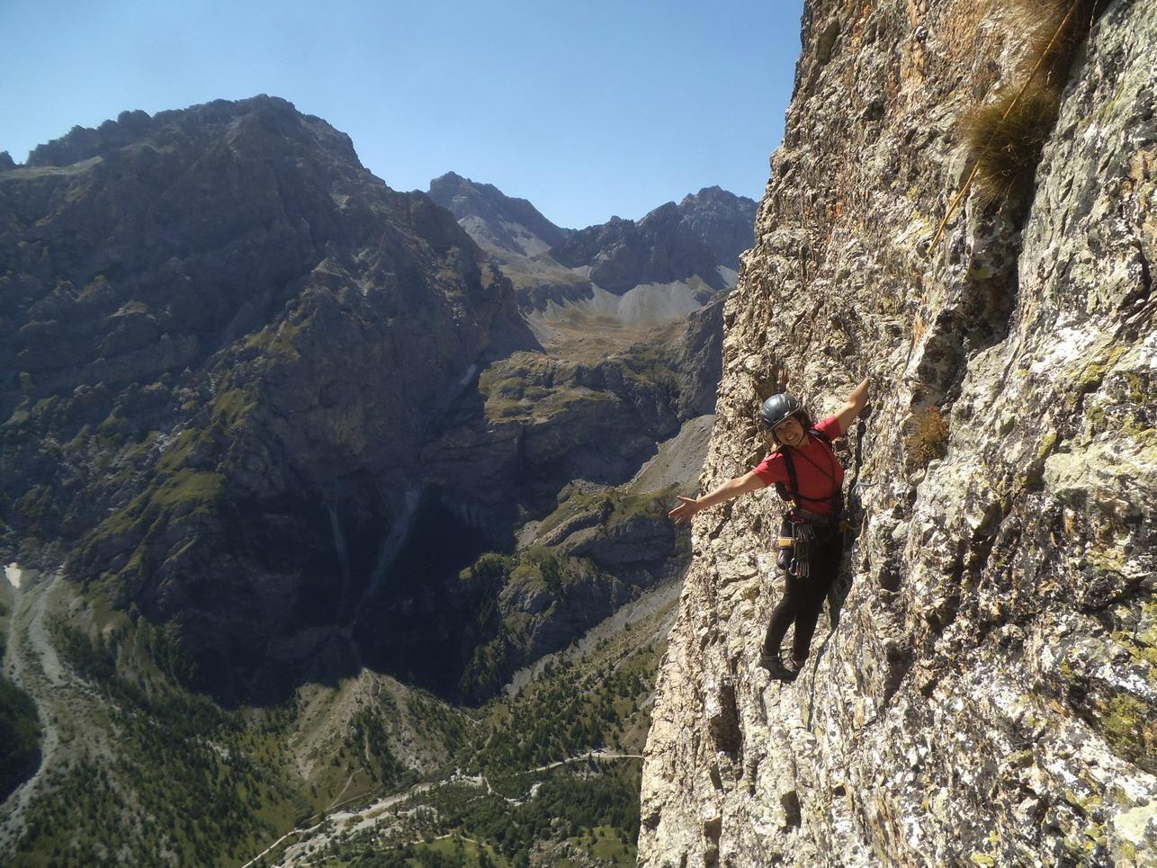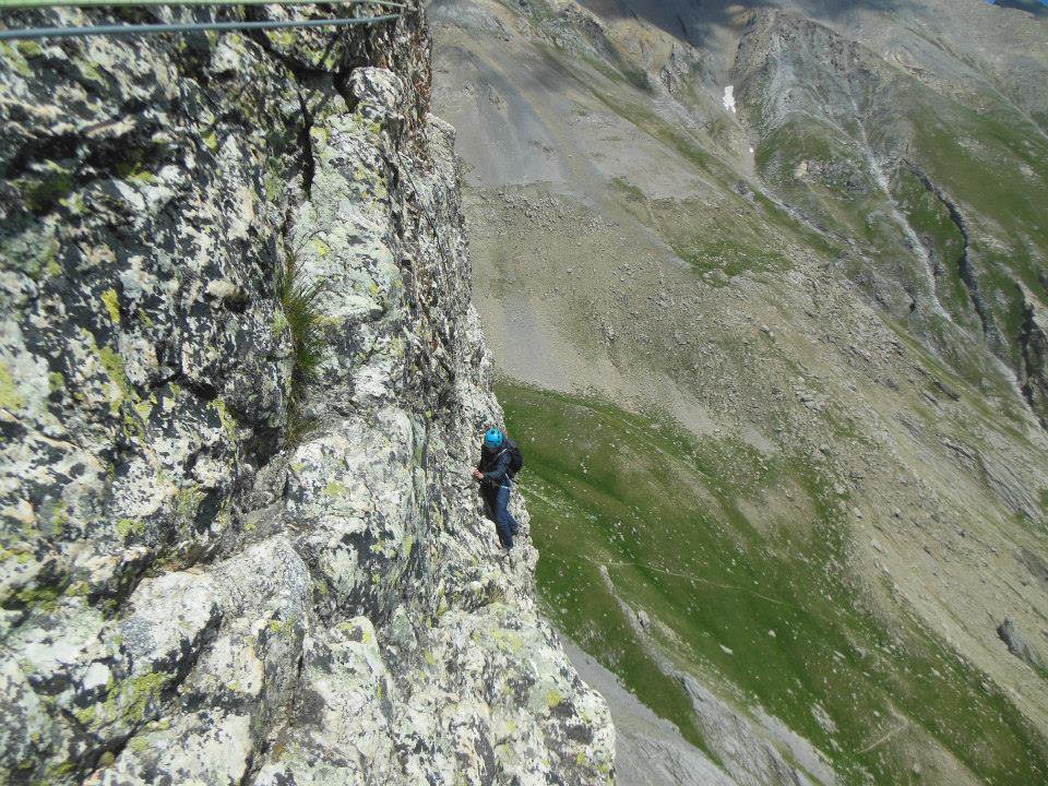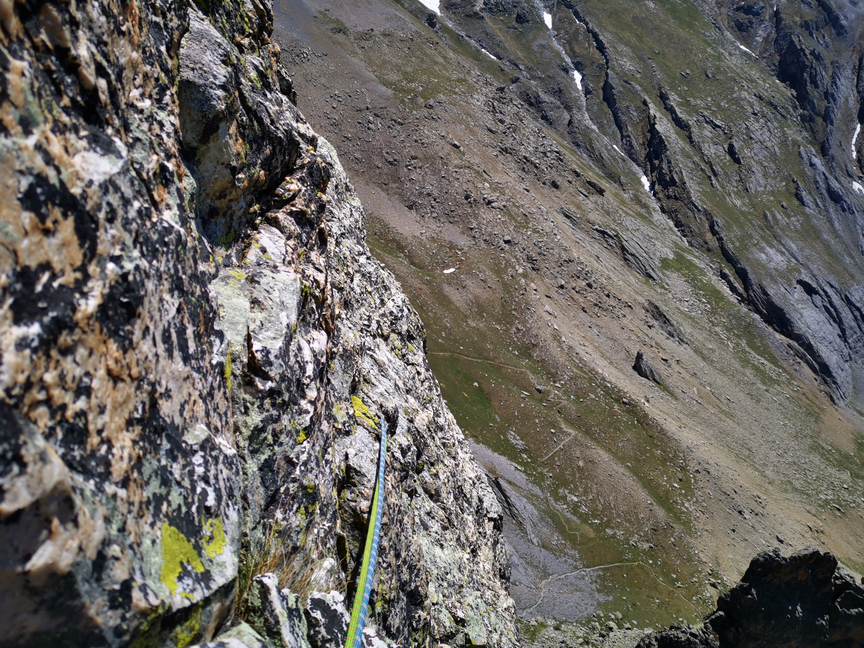 - L3: salire nel camino fino a che non si fa troppo stretto, quindi uscire a destra, passaggio esposto ma protetto da fix. Quindi salire in verticale su rocce più facili seguendo sempre il camino fino ad un esiguo terrazzino di sosta. 30 metri. 5c l’uscita dal camino, poi 5a. Quattro fix.