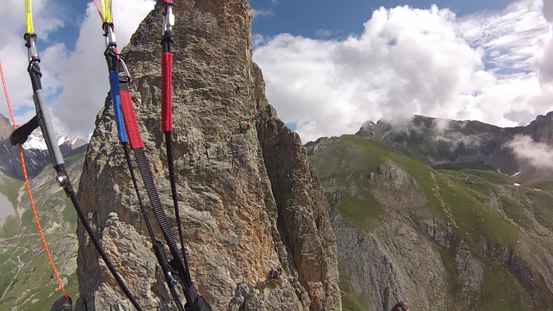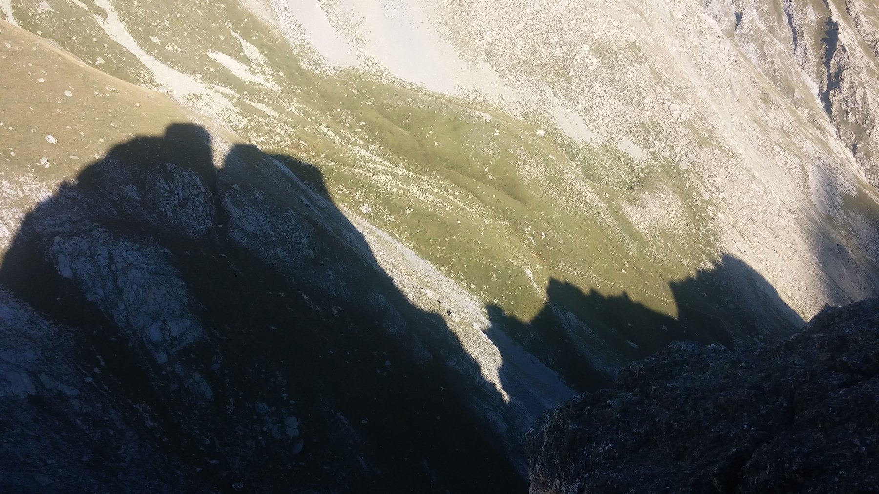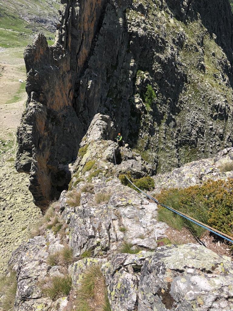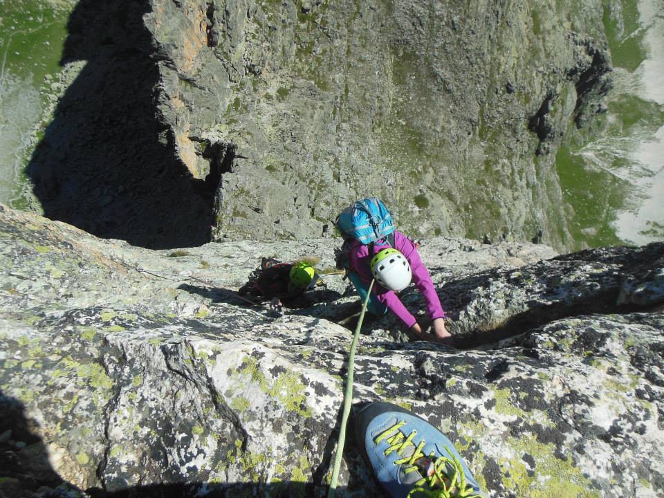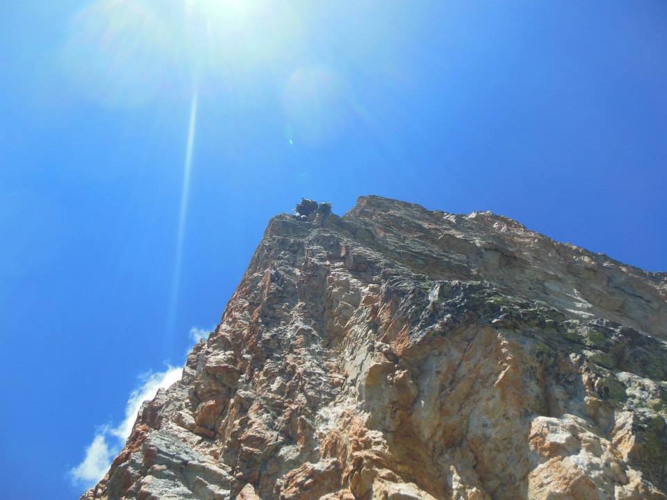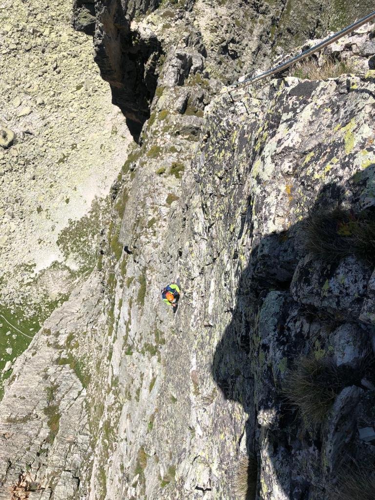 - L3: salire nel camino fino a che non si fa troppo stretto, quindi uscire a destra, passaggio esposto ma protetto da fix. Quindi salire in verticale su rocce più facili seguendo sempre il camino fino ad un esiguo terrazzino di sosta. 30 metri. 5c l’uscita dal camino, poi 5a. Quattro fix.